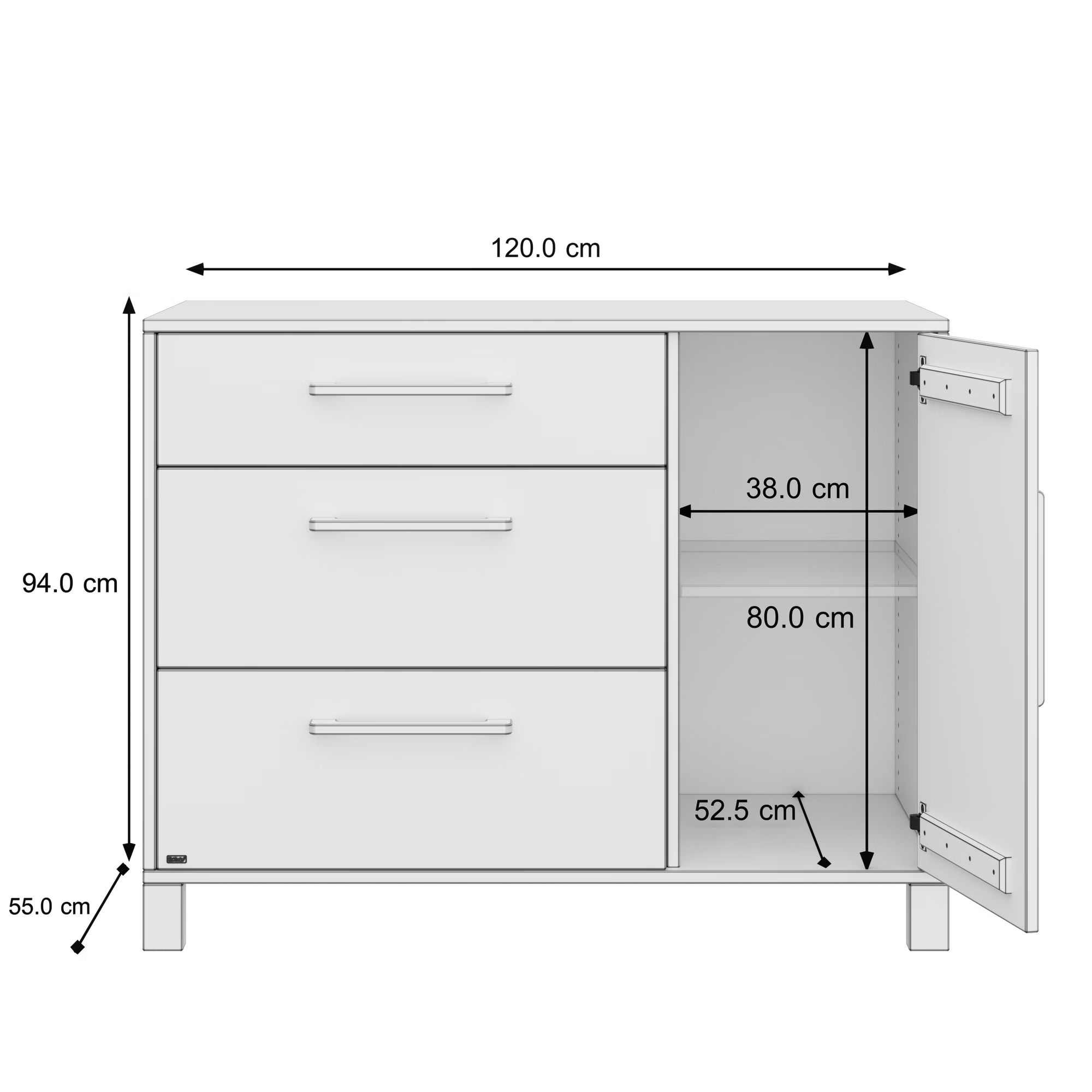 • Außenmaße: B 120 cm × H 94 cm × T 55 cm