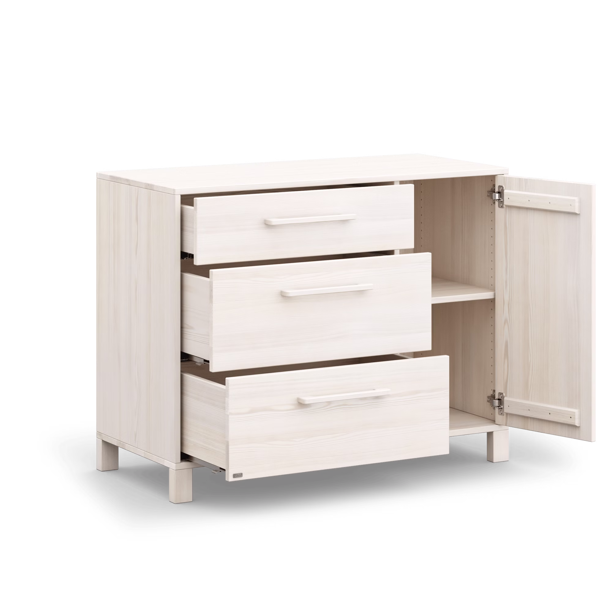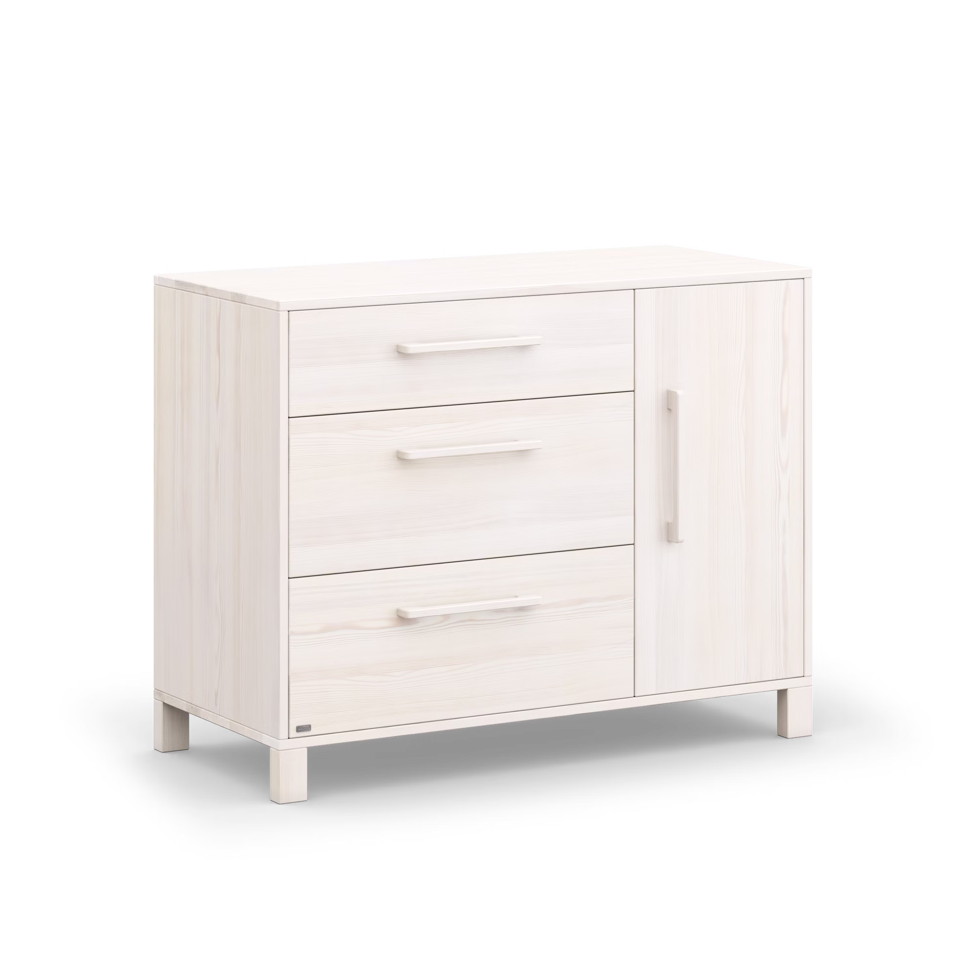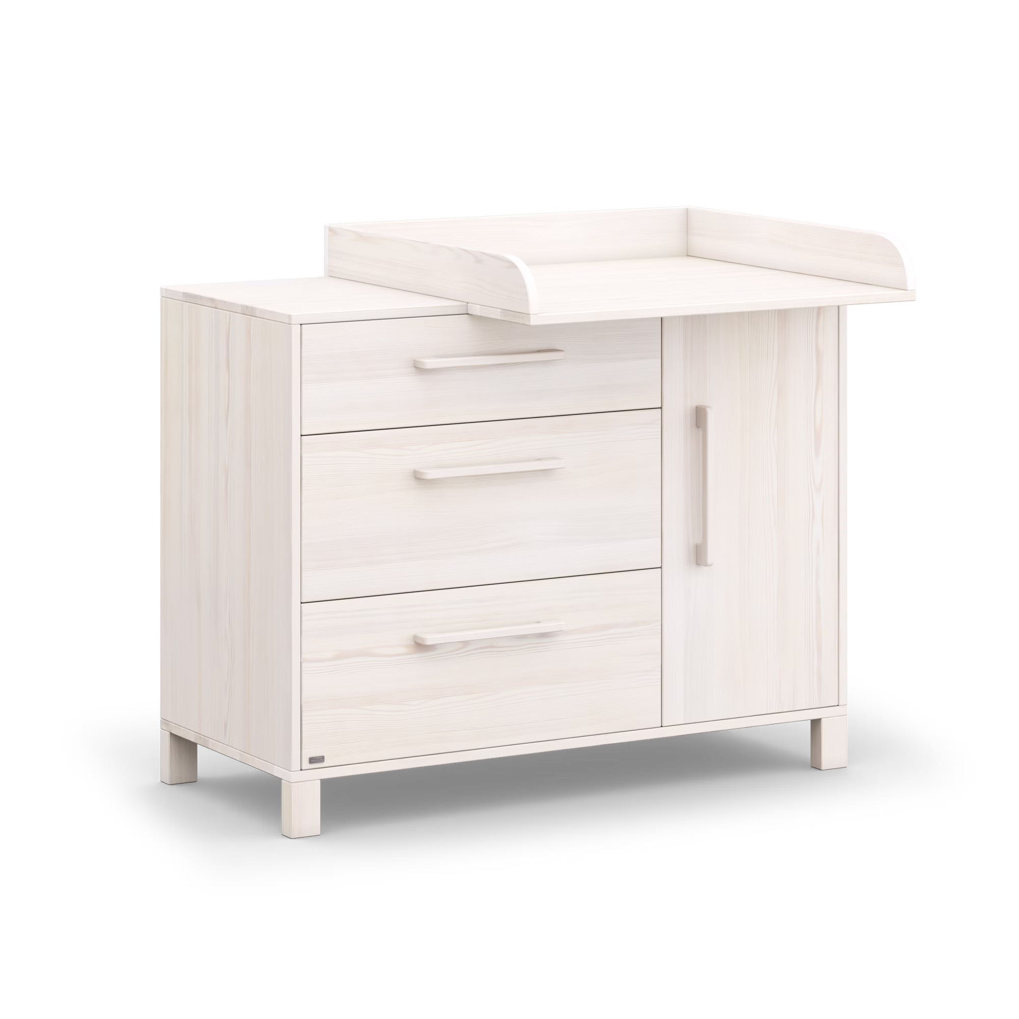 Mit einer Breite von 120 cm bietet Theo besonders viel Stauraum für Kleidung, Bücher oder Spielzeug. Die großen Schubladen sind mit hochwertigen, versteckten Unterflurschienen ausgestattet und schließen dank Soft-Close-Dämpfung sanft und lautlos – Das schützt kleine Finger vor dem Einklemmen und sorgt für einen entspannten Familienalltag. Hinter der Tür verbirgt sich zusätzlicher Stauraum, der sich mithilfe flexibler Einlegeböden individuell anpassen lässt. Der optional erhältliche Wickelaufsatz macht die Kommode bei Bedarf zur praktischen Theo Wickelkommode und lässt sich später einfach wieder abnehmen.