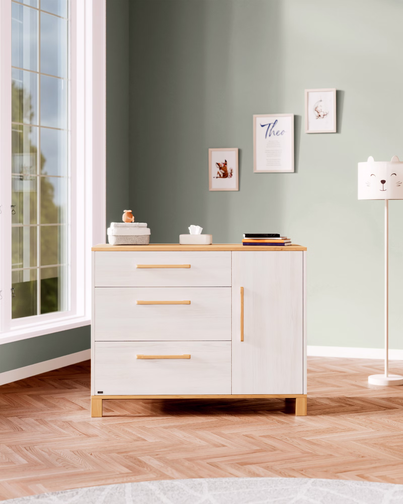 Die Theo Kommode überzeugt mit natürlichen Materialien, hochwertiger Verarbeitung und funktionalen Extras für den Familienalltag:
