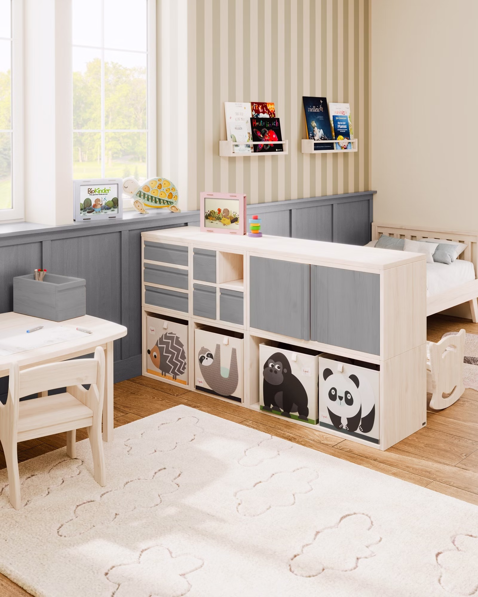 Unser Laura Regalwürfel mit Schiebetüren wird aus Bio-Massivholz gefertigt und sorgt schnell für Ordnung. Kombiniert mit unseren offenen und geschlossenen Regalwürfeln ergeben sich so individuell gestaltete Regale, Kommoden und Raumtrenner, die jedes Kinderzimmer harmonisch ergänzen und dabei auch in Dachschrägen passen.