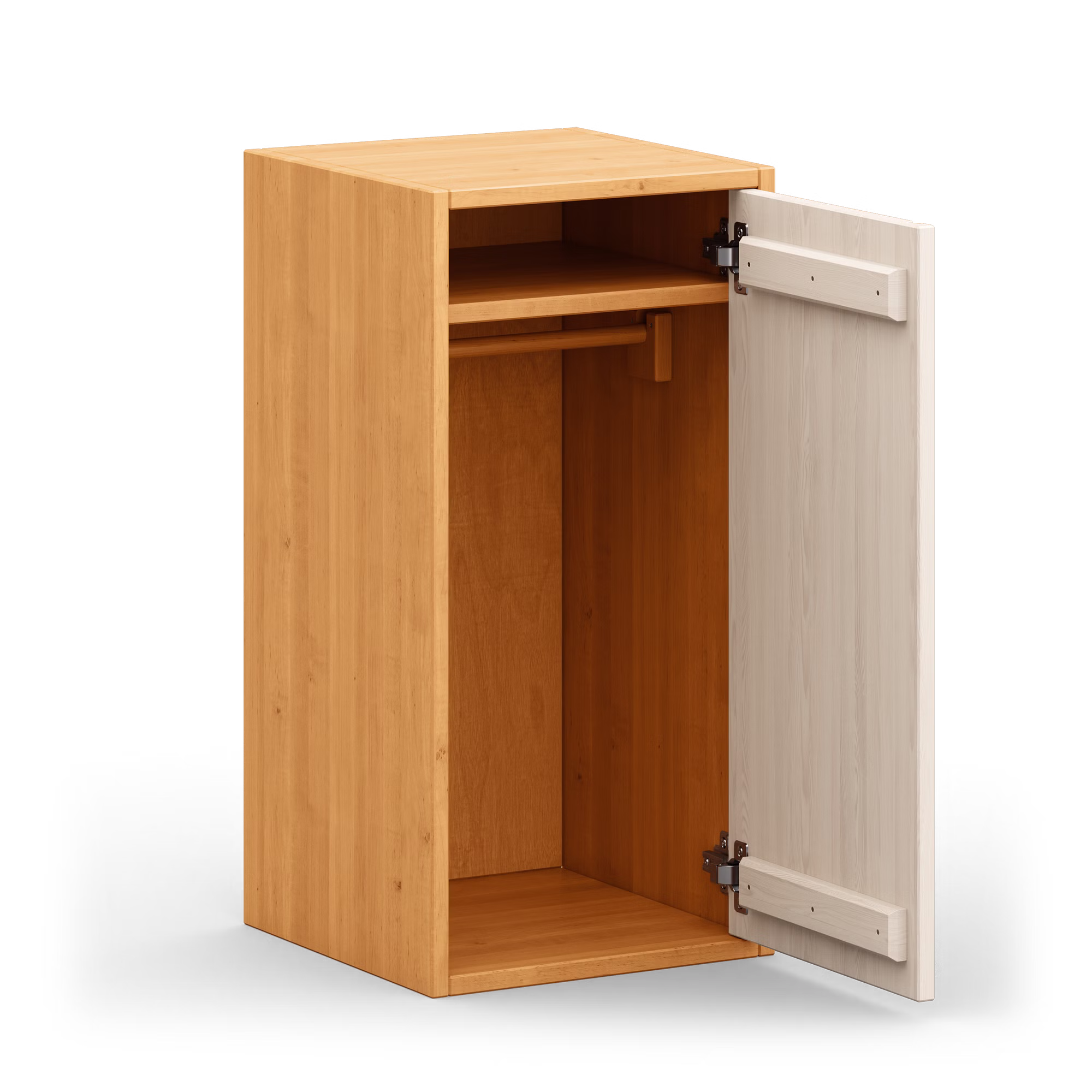 Der hohe Laura Regalwürfel mit Tür ist mit einer Kleiderstange und einem flexiblen Einlegeboden für bessere Übersichtlichkeit ausgestattet. So eignet er sich ideal als Kinderkleiderschrank, aber auch Puppenschrank in der Puppenecke. Der Regalwürfel kann mit dem passenden Laura Sockel ergänzt werden. Sockel nicht im Lieferumfang enthalten.