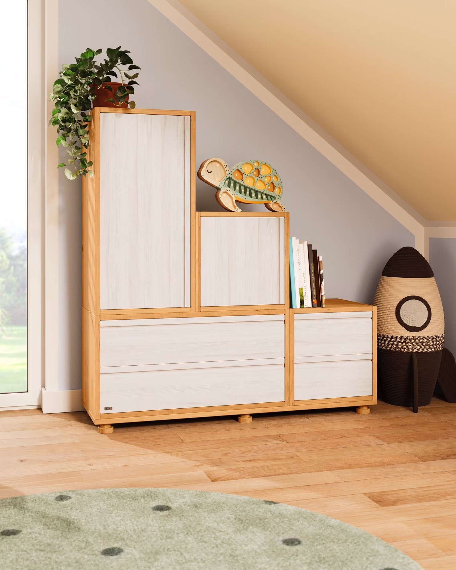 Unser hoher Laura Regalwürfel mit Tür wird aus Bio-Massivholz gefertigt und kann vielfältig eingesetzt werden. Kombiniert mit unseren offenen und geschlossenen Laura Regalelementen entstehen so individuell zusammengestellte Regale, Kommoden und Raumtrenner, die auch gut in Dachschrägen passen und so jedes Kinderzimmer perfekt ergänzen.