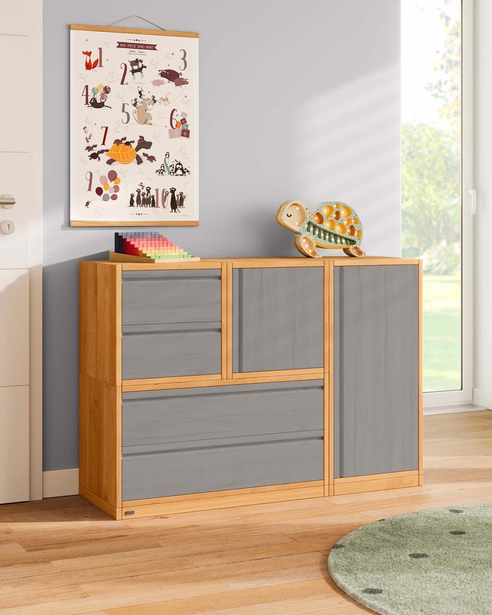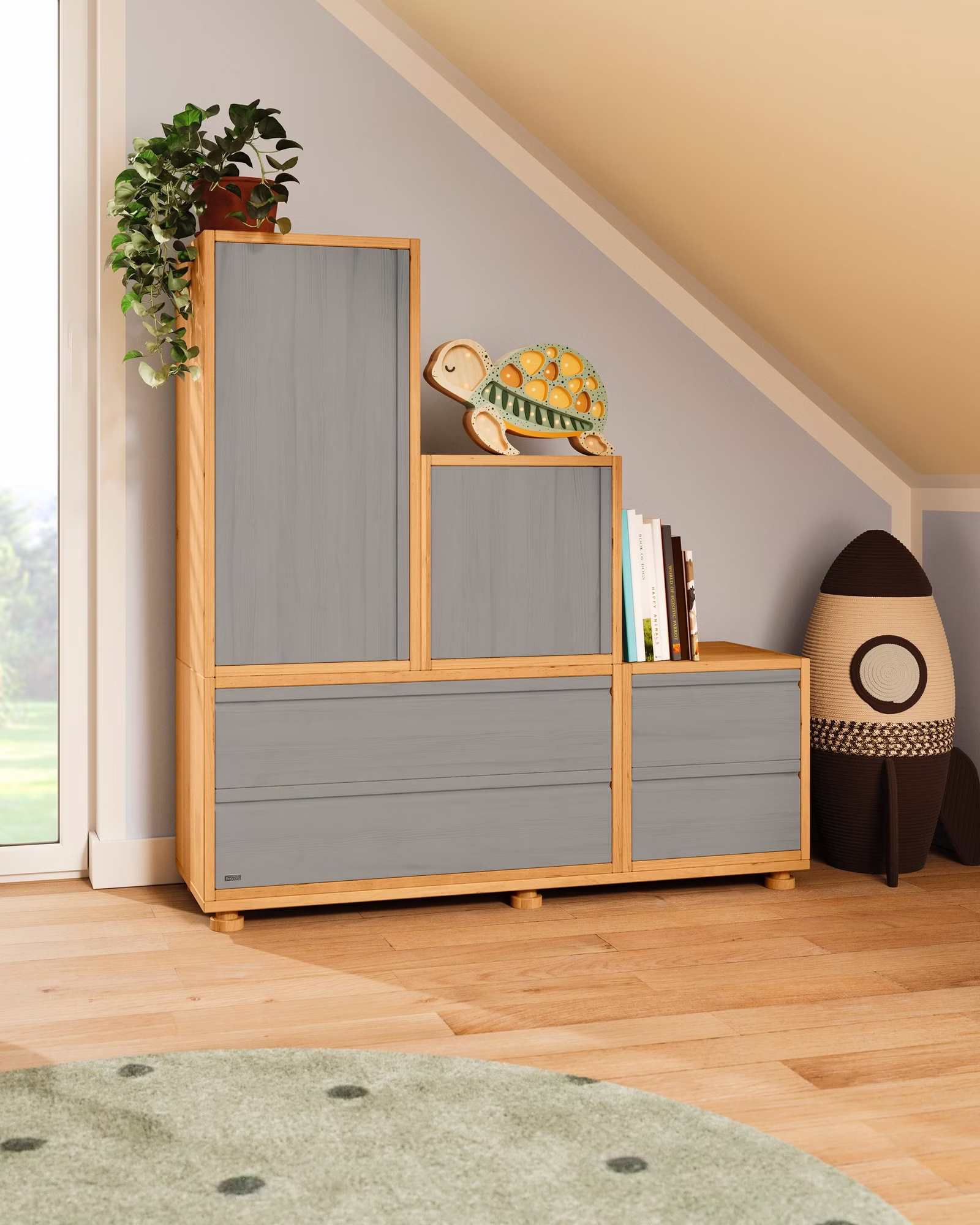 Unser hoher Laura Regalwürfel mit Tür wird aus Bio-Massivholz gefertigt und kann vielfältig eingesetzt werden. Kombiniert mit unseren offenen und geschlossenen Laura Regalelementen entstehen so individuell zusammengestellte Regale, Kommoden und Raumtrenner, die auch gut in Dachschrägen passen und so jedes Kinderzimmer perfekt ergänzen.