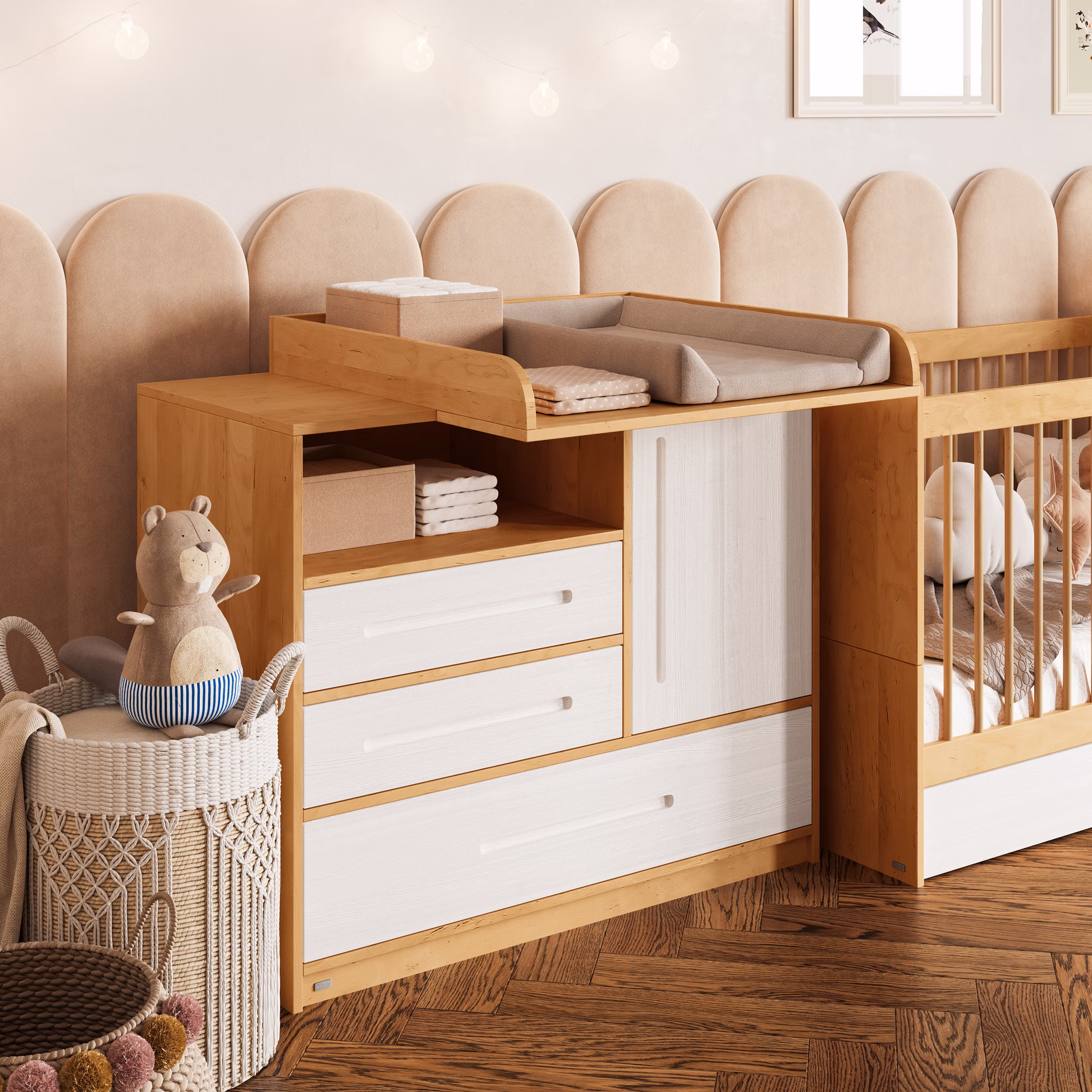 Unsere geräumige Lina Kommode ist aus ökologischem Vollholz gefertigt und kann leicht mit unserem passenden Lina Wickelaufsatz ergänzt werden. Das offene Regalfach direkt unterhalb der Oberseite ermöglicht dabei einen schnellen Zugriff auf Windeln, weitere Pflegeutensilien und andere Gegenstände.