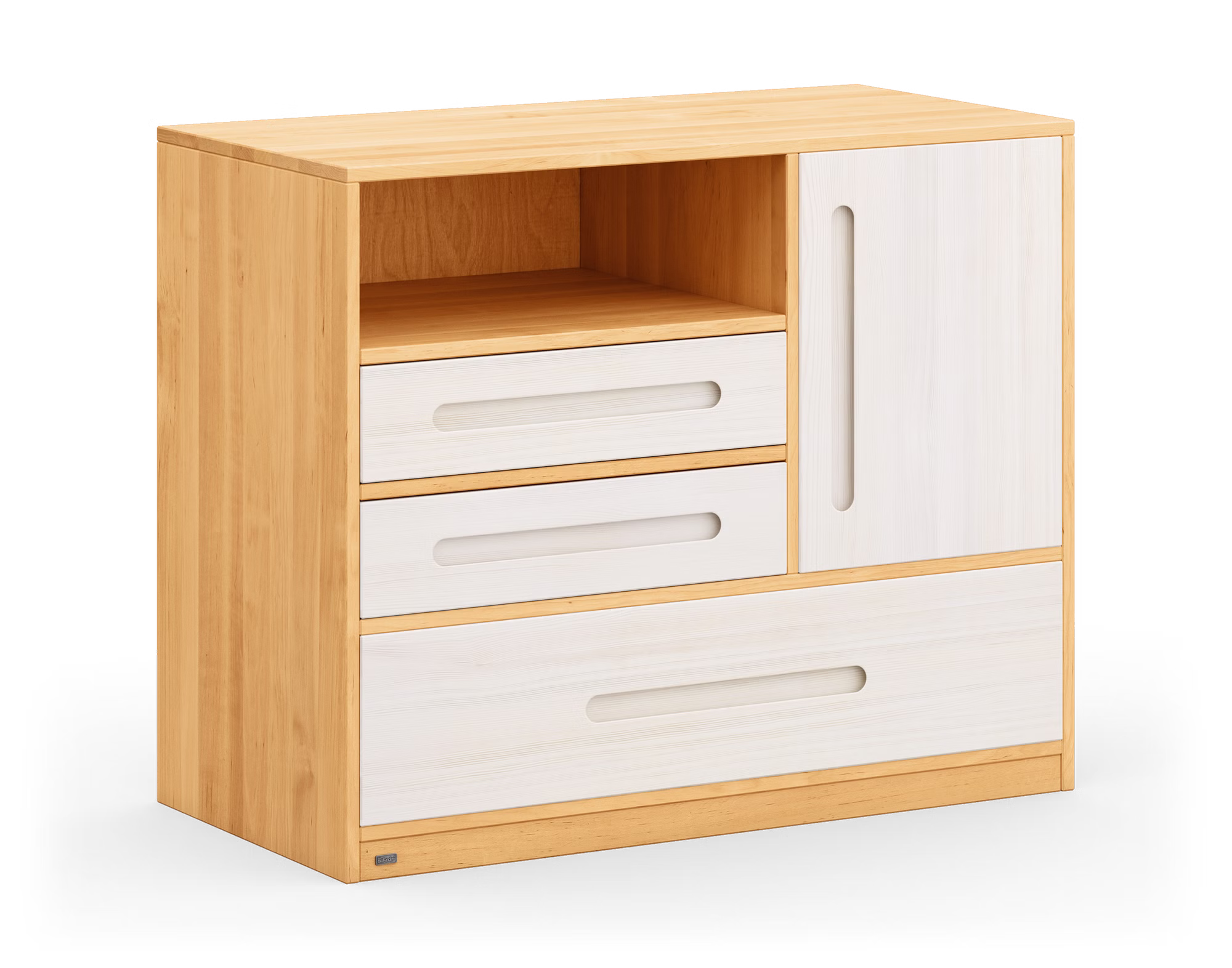 Auch einzeln lässt sich unsere Lina Kommode dank der zeitlosen, elegant-gefrästen Griffmulden harmonisch in die bestehende Einrichtung einfügen und dient zur Aufbewahrung von Kleidung, Spielsachen und weiteren Gegenständen.