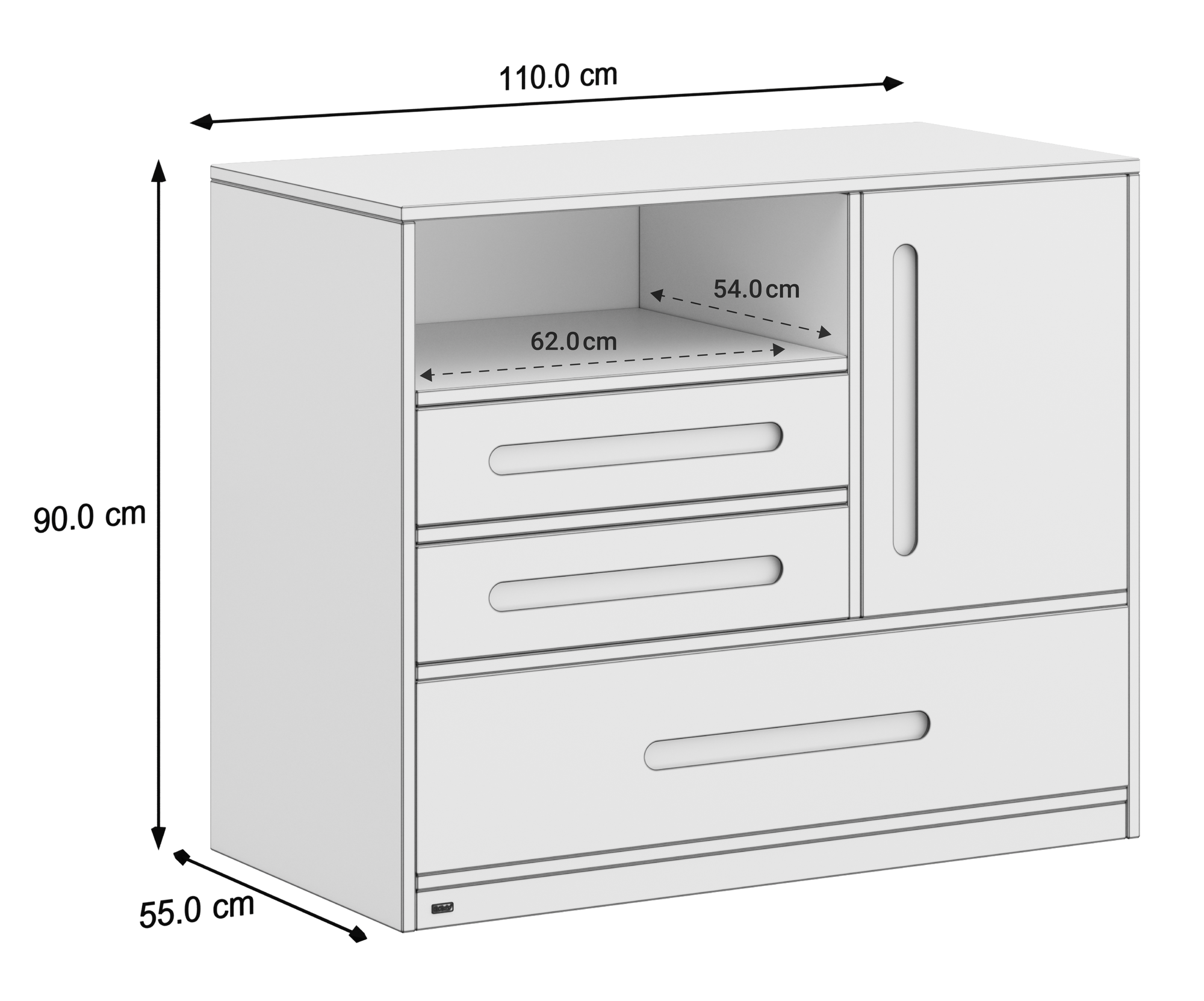 Auch einzeln lässt sich unsere Lina Kommode dank der zeitlosen, elegant-gefrästen Griffmulden harmonisch in die bestehende Einrichtung einfügen und dient zur Aufbewahrung von Kleidung, Spielsachen und weiteren Gegenständen.