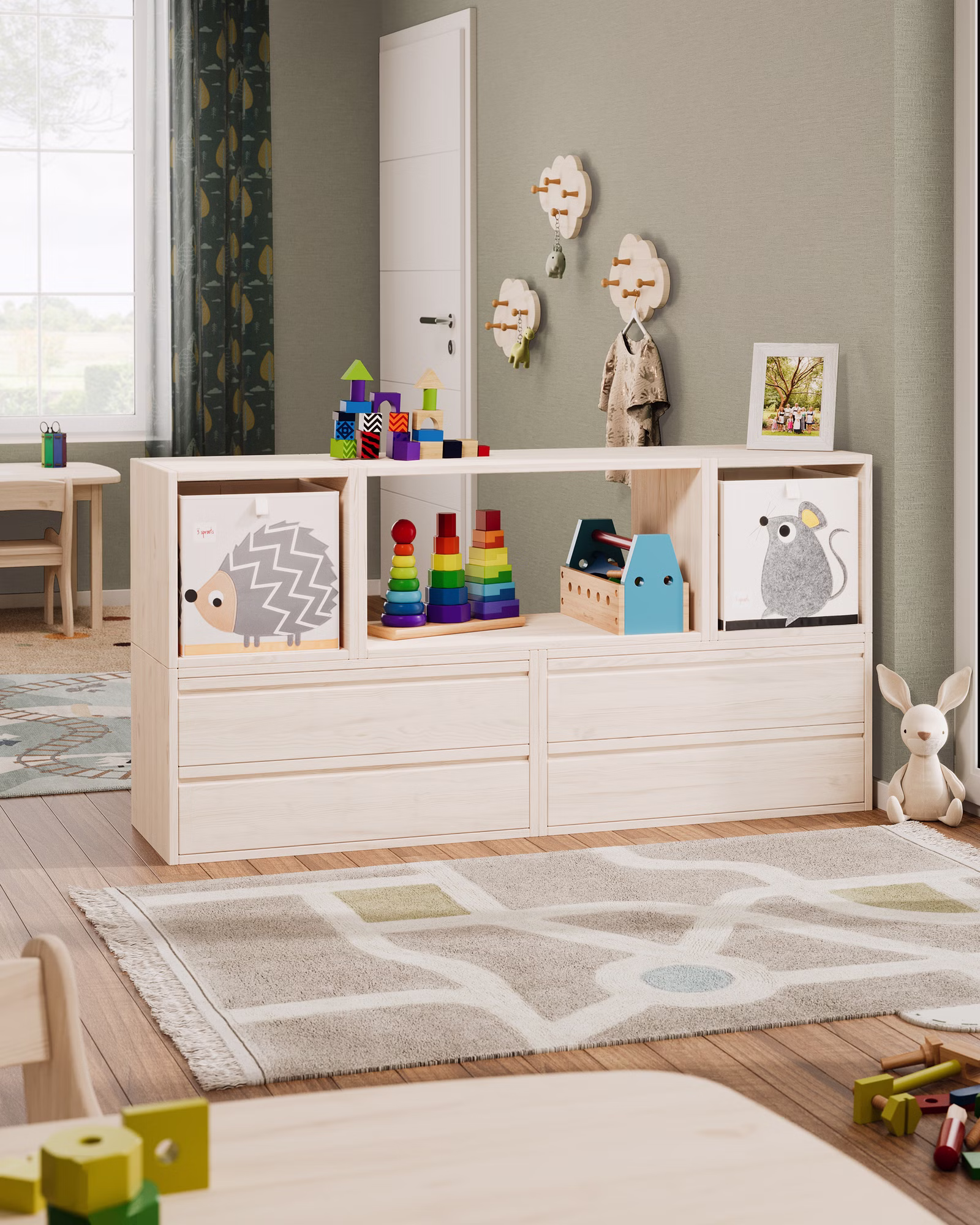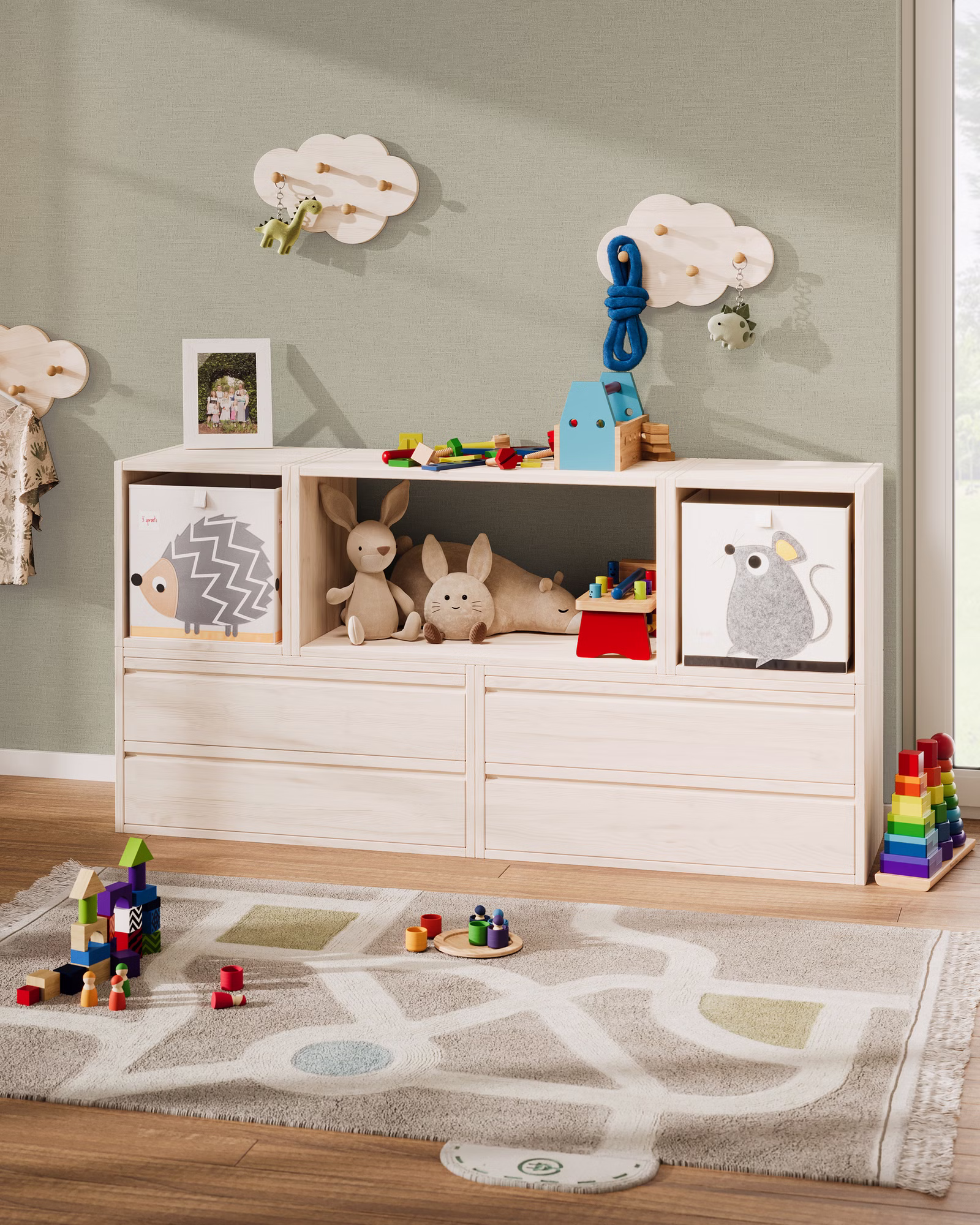 Das geräumige Spielregal mit einer Breite von 160 cm bietet viel Platz für Spielzeug, Bücher und kreative Werke. Mit einer komfortablen Höhe von 80 cm eignet es sich perfekt als Spielfläche und zur Aufbewahrung. In den vier praktischen Schubladen lassen sich Bausteine, Fahrzeuge und andere kleine Schätze ordentlich verstauen, während die drei offenen Fächer genügend Platz für Lieblingsspielzeug und Dekoration bieten.