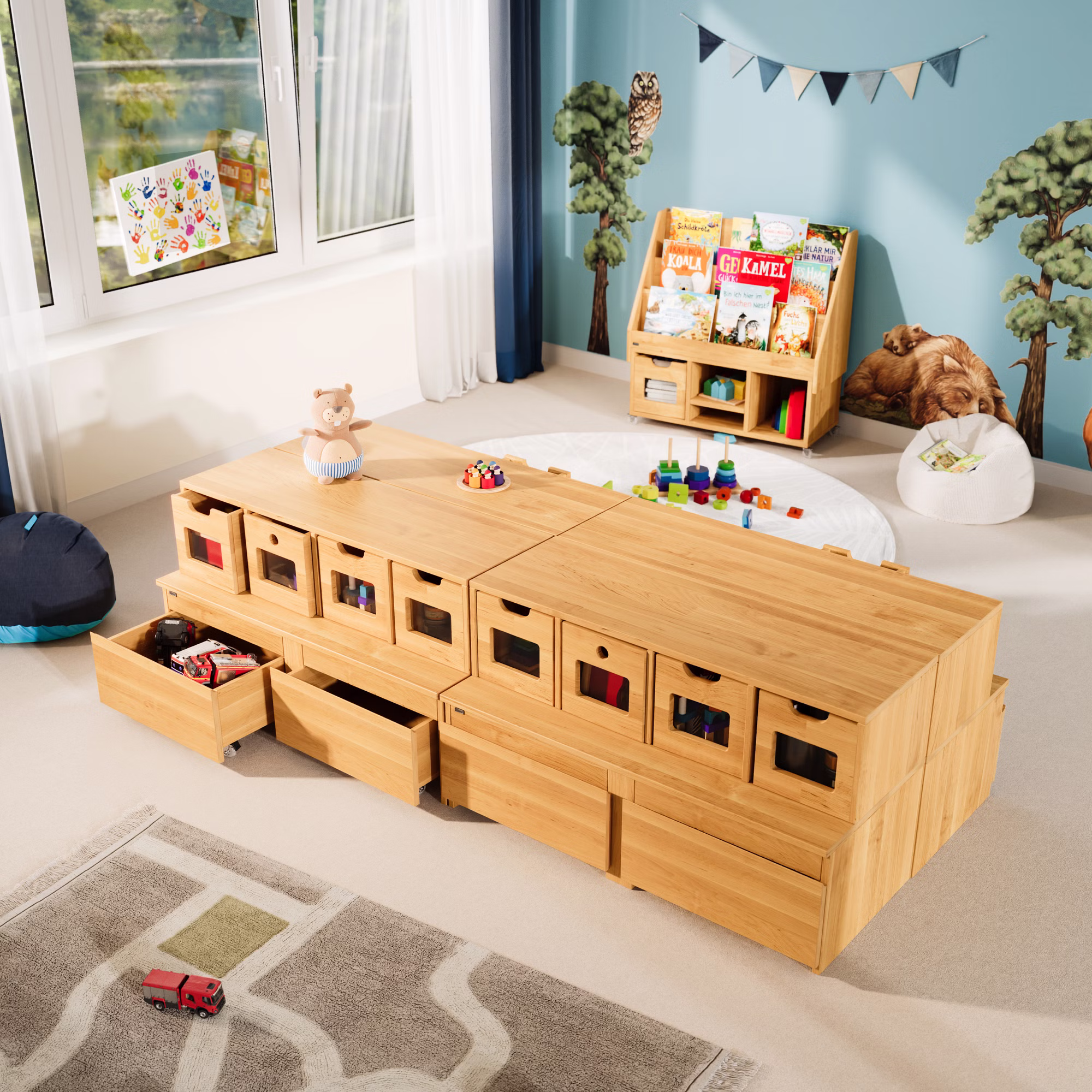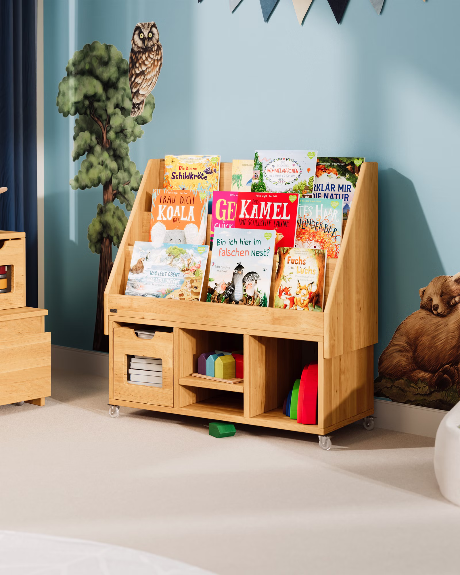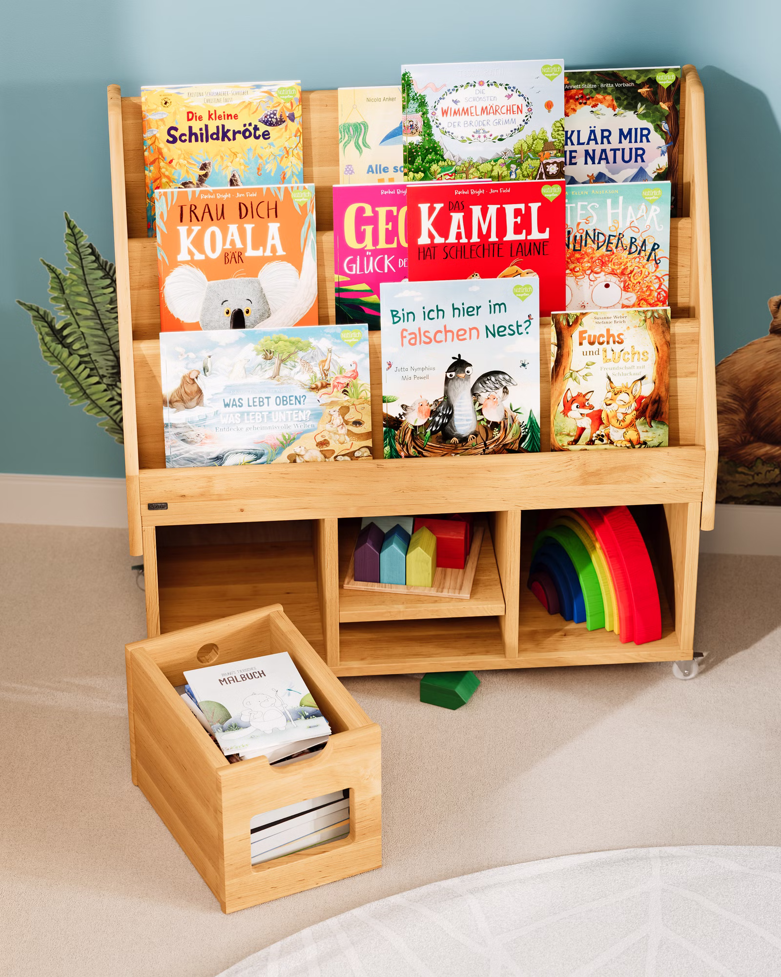 Diese durchdachte Regalkombination eignet sich ideal, um Bücher, Bastelsachen oder Spielzeug flexibel von Raum zu Raum zu transportieren. Kombiniert mit den Robin Ordnungsboxen oder passenden Regalschubläden entsteht zusätzlicher Stauraum – für mehr Ordnung und Übersicht im Kinderzimmer oder im Kita-Alltag.