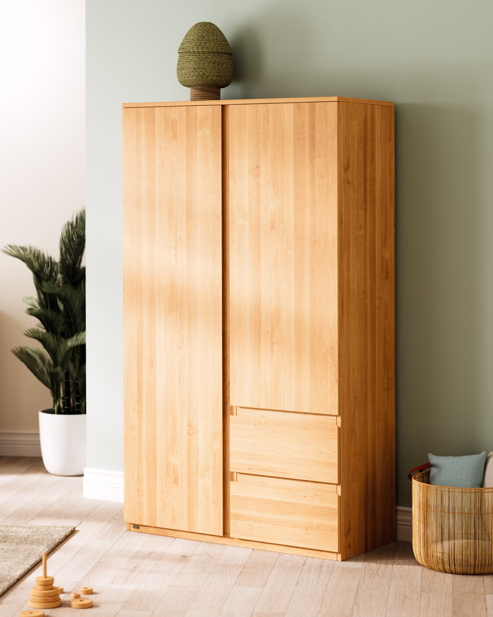 Unser Kleiderschrank Finn bietet großzügigen Stauraum und verbindet Funktionalität mit ansprechendem Design. Ob im Kinderzimmer oder auch im Wohn- oder im Eltern-Schlafzimmer, der Kleiderschrank aus 100% Bio-Massivholz fügt sich harmonisch in jedes Raumkonzept ein. Seine klare Linienführung und die schöne Maserung des Holzes auf den breiten Fronten verleihen jedem Raum eine besondere Note.