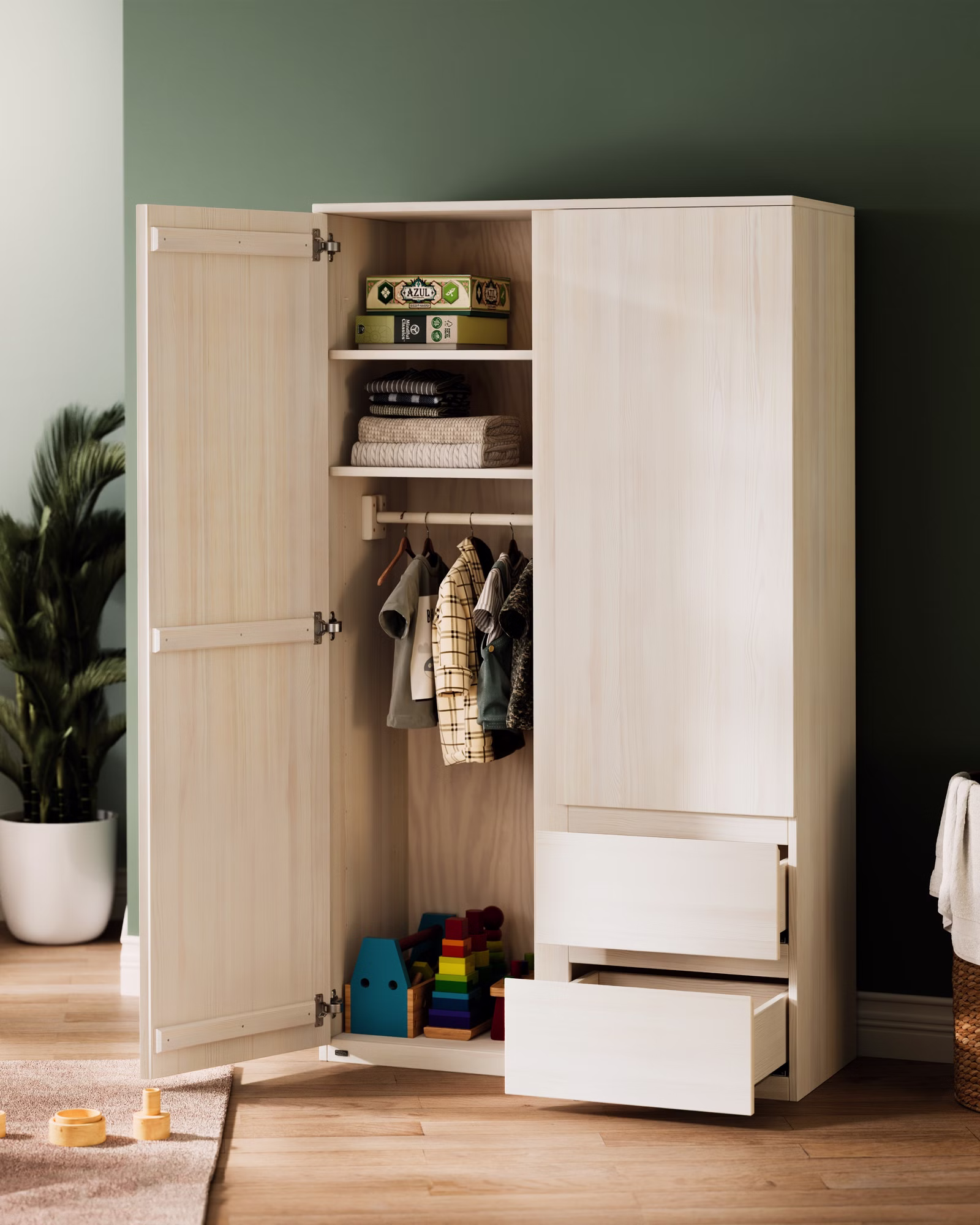 Unser Kleiderschrank Finn bietet großzügigen Stauraum und verbindet Funktionalität mit ansprechendem Design. Ob im Kinderzimmer oder auch im Wohn- oder im Eltern-Schlafzimmer, der Kleiderschrank aus 100% Bio-Massivholz fügt sich harmonisch in jedes Raumkonzept ein. Seine klare Linienführung und die schöne Maserung des Holzes auf den breiten Fronten verleihen jedem Raum eine besondere Note.