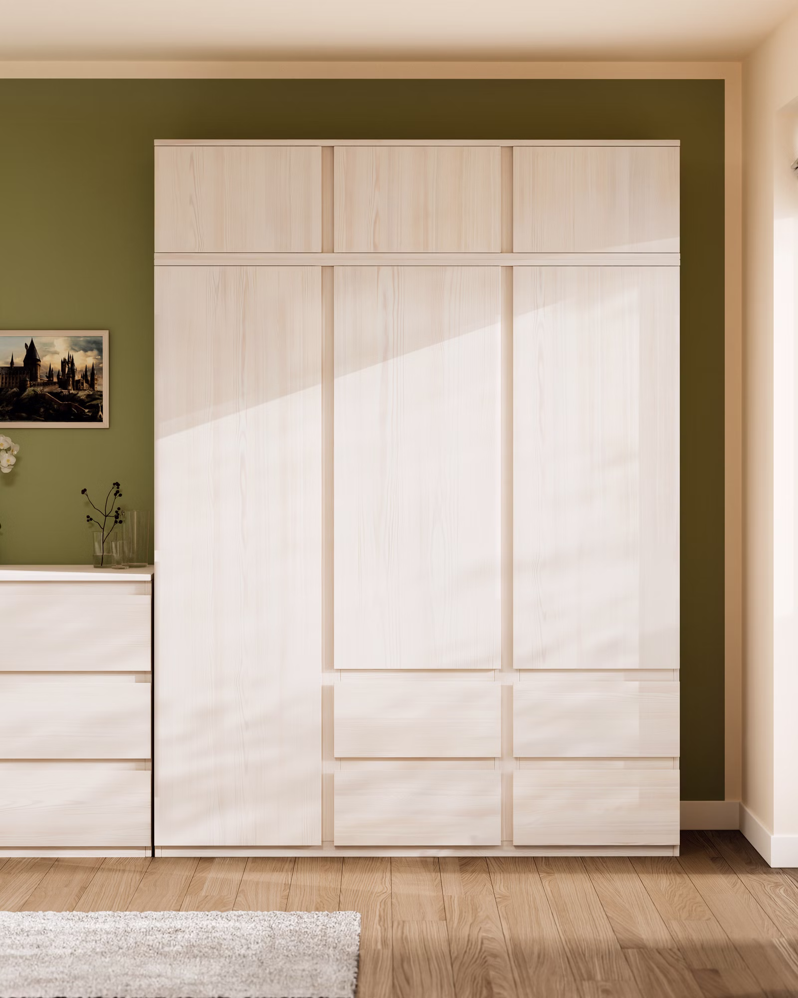 Kombiniert mit dem Finn Kleiderschrank ergibt sich eine Gesamthöhe von 228 cm, so entsteht leicht noch mehr Stauraum.