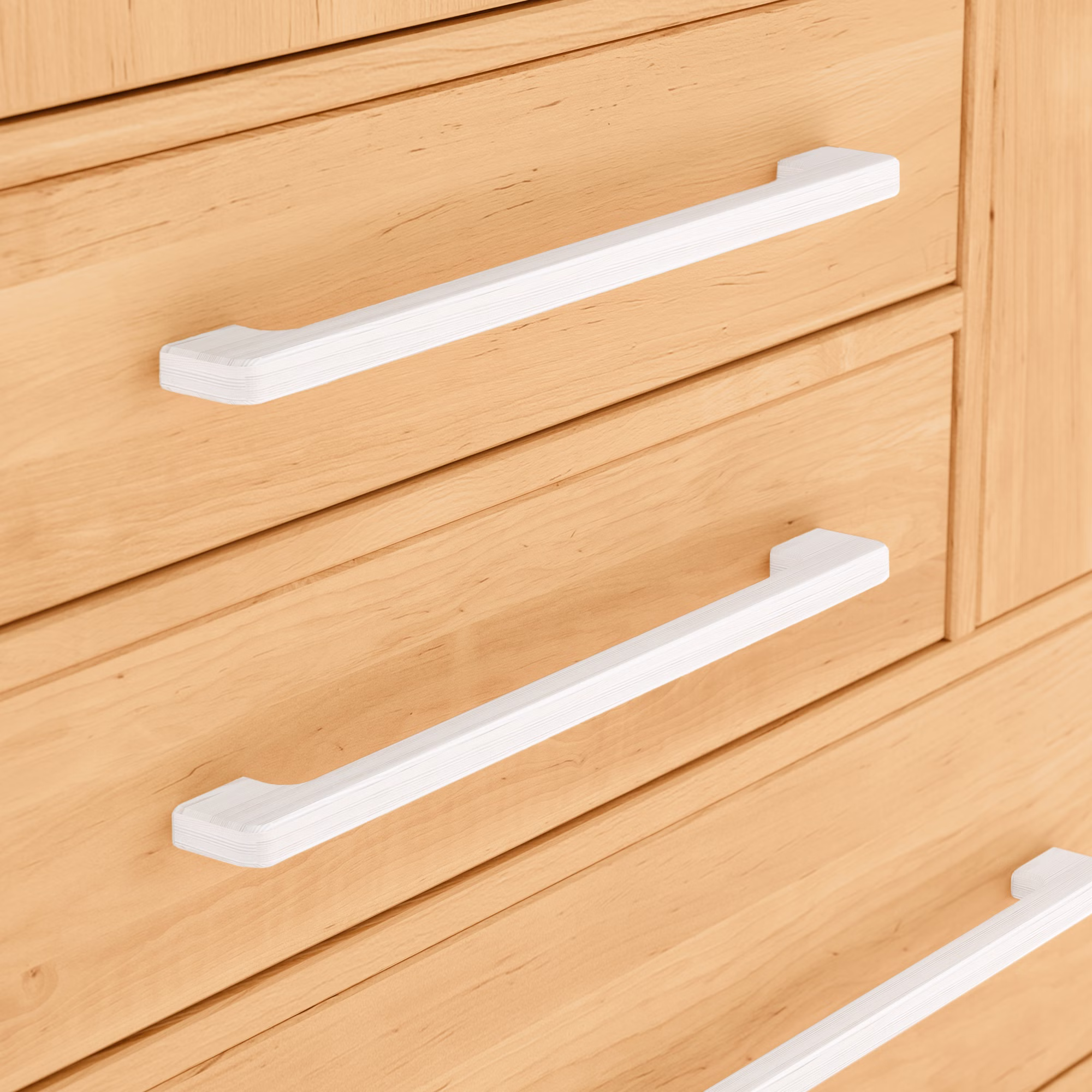 Unser Henry Kleiderschrank ist aus ökologischem Vollholz gefertigt und fällt durch sein modernes, geometrisches Design und die eleganten, gefrästen Griffmulden auf. Der Schrank bietet eine gut durchdachte Einteilung mit: