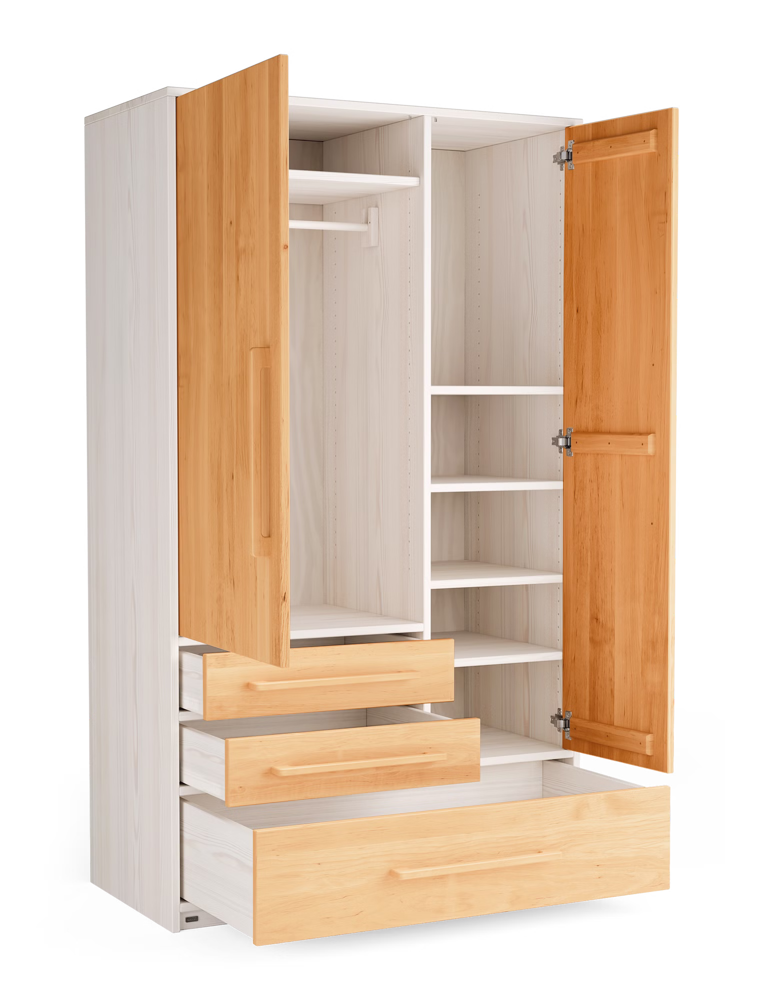 Unser Henry Kleiderschrank ist aus ökologischem Vollholz gefertigt und fällt durch sein modernes, geometrisches Design und die eleganten, gefrästen Griffmulden auf. Der Schrank bietet eine gut durchdachte Einteilung mit: