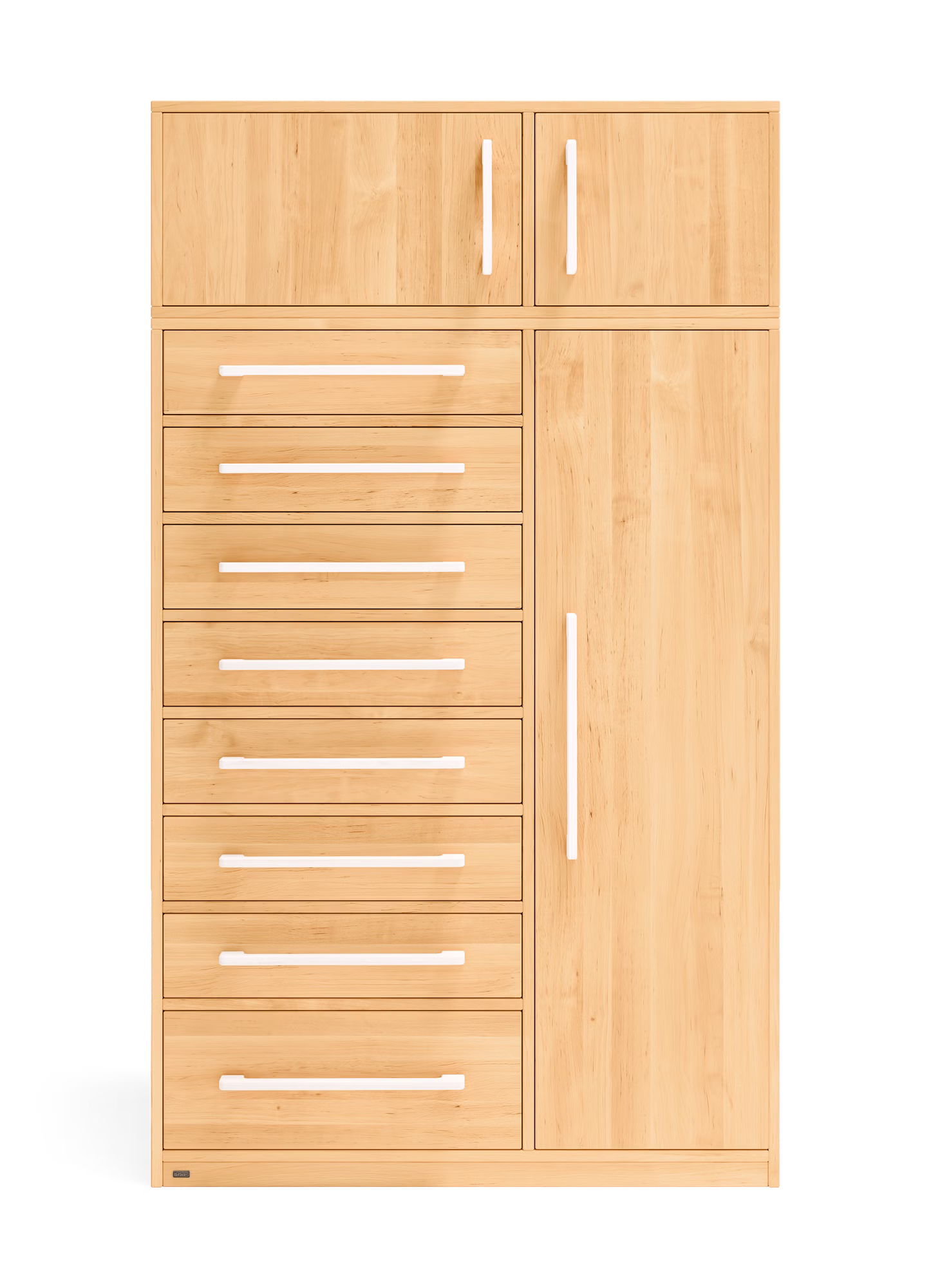 Unser Henry Kommodenschrank findet in jedem Kinder- und Schlafzimmer, aber auch im Flur als Garderobenschrank Platz. Die acht leichtlaufenden Schubladen des Kommodenschranks sind mit Selbsteinzug und Soft-Close-Mechanismus für sicheres und geräuscharmes Schließen ausgestattet. Zudem lassen sie sich voll ausziehen und bieten so einen einfachen Einblick bis in den hintersten Bereich der Schubkästen.