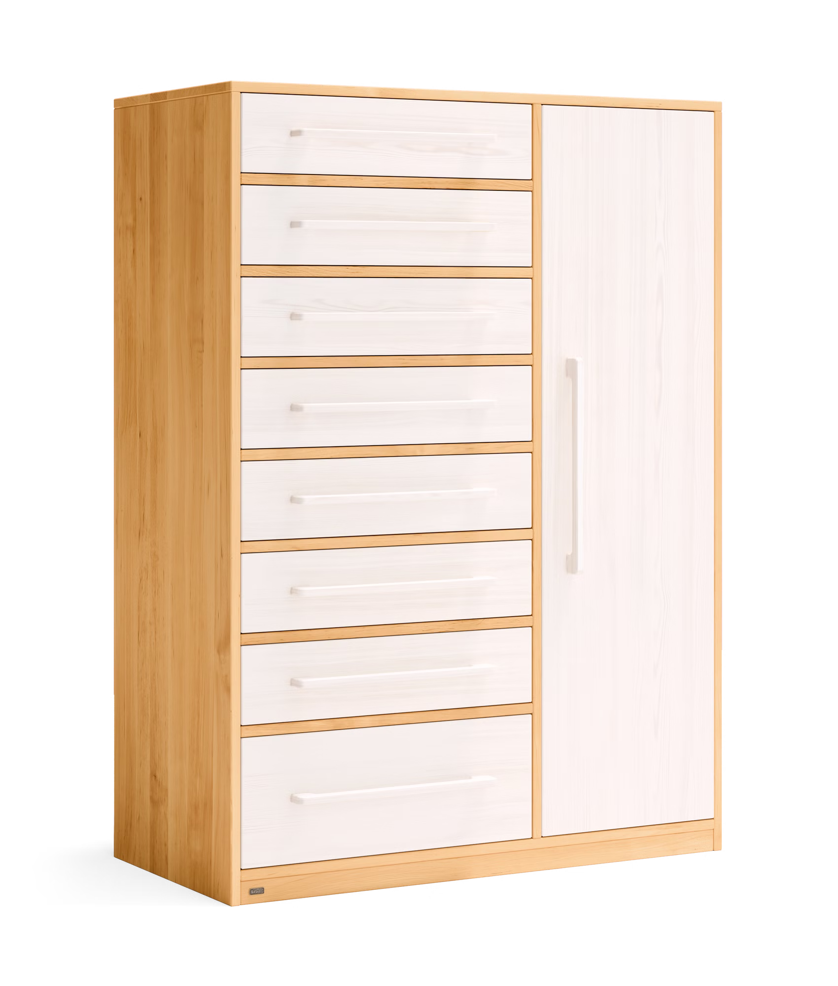 Unser Henry Kommodenschrank findet in jedem Kinder- und Schlafzimmer, aber auch im Flur als Garderobenschrank Platz. Die acht leichtlaufenden Schubladen des Kommodenschranks sind mit Selbsteinzug und Soft-Close-Mechanismus für sicheres und geräuscharmes Schließen ausgestattet. Zudem lassen sie sich voll ausziehen und bieten so einen einfachen Einblick bis in den hintersten Bereich der Schubkästen.