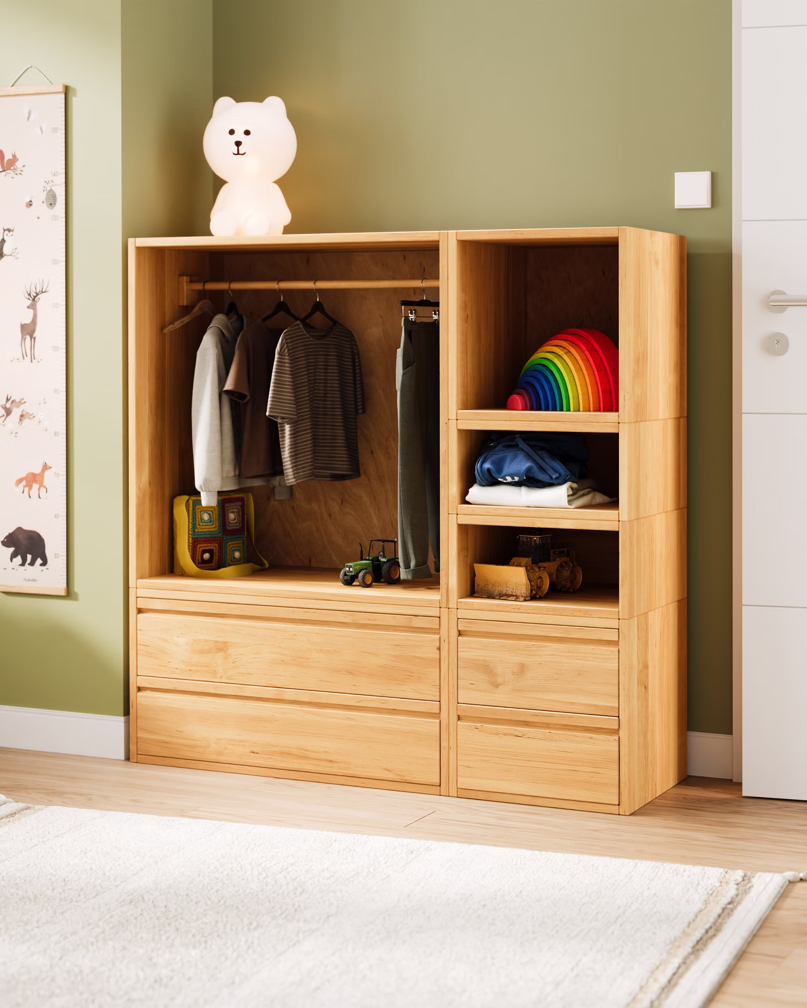 Durch seine sanfte Holzstruktur und das natürliche Design entsteht eine warme, beruhigende Atmosphäre. Der Schrank fügt sich harmonisch in jedes Kinderzimmer ein und unterstützt die kleinen Bewohner dabei, ihre Umwelt auf eigene Weise zu gestalten – spielerisch, sicher und natürlich.