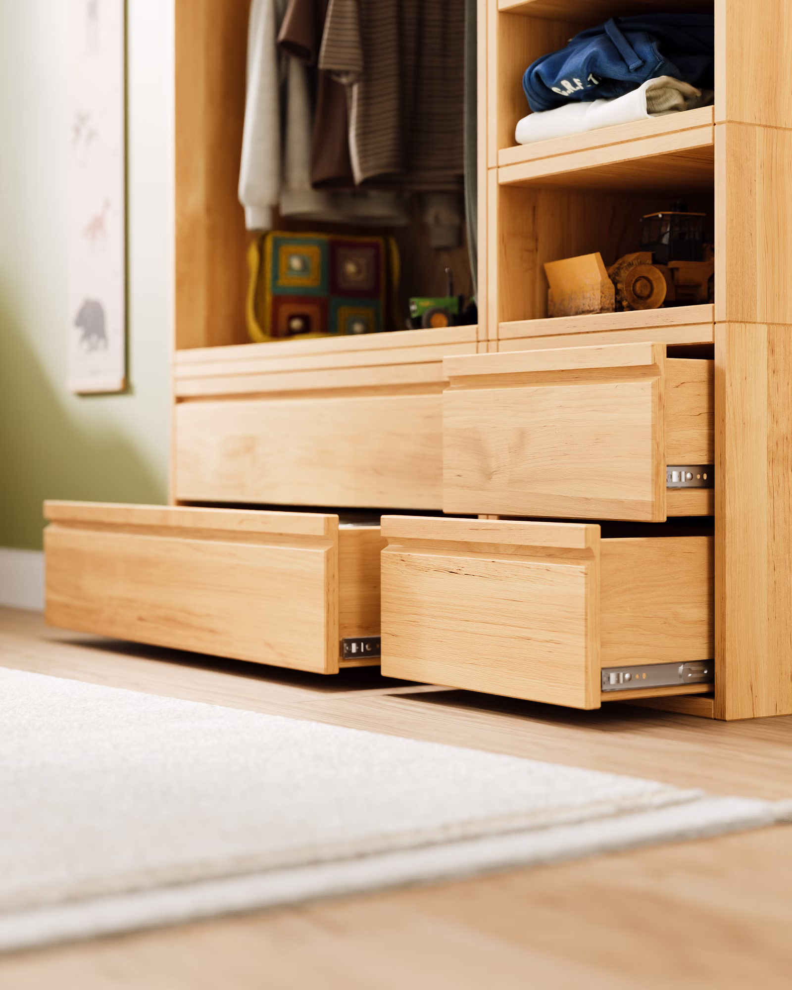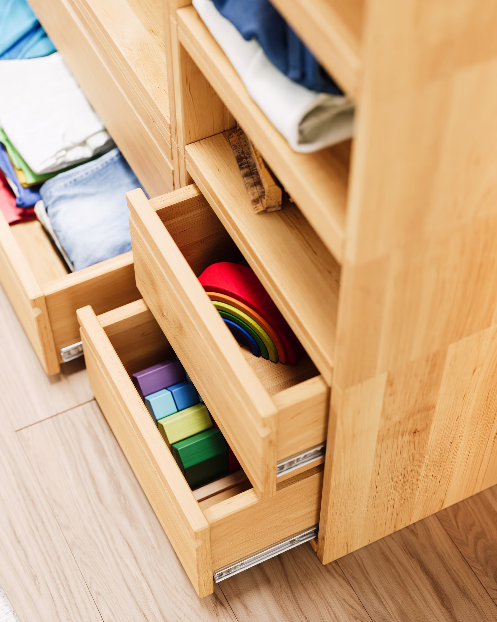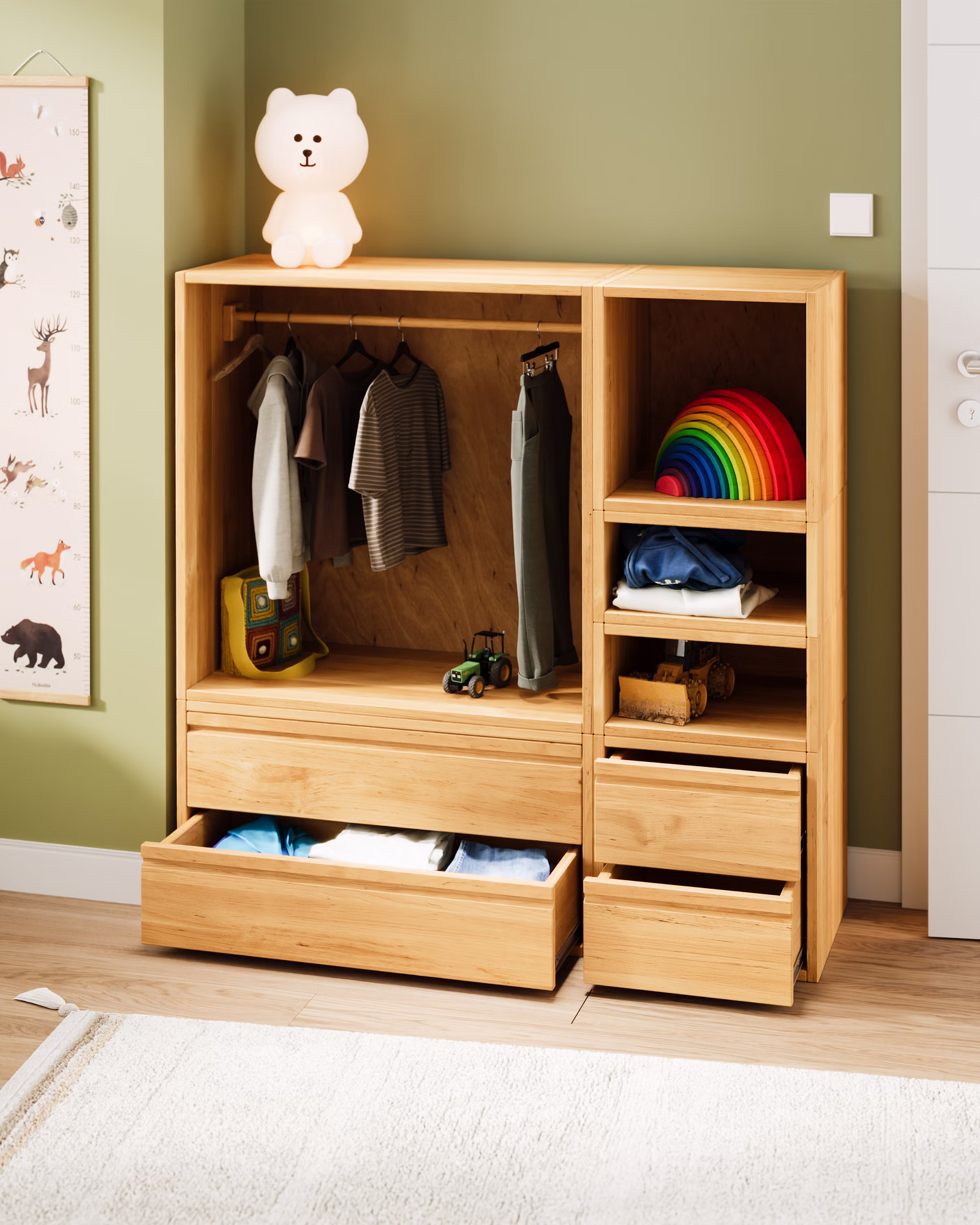 Offener Kinder-Kleiderschrank und Raumteiler mit Schubladen aus Bio-Massivholz – selbstständiges Ankleiden leicht gemacht.