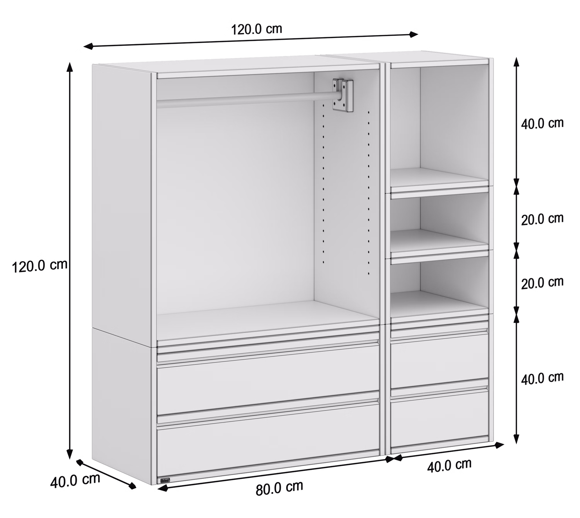 • 1x Regalwürfel mit Rückwand: Außen H 80 x B 80 x T 40 cm, inkl. Kleiderstange