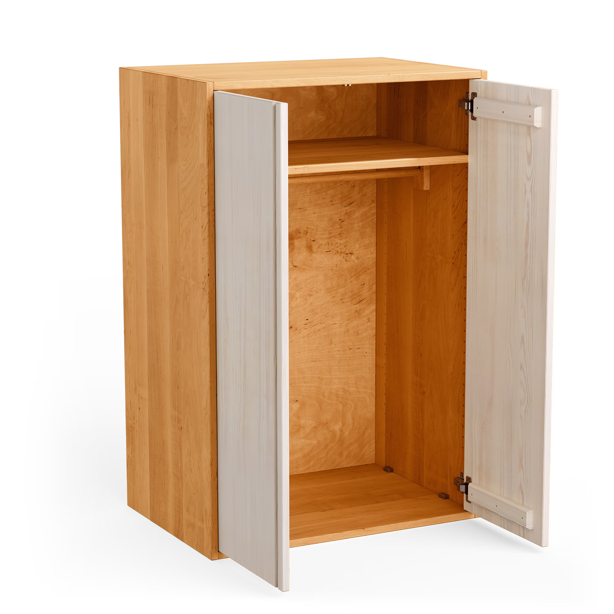 Das große Kleiderschrankelement bietet dank der fest installierten Kleiderstange und des darüber liegenden Fachs ausreichend Platz für Jacken, Blusen, Pullover, T-Shirts und vieles mehr. Zudem schafft das kleine Kleiderschrankelement mit Einlegeboden zwei weitere Ordnungsfächer, mit denen z. B. Kleidung und Spielsachen bequem und übersichtlich verstaut werden können. Außerdem ist es optimal geeignet zum Aufbewahren von Bettwäsche und Bettzeug.
