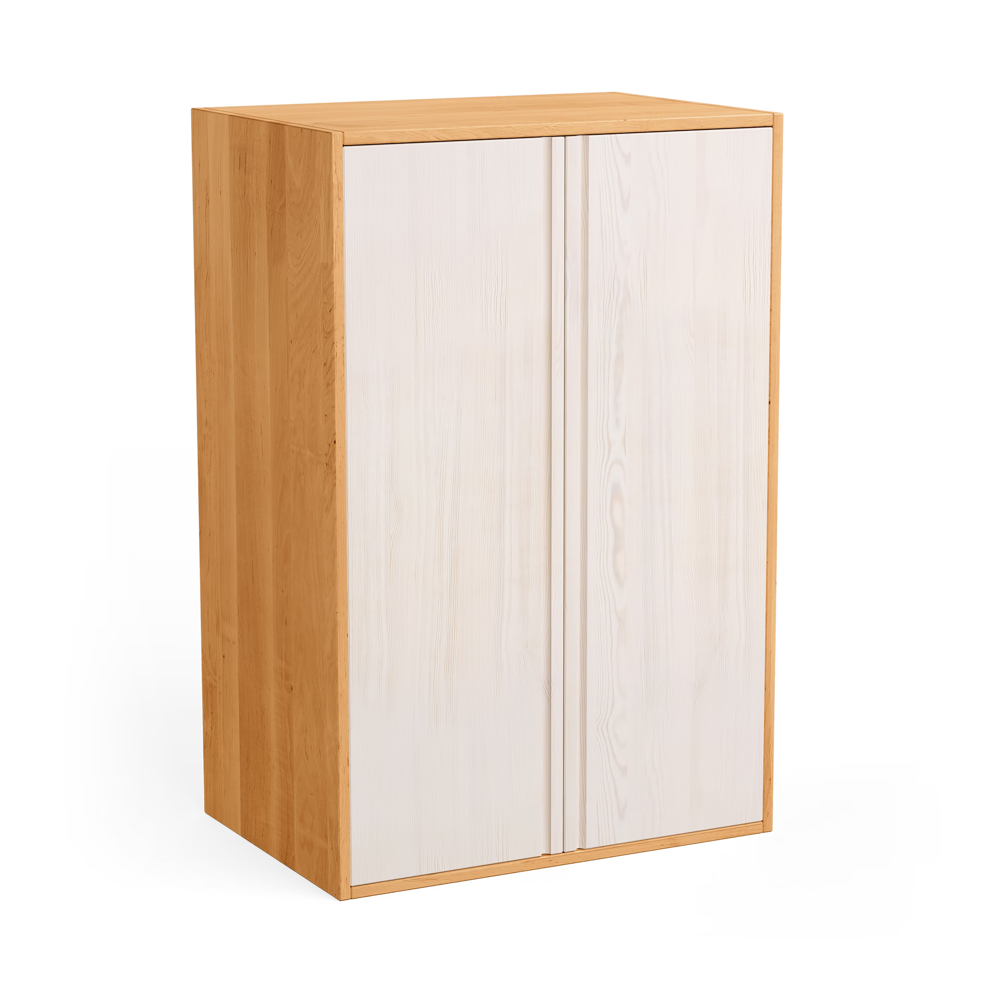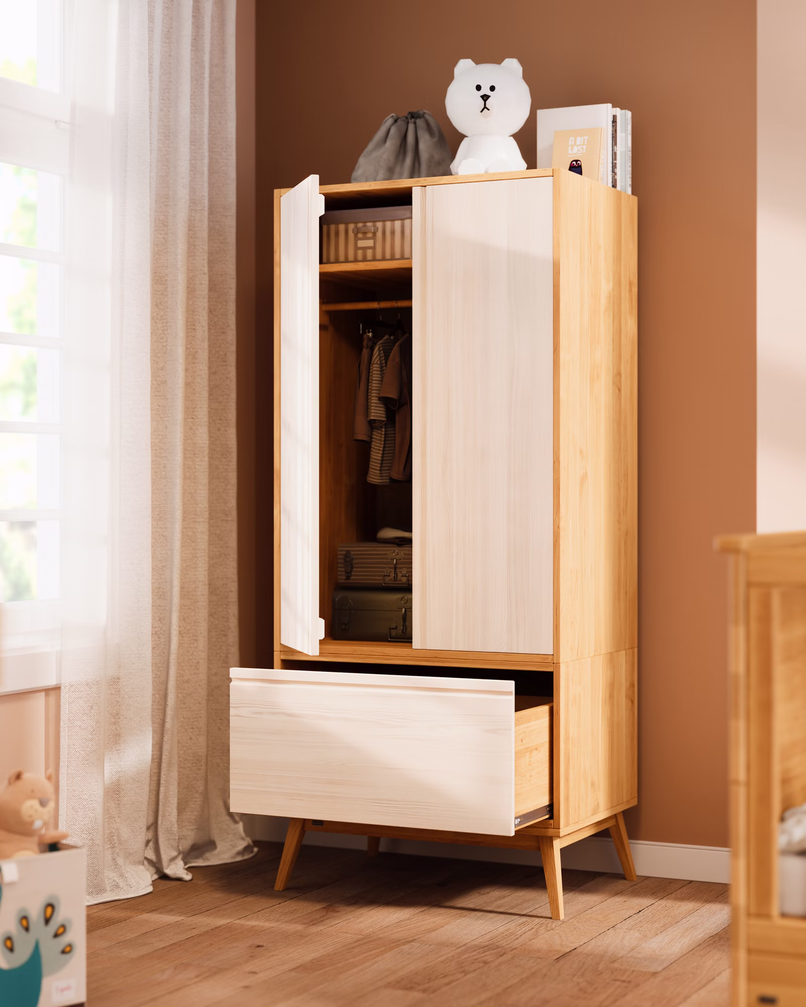 Unser Set Laura Retro Schrank mit Schubkasten und Sockel wird aus Bio-Massivholz gefertigt und ist die ideale Ausstattung für jedes Kinderzimmer. Dank des nostalgischen Charms und der elegant gefrästen Griffmulden wird dieser Kleiderschrank zu einem echten Hingucker, der jede Einrichtung harmonisch ergänzt.