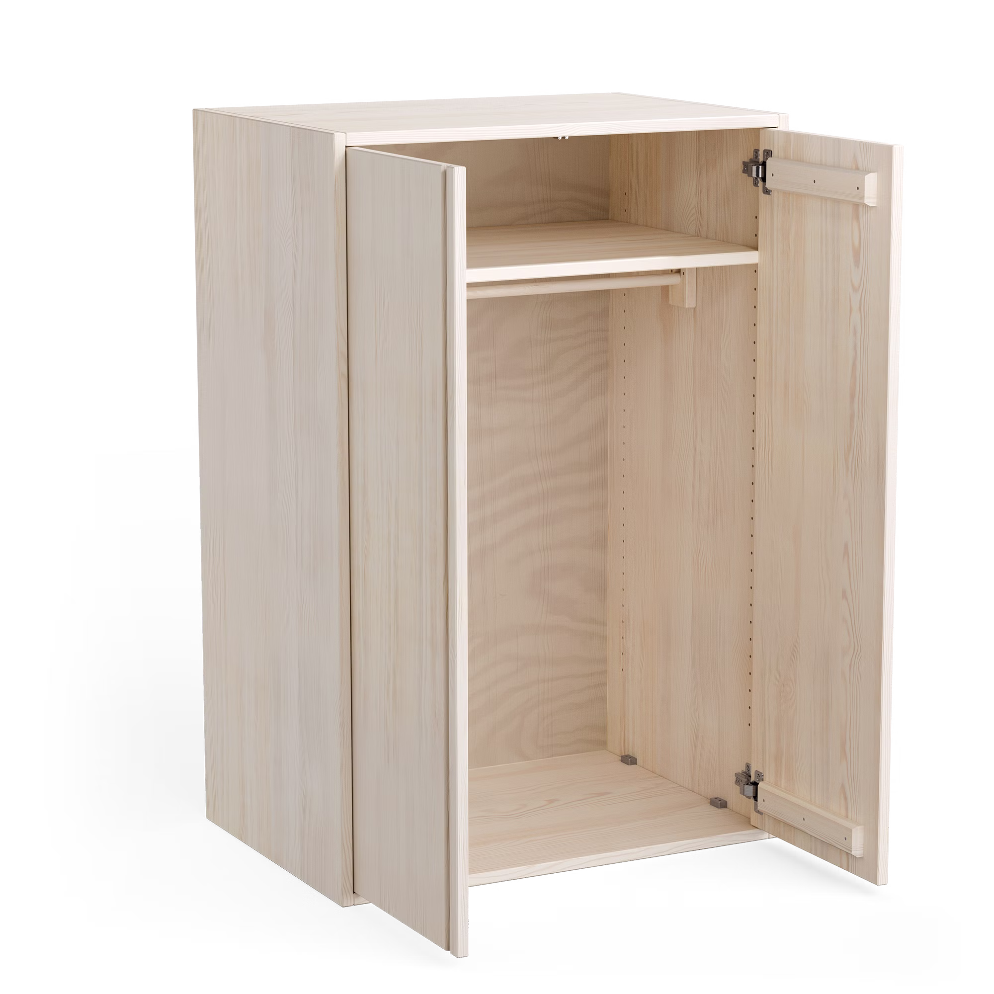 Das große Kleiderschrankelement bietet dank der fest installierten Kleiderstange und des darüber liegenden Fachs ausreichend Platz für Jacken, Blusen, Pullover, T-Shirts und vieles mehr. Zudem schafft das kleine Kleiderschrankelement mit Einlegeboden zwei weitere Ordnungsfächer, mit denen z. B. Kleidung und Spielsachen bequem und übersichtlich verstaut werden können. Außerdem ist es optimal geeignet zum Aufbewahren von Bettwäsche und Bettzeug.