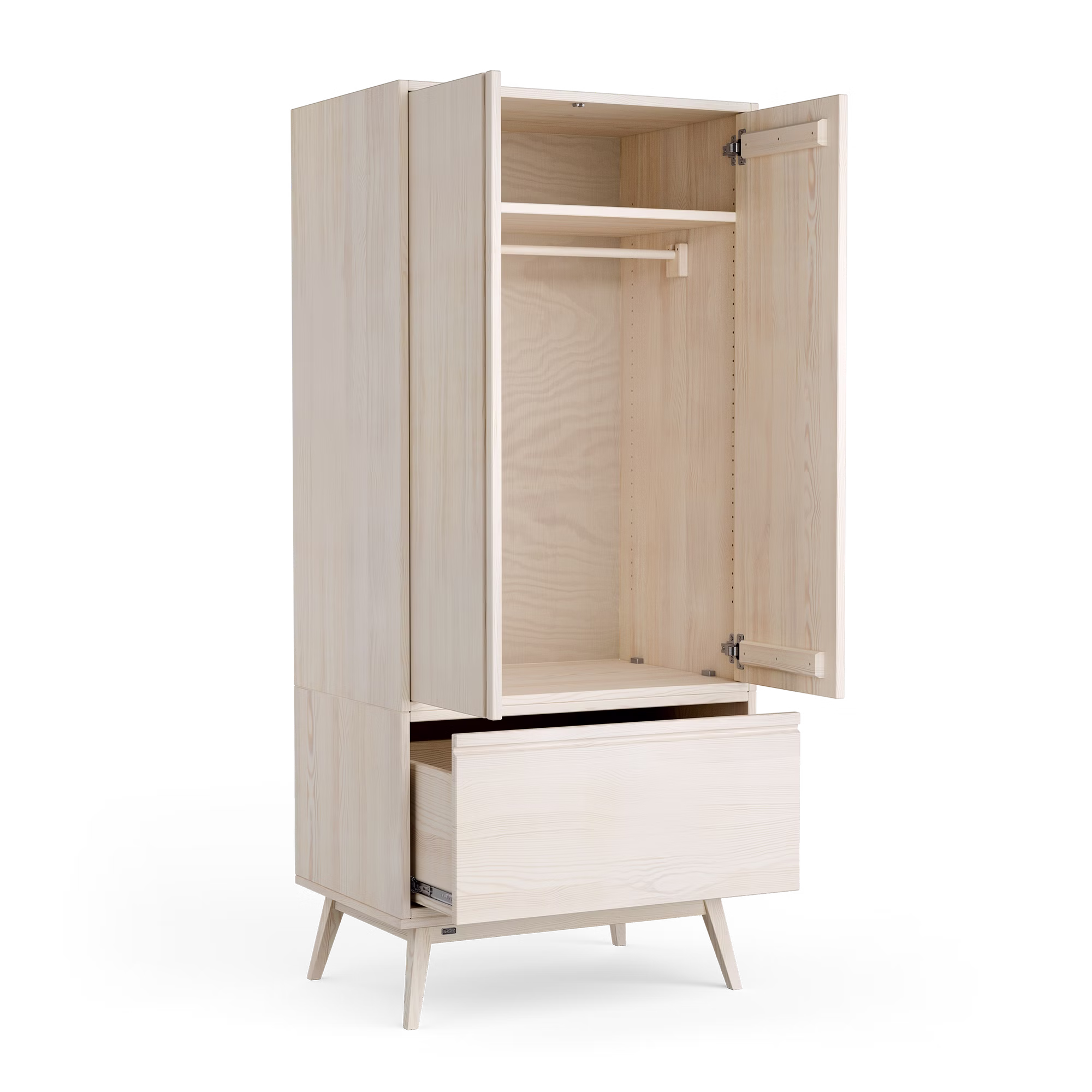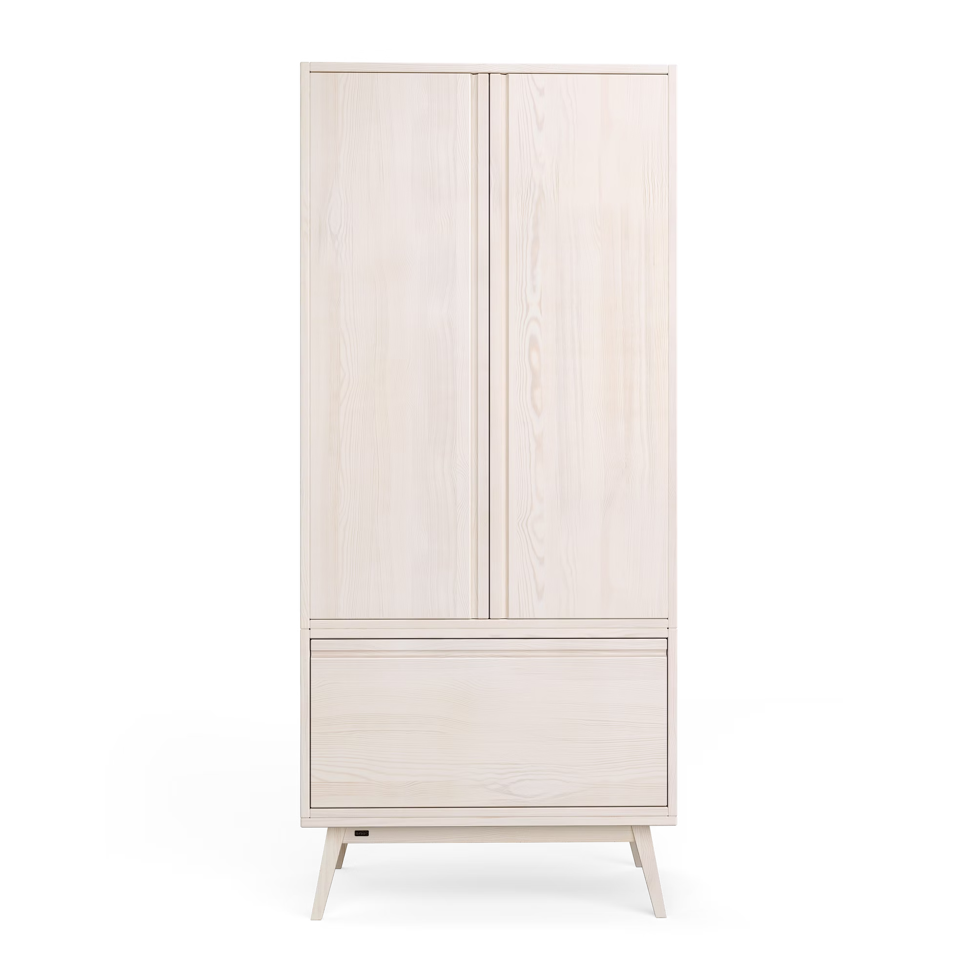 Unser Set Laura Retro Schrank mit Schubkasten und Sockel wird aus Bio-Massivholz gefertigt und ist die ideale Ausstattung für jedes Kinderzimmer. Dank des nostalgischen Charms und der elegant gefrästen Griffmulden wird dieser Kleiderschrank zu einem echten Hingucker, der jede Einrichtung harmonisch ergänzt.