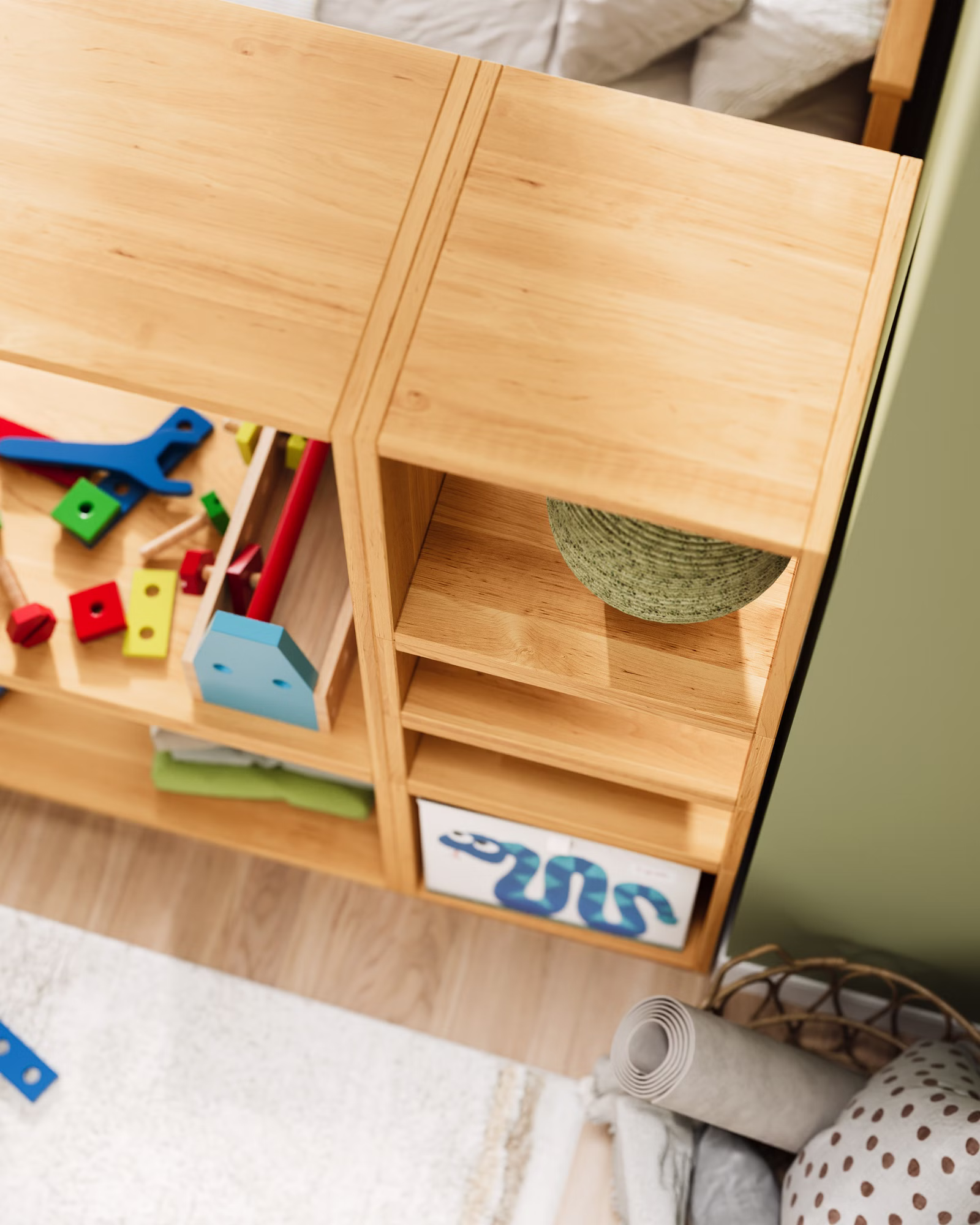 Offener Kinder-Kleiderschrank und Raumteiler aus Bio-Massivholz – selbstständiges Ankleiden leicht gemacht