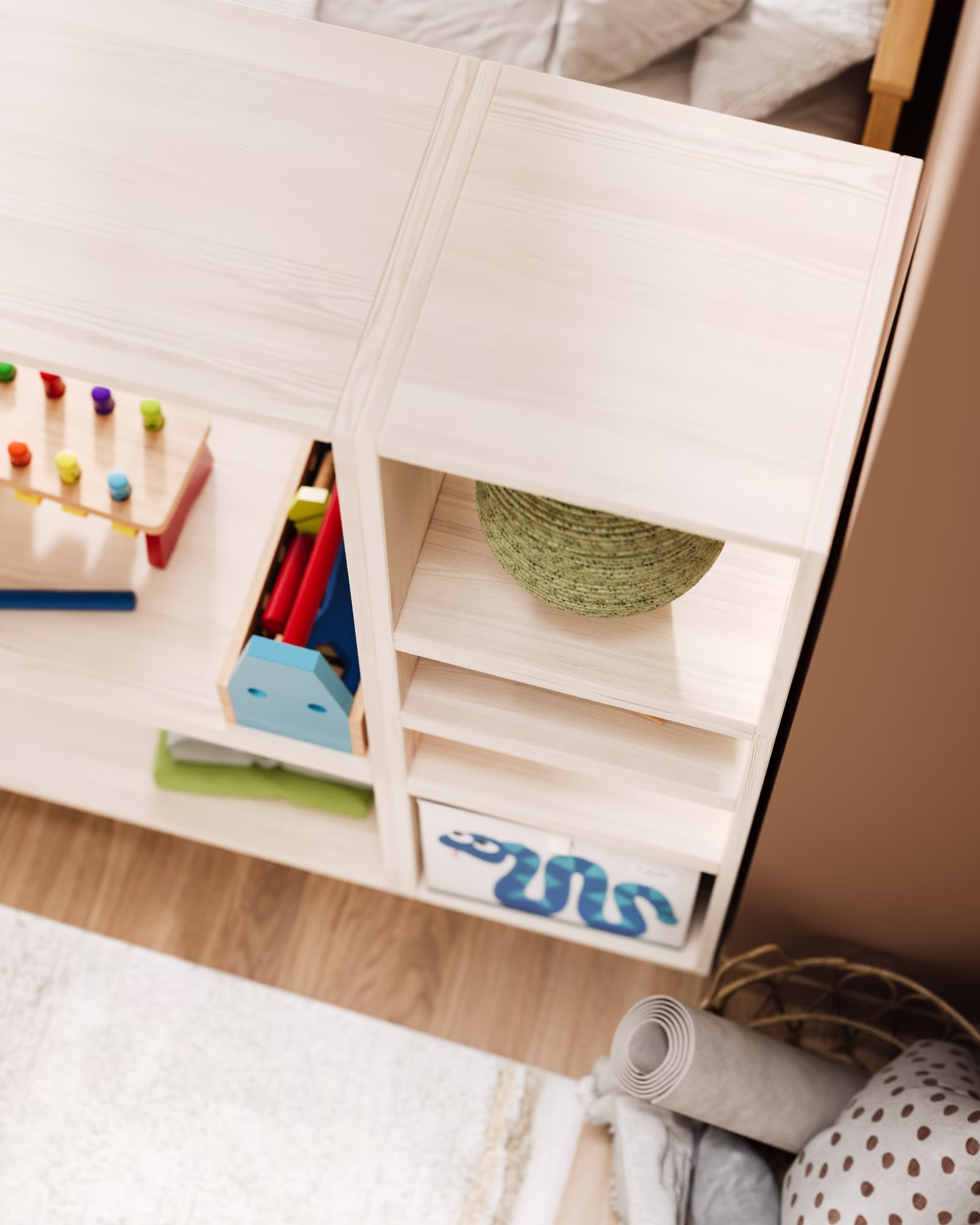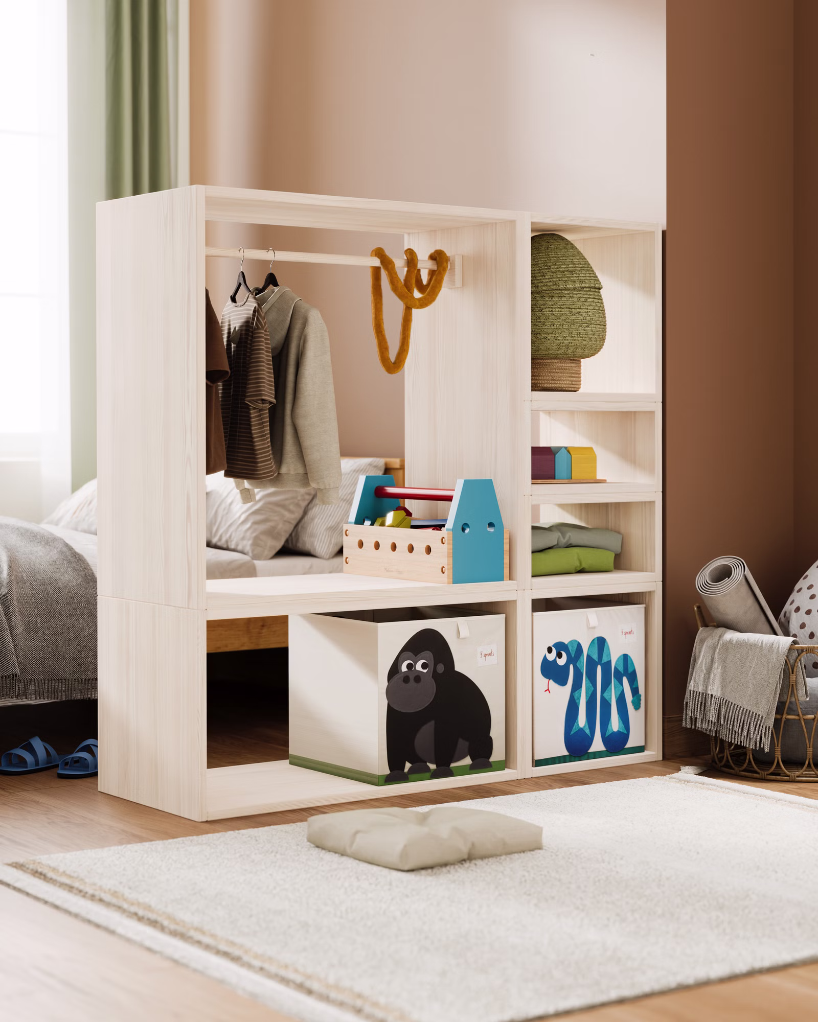 Offener Kinder-Kleiderschrank und Raumteiler aus Bio-Massivholz – selbstständiges Ankleiden leicht gemacht