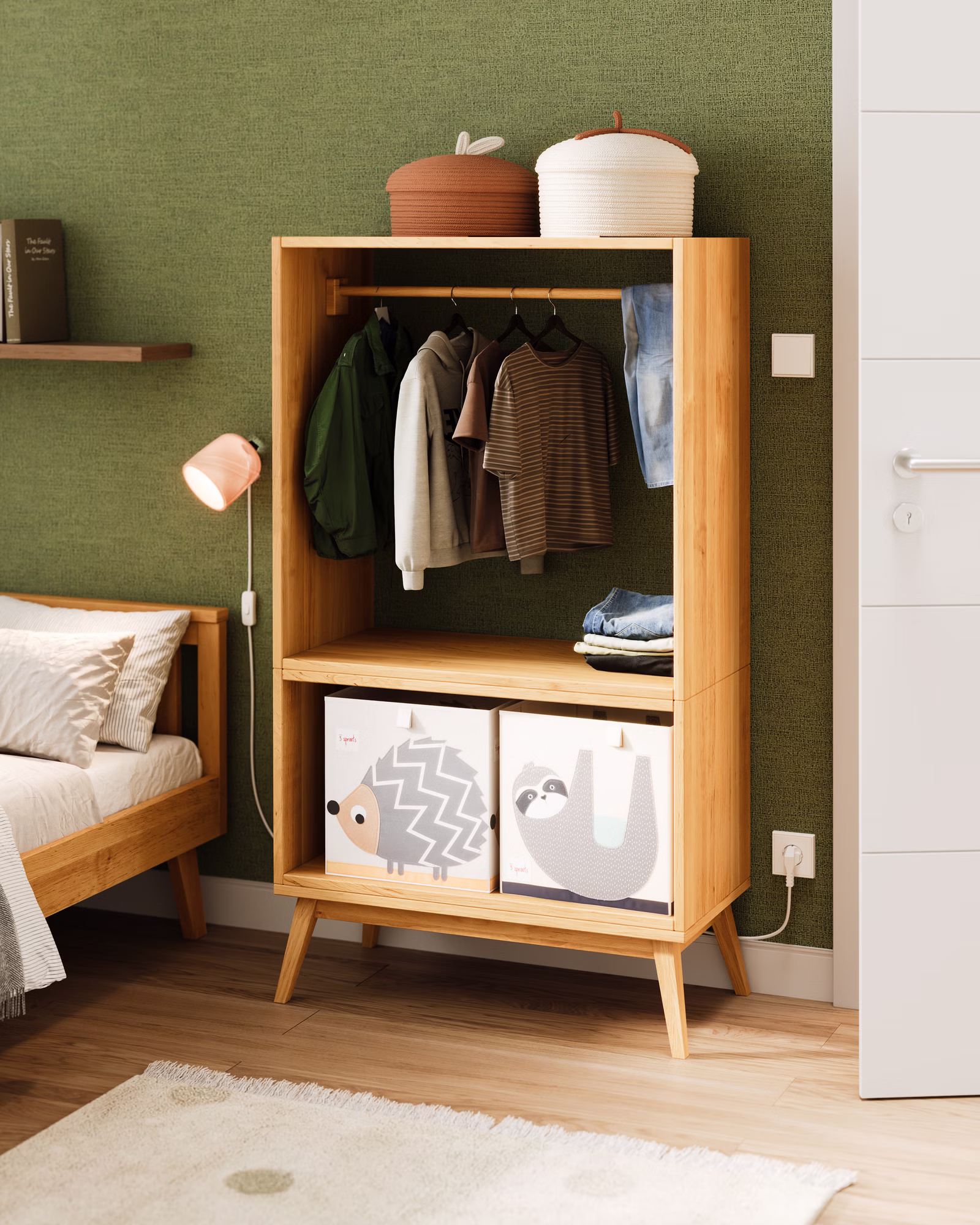 Das Set vereint zeitloses Retro-Design mit durchdachter, kindgerechter Funktionalität. Seine offene Bauweise mit Kleiderstange und großzügigen Ablagefächern gibt Kindern die Möglichkeit, ihre Kleidung, Schuhe und Accessoires selbstständig zu erreichen und ordentlich zu verstauen. Das stärkt spielerisch ihr Selbstvertrauen und unterstützt sie dabei, den Alltag eigenverantwortlich zu gestalten. Die leicht ausgestellten Füße verleihen dem Schrank seinen charakteristischen Retro-Charme, während die natürliche Holzoptik für Wärme und Geborgenheit sorgt. Ob als Kinderkleiderschrank, Garderobe im Flur oder Raumteiler – dieses Set ist vielseitig einsetzbar und lädt zum kreativen Spielen und Entdecken ein.