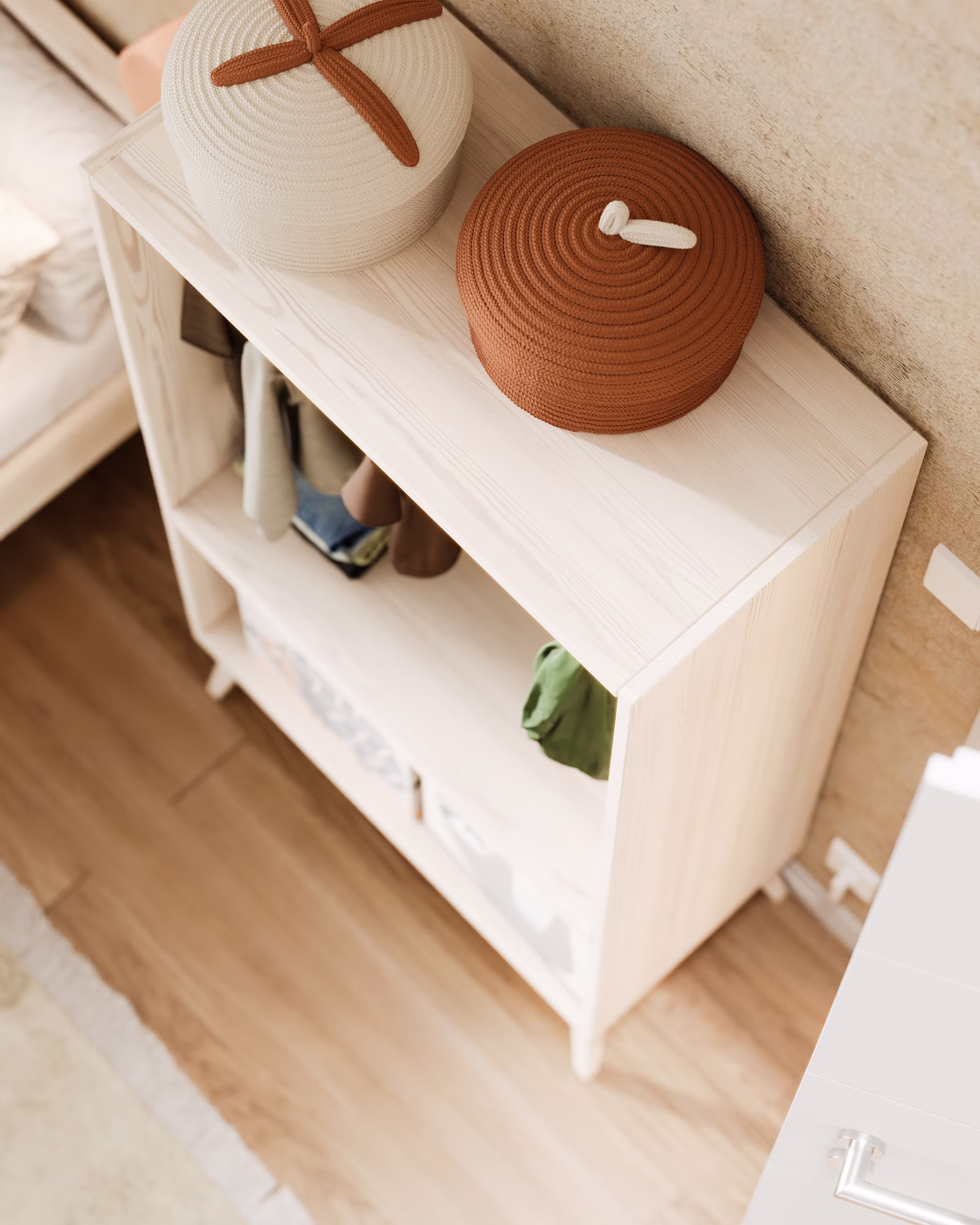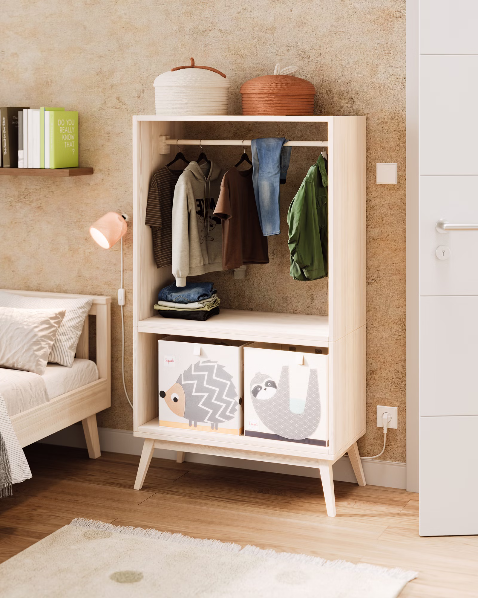 Das Set vereint zeitloses Retro-Design mit durchdachter, kindgerechter Funktionalität. Seine offene Bauweise mit Kleiderstange und großzügigen Ablagefächern gibt Kindern die Möglichkeit, ihre Kleidung, Schuhe und Accessoires selbstständig zu erreichen und ordentlich zu verstauen. Das stärkt spielerisch ihr Selbstvertrauen und unterstützt sie dabei, den Alltag eigenverantwortlich zu gestalten. Die leicht ausgestellten Füße verleihen dem Schrank seinen charakteristischen Retro-Charme, während die natürliche Holzoptik für Wärme und Geborgenheit sorgt. Ob als Kinderkleiderschrank, Garderobe im Flur oder Raumteiler – dieses Set ist vielseitig einsetzbar und lädt zum kreativen Spielen und Entdecken ein.
