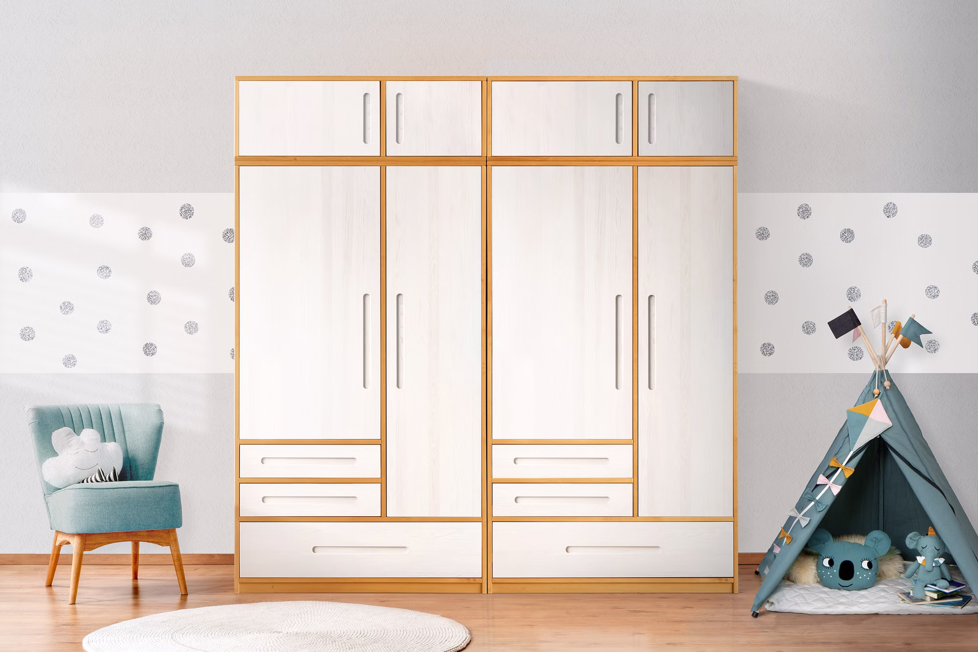 Unsere Lina Möbel bilden dabei die Grundlage für ein zeitlos schönes Kinderzimmer, das vom Baby- bis zum Jugendzimmer mitwächst. Modernes geometrisches Design und elegant gefräste Griffmulden zeichnen die Schrankkombination aus.