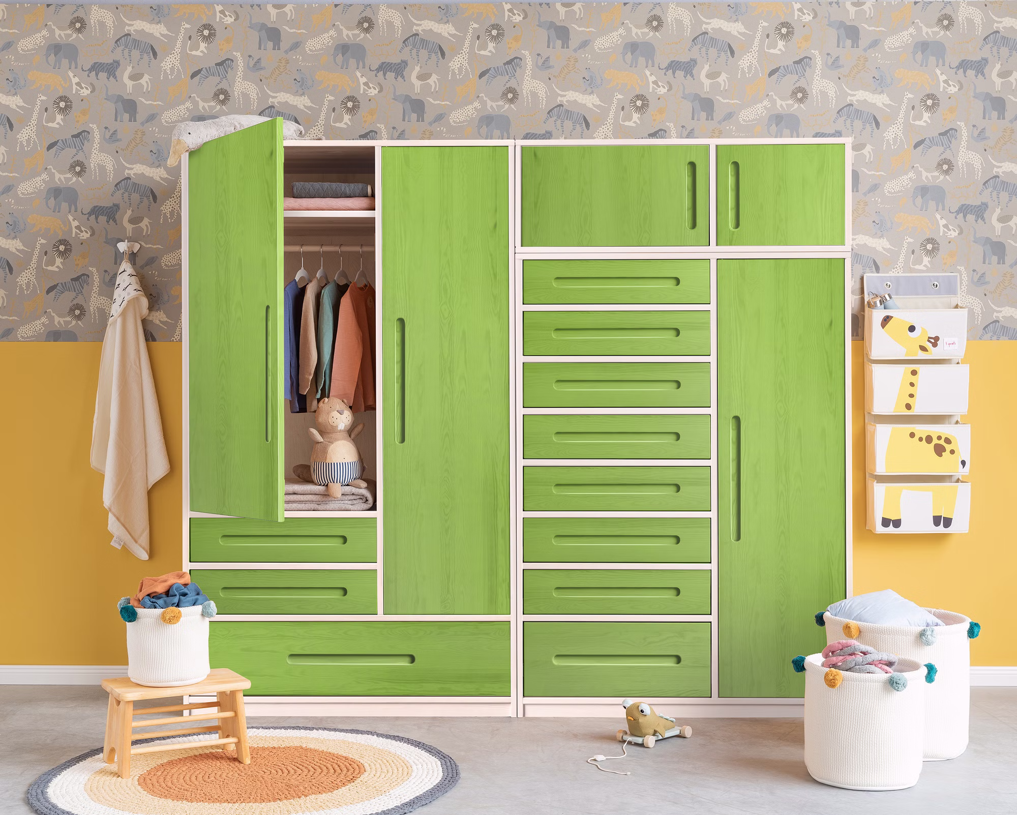 Unsere Lina Möbel bilden dabei die Grundlage für ein zeitlos schönes Kinderzimmer, das vom Baby- bis zum Jugendzimmer mitwächst. Modernes geometrisches Design und elegant gefräste Griffmulden zeichnen die Schrankkombination aus.