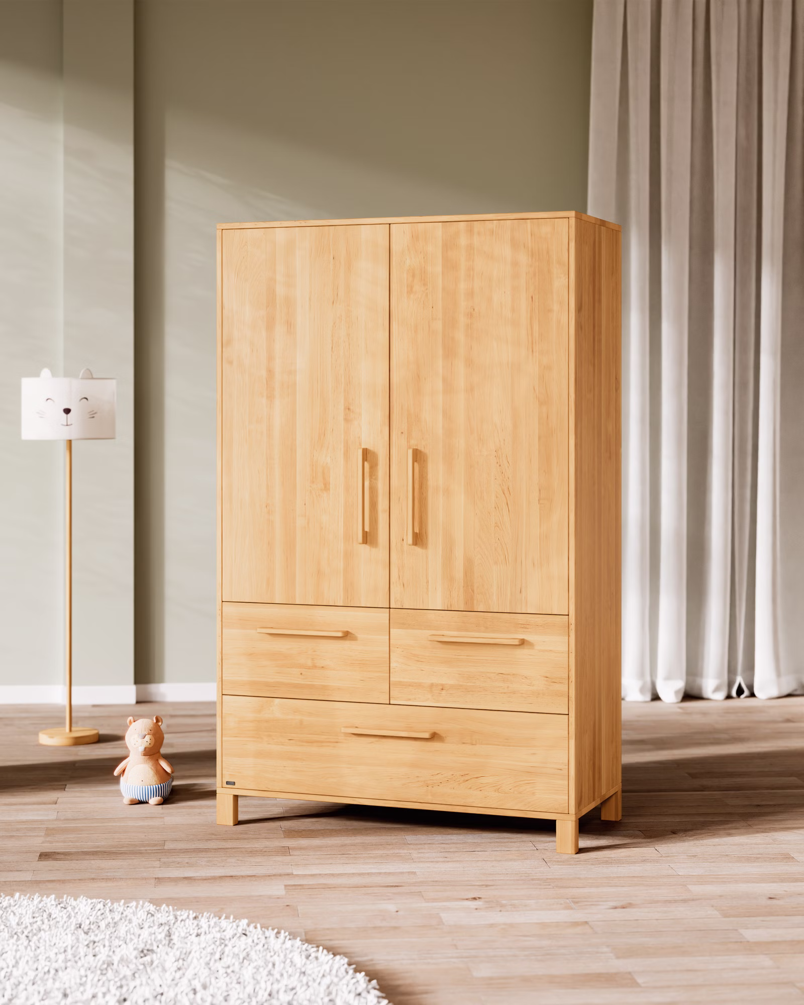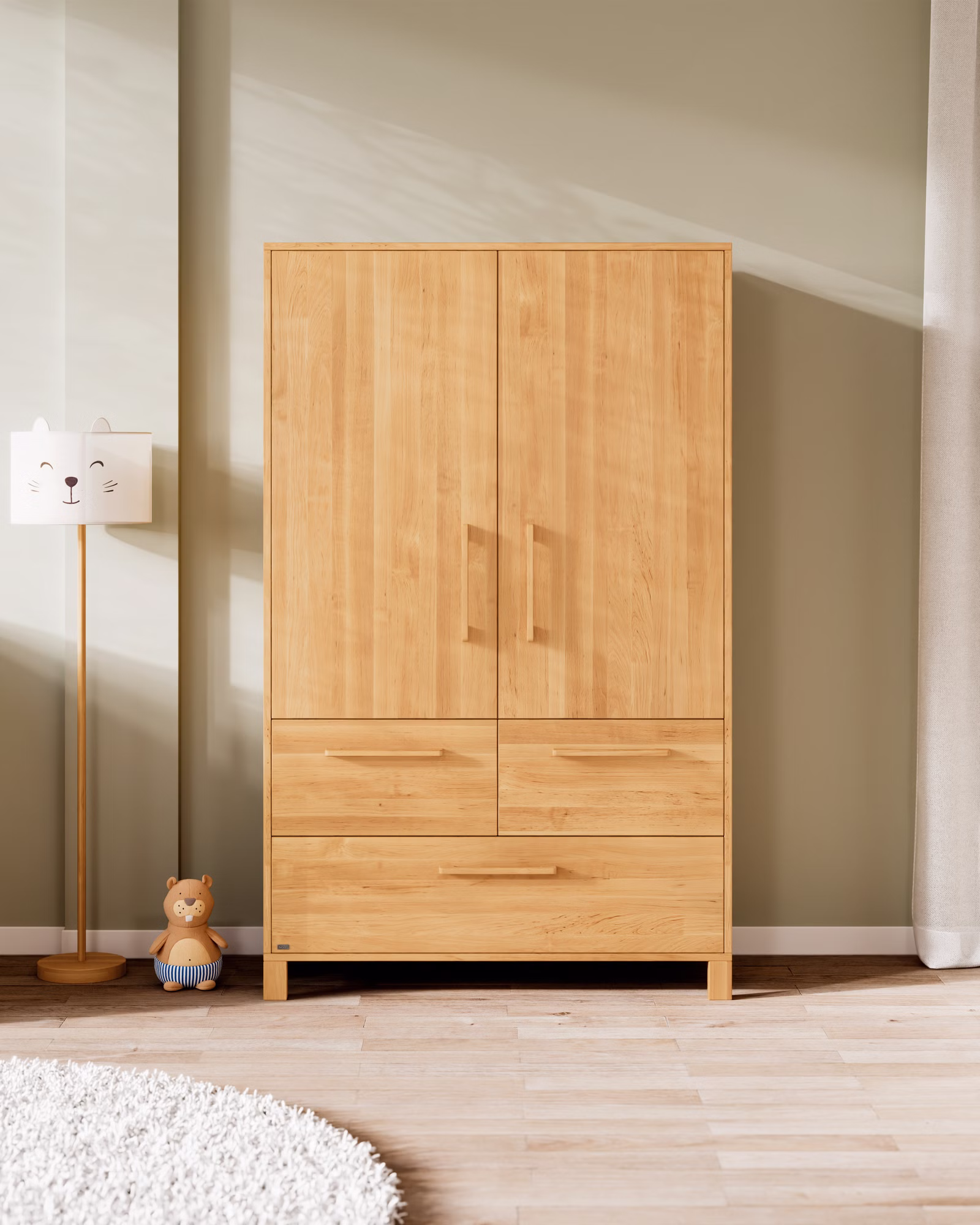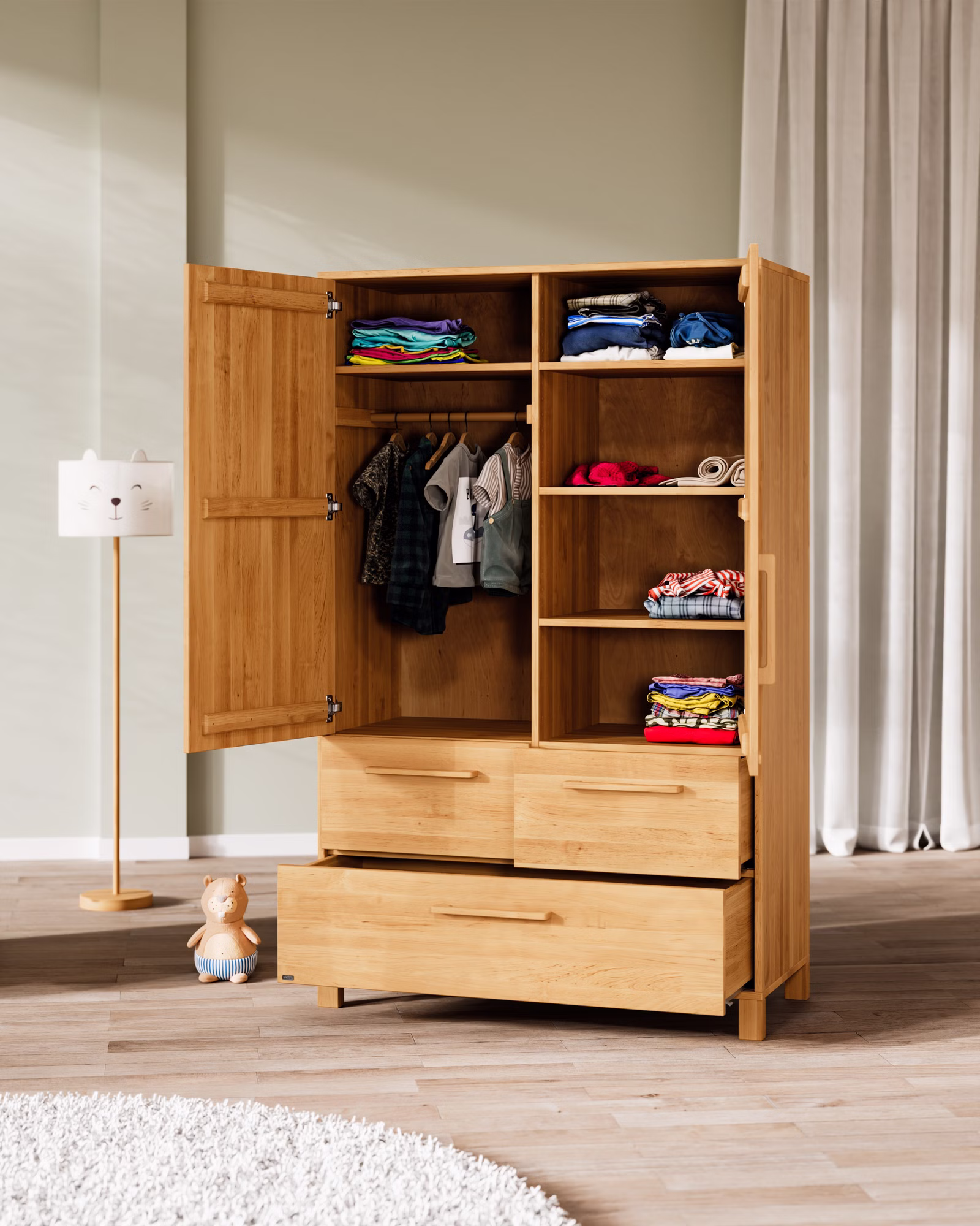 Der Theo Kleiderschrank überzeugt mit natürlichen Materialien, hochwertiger Verarbeitung und funktionalen Extras für den Familienalltag: