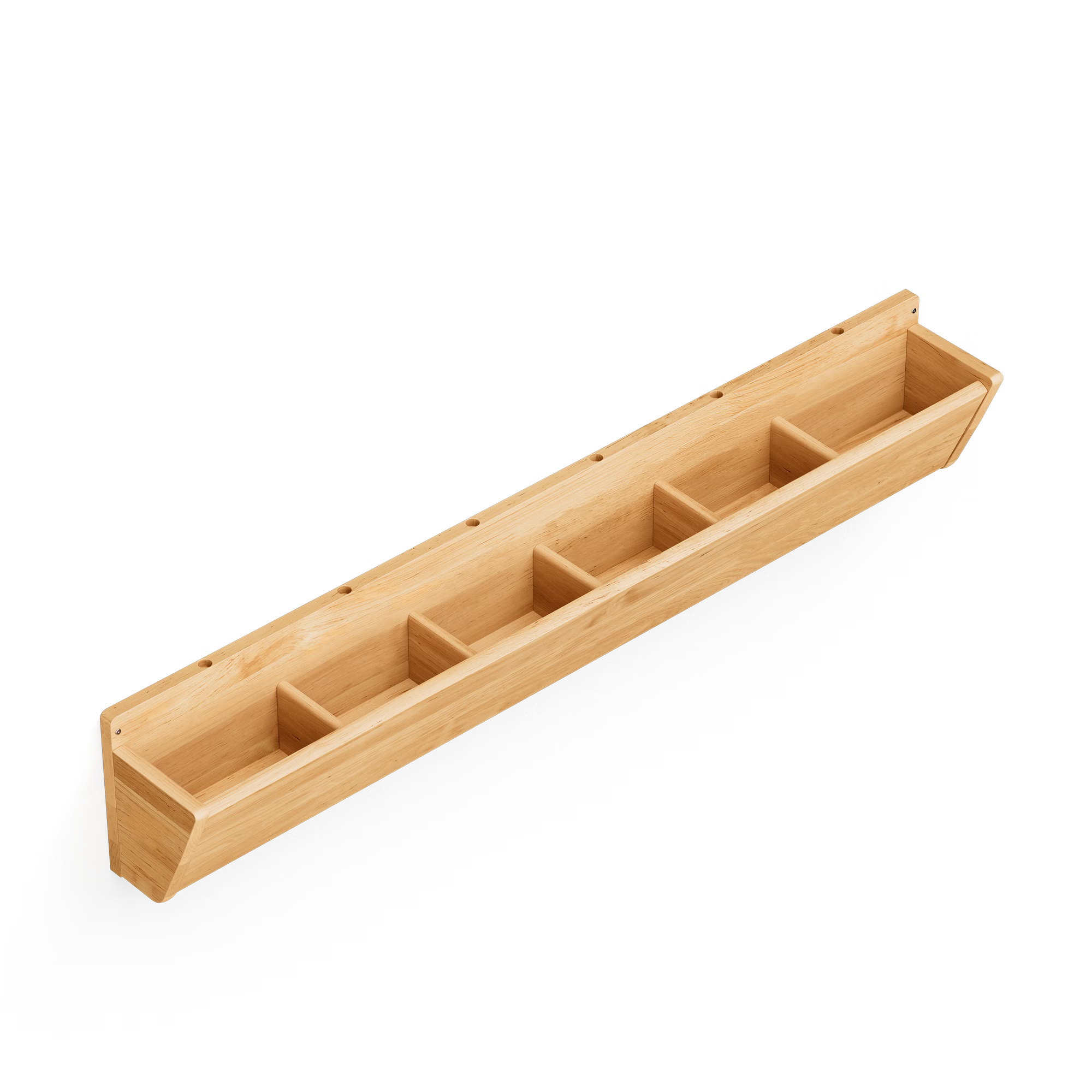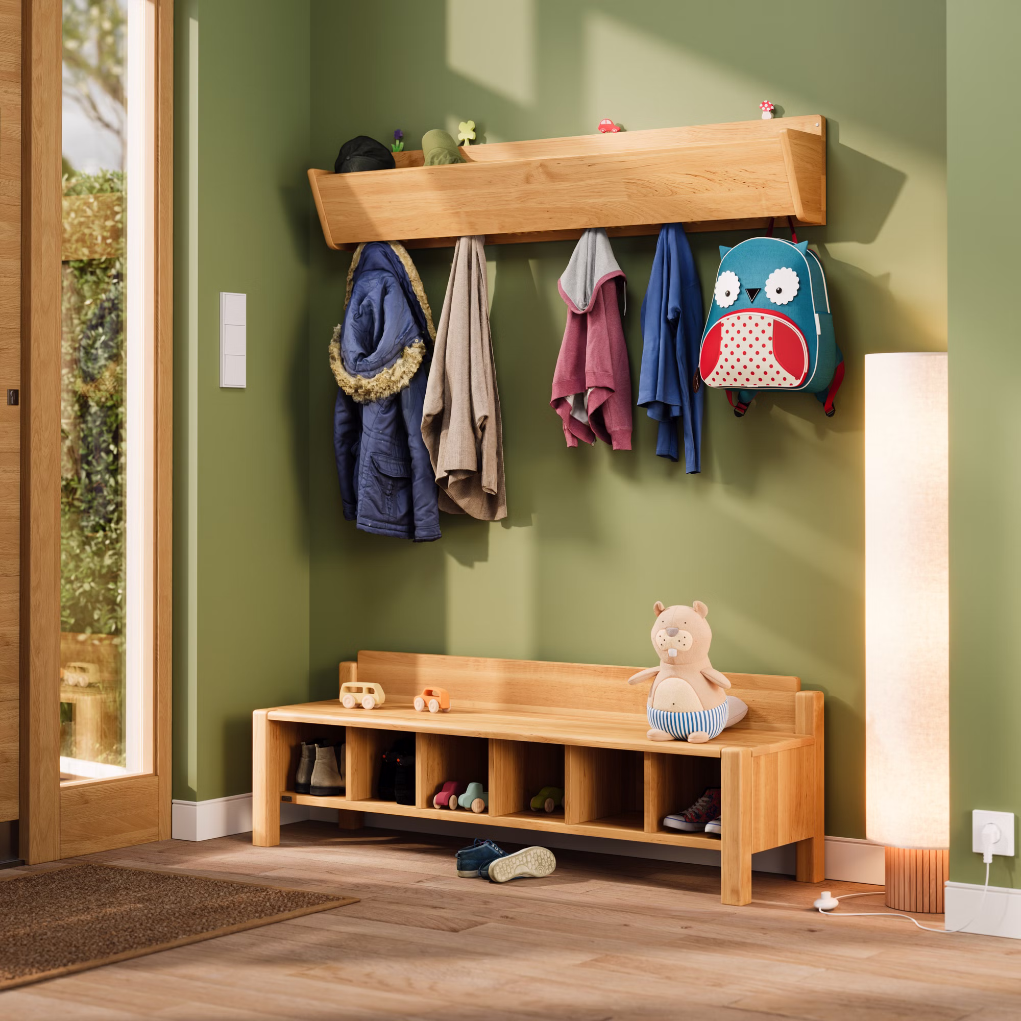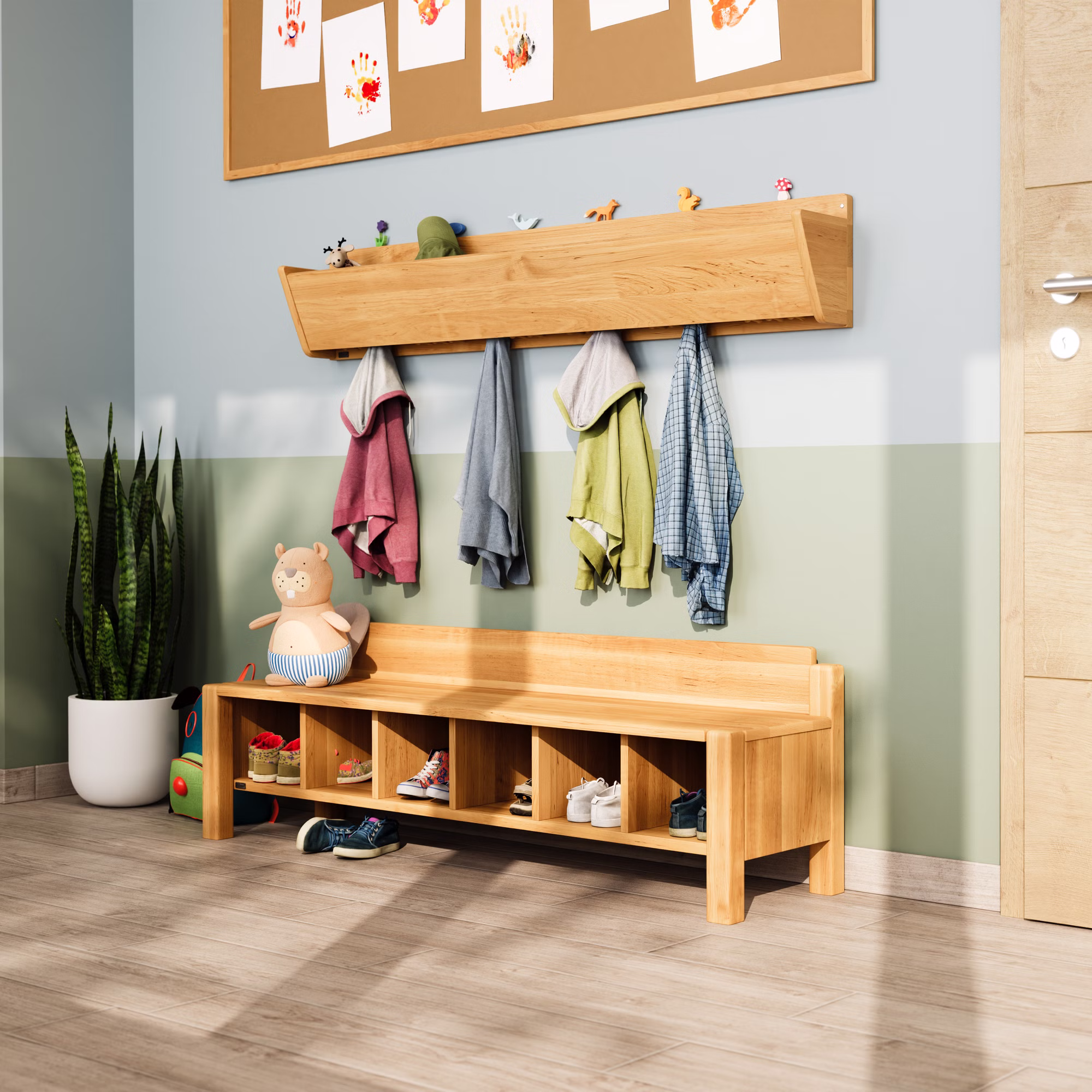 Die Garderobe ist aus massivem Erlenholz und hat Charakter - wir haben die obere Kante mit passgenauen Bohrungen für die Grimm's Motivstecker versehen. Jedes Kind sucht sich ein Symbol aus und erkennt daran jeden Morgen sein Fach wieder. So bekommt die Robin Hänge-Garderobe einen individuellen und persönlichen Charakter.