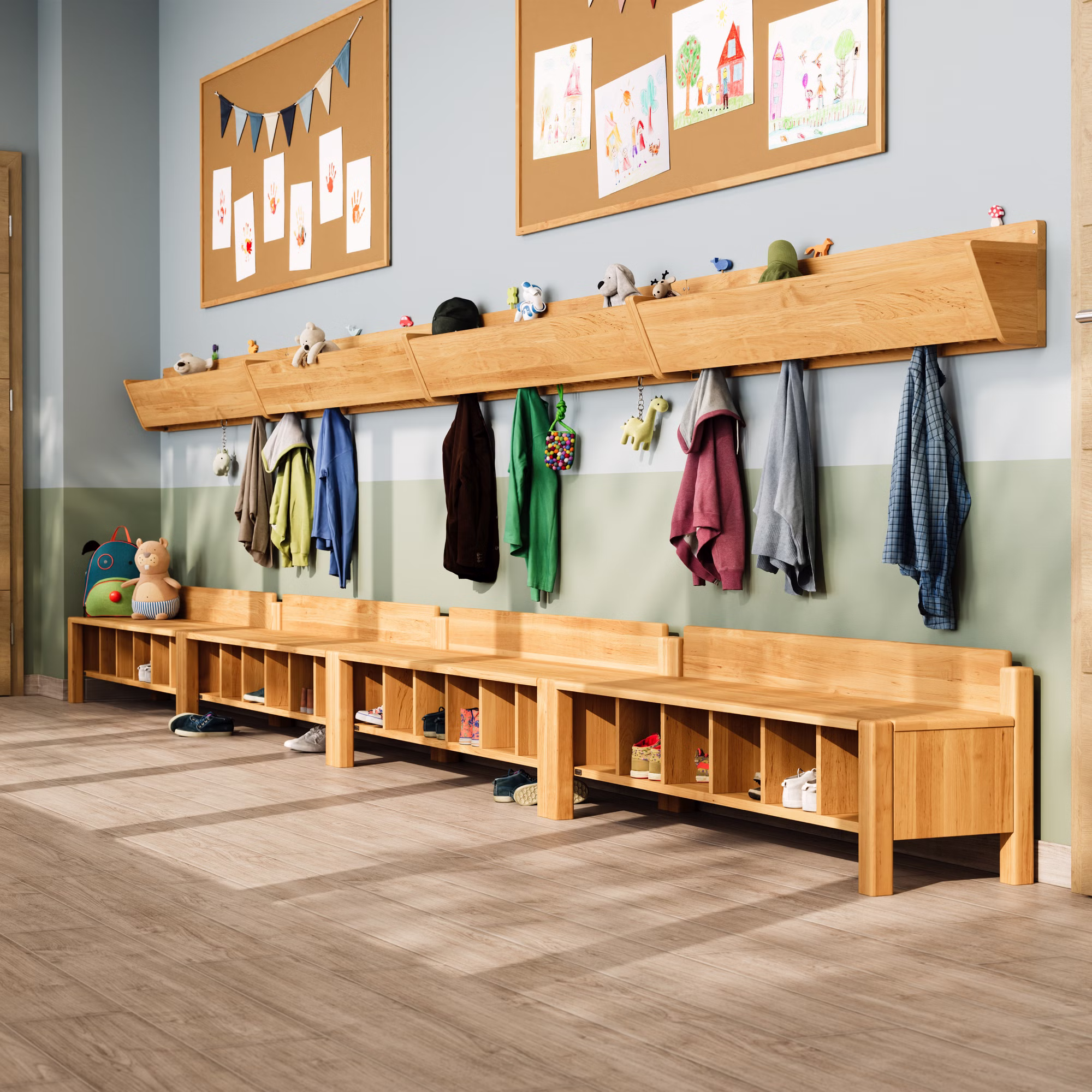 In dieser formschönen Garderobe mit Fächern verstauen Kinder ihre Mützen, Kappen, Stirnbänder und was sie sonst noch so alles brauchen.