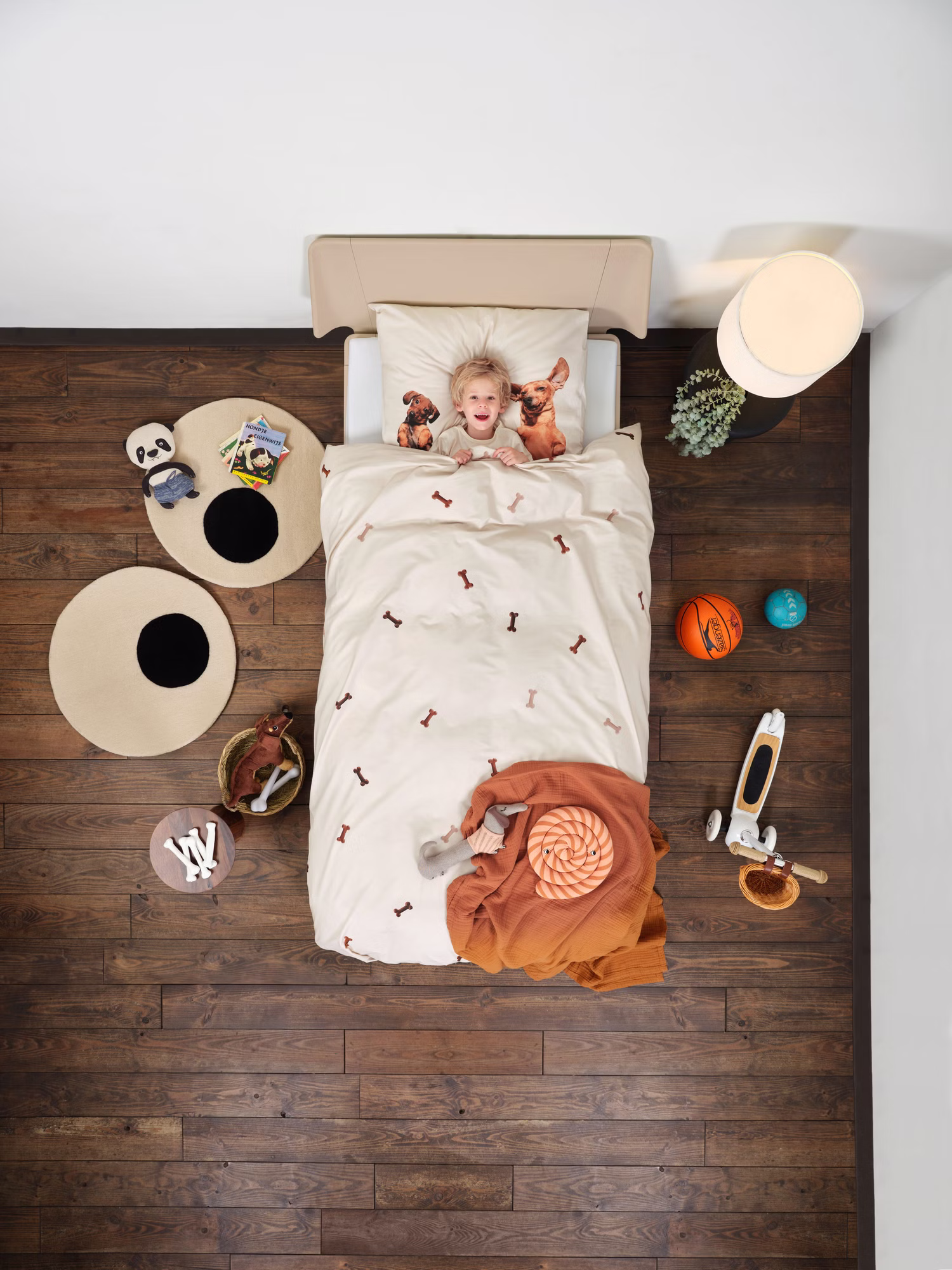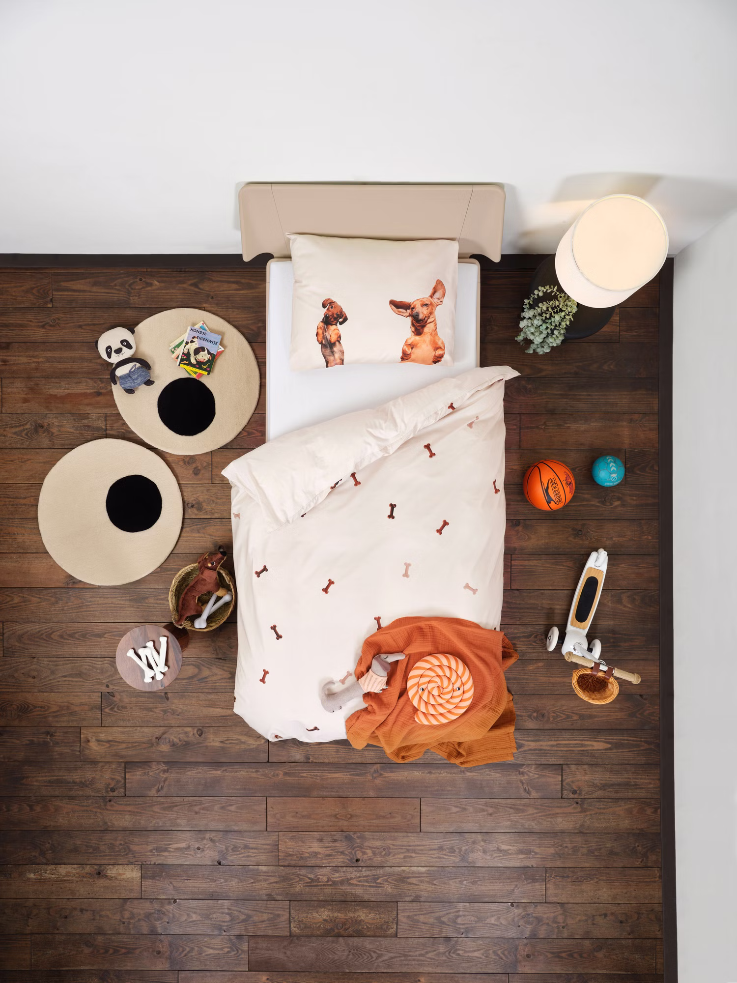 Der bequeme Bettbezug in Beige mit Fotodruck verwandelt dein Schlafzimmer in ein gemütliches Hundeparadies. Hergestellt aus 100 % Bio-Baumwolle für weichen, natürlichen Komfort.