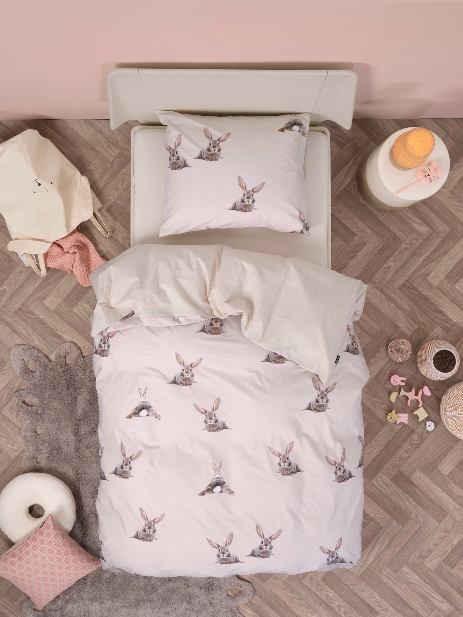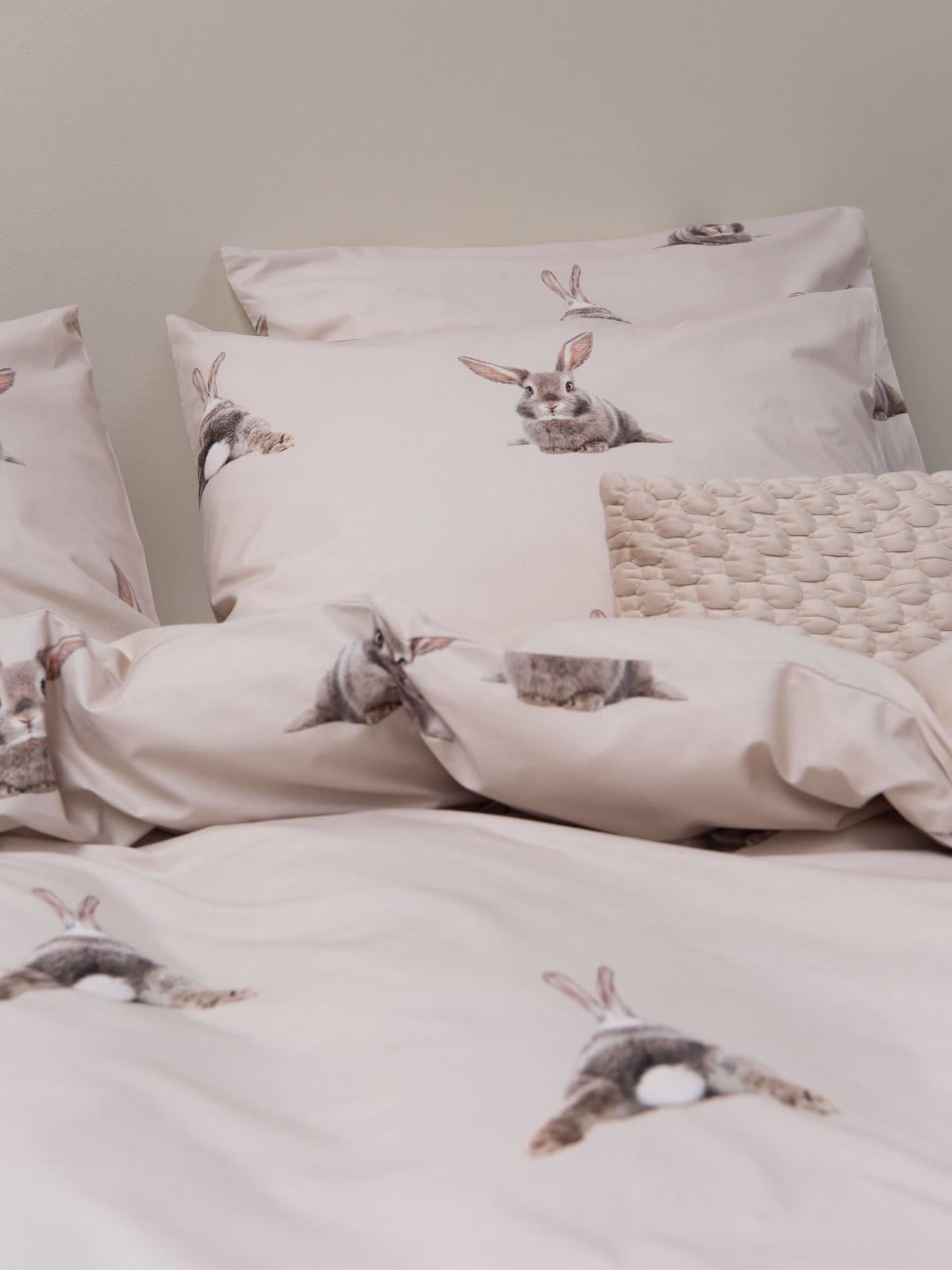 Der Bettbezug zeigt einen liebevollen Kaninchendruck auf sandfarbenem Hintergrund mit feinem, beigem Punktmuster am unteren Rand. Gefertigt aus 100 % Bio-Baumwolle für ein angenehm weiches und natürliches Schlafgefühl.