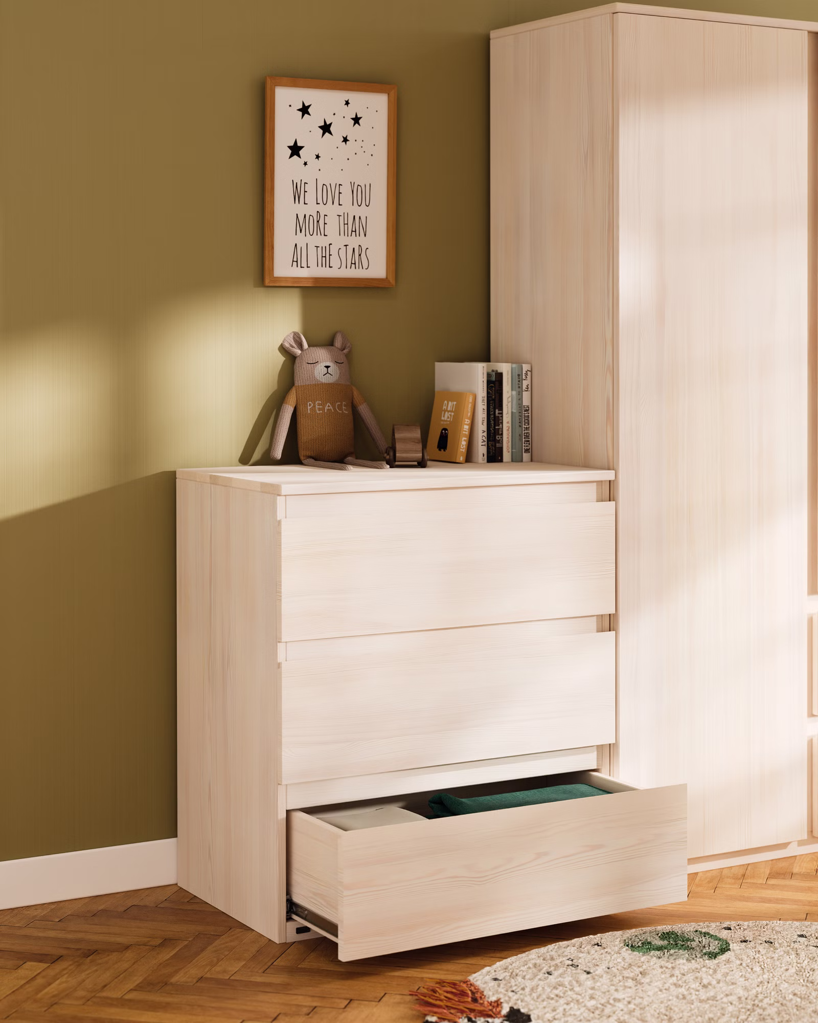 • Finn Kommode: 3 Schubladen mit kugelgelagerten Leichtlaufschienen und Vollauszug. Die Griffmulden sind auch für kleine Kinderhände leicht zu öffnen.