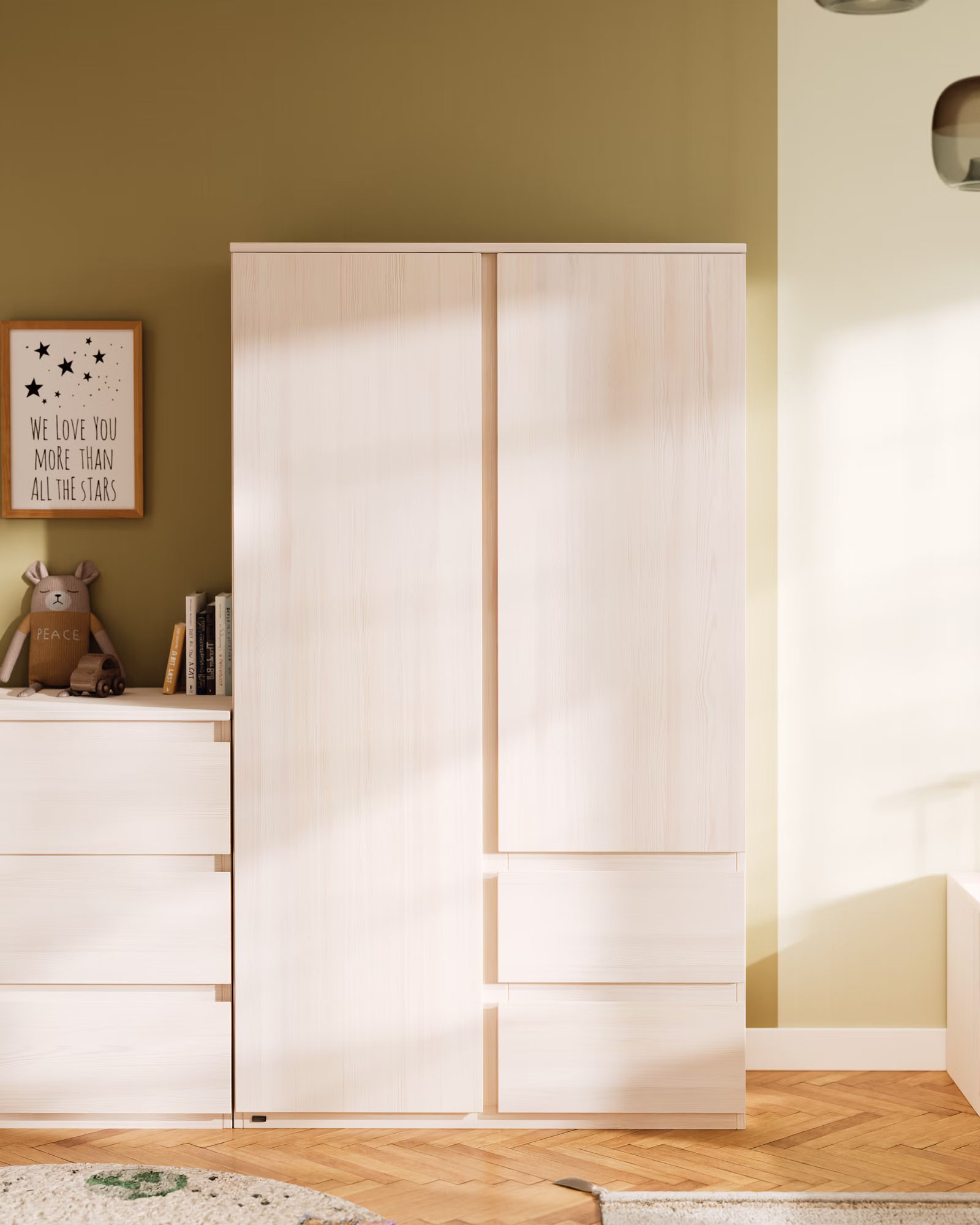 • Finn Kleiderschrank 2-türig: 2 Schublade mit Vollauszug, 1 verstellbare Kleiderstange, 4 flexible Einlegeböden. Zusätzliche Einlegeböden & Kleiderstangen erhältlich.