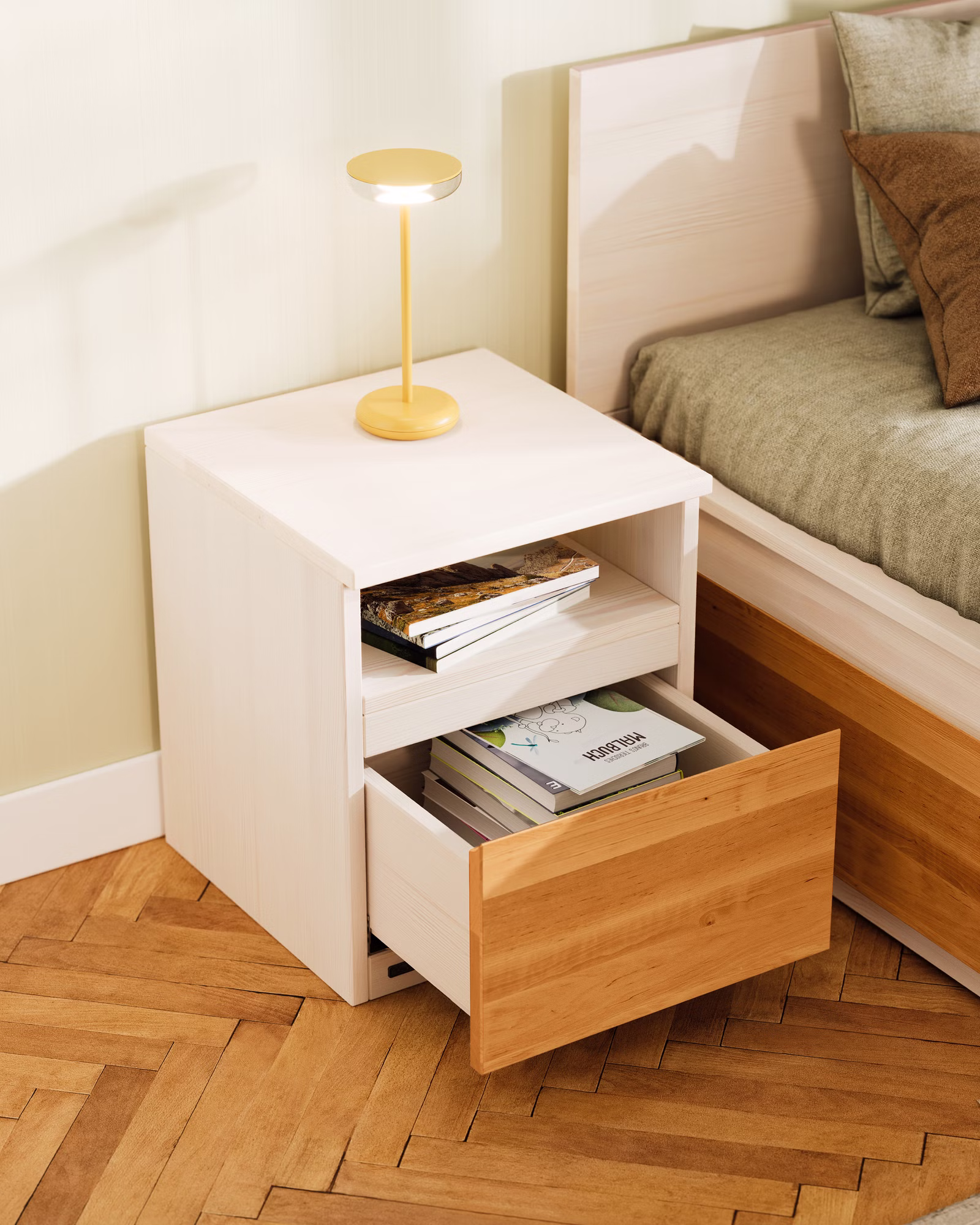 • Finn Nachttisch/Rollcontainer: 1 Schublade mit Leichtlaufschienen und Soft-Close-Mechanismus, 1 offenes Ablagefach.