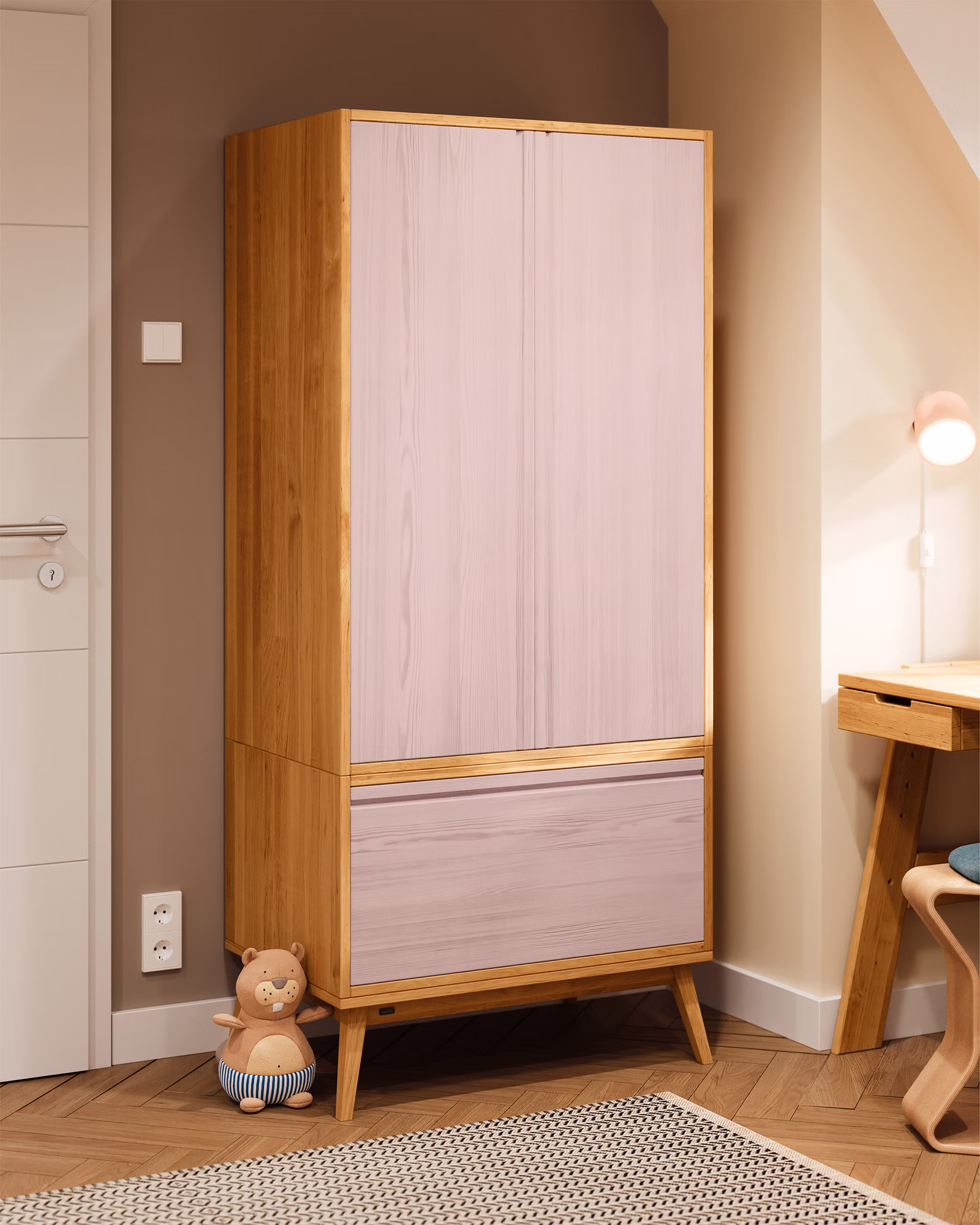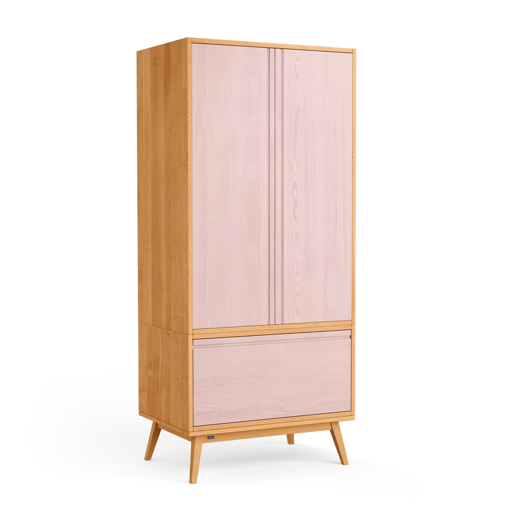 • Laura Retro Schrank mit Schubkasten: 1 fest installierte Kleiderstange, 1 Einlegeboden, 1 Schubkasten mit Leichtlaufschienen und Soft-Close-Mechanismus, elegant gefräste Griffmulden. Zusätzliche Einlegeböden erhältlich.