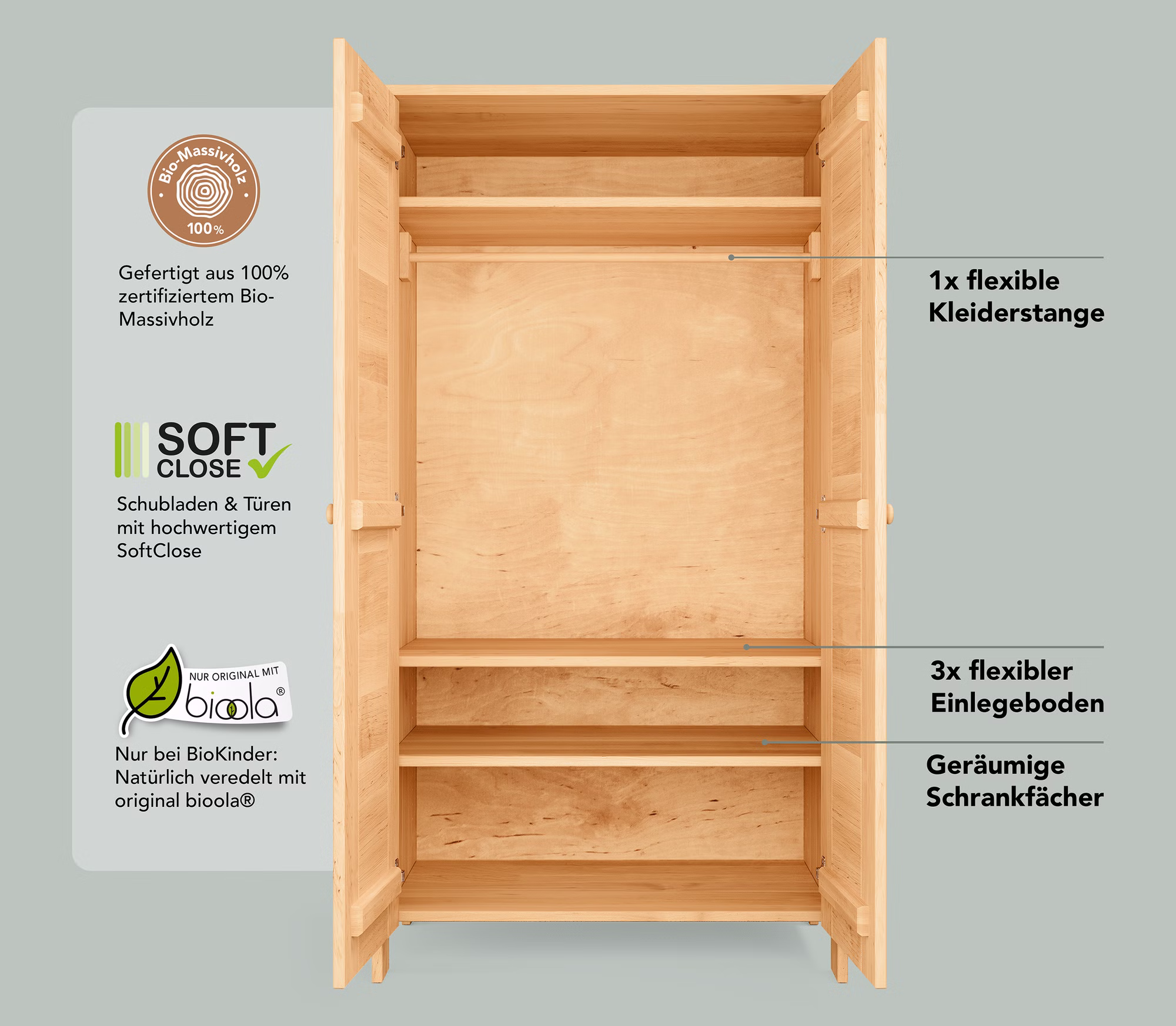 Das Massivholz stammt aus zertifizierter Forstwirtschaft. Gefertigt aus Bio-Erlenholz (natur) und Bio-Kiefernholz (weiß und bunt lasiert). Die Beschaffenheit jedes Möbelstücks wird nur bei BioKinder durch bioola® nature Öl bzw. bioola® colour Lasur aus natürlichen Erd- und Mineralpigmenten und pflanzlichem Carnaubawachs erhalten und speichel- sowie schweißecht natürlich veredelt.