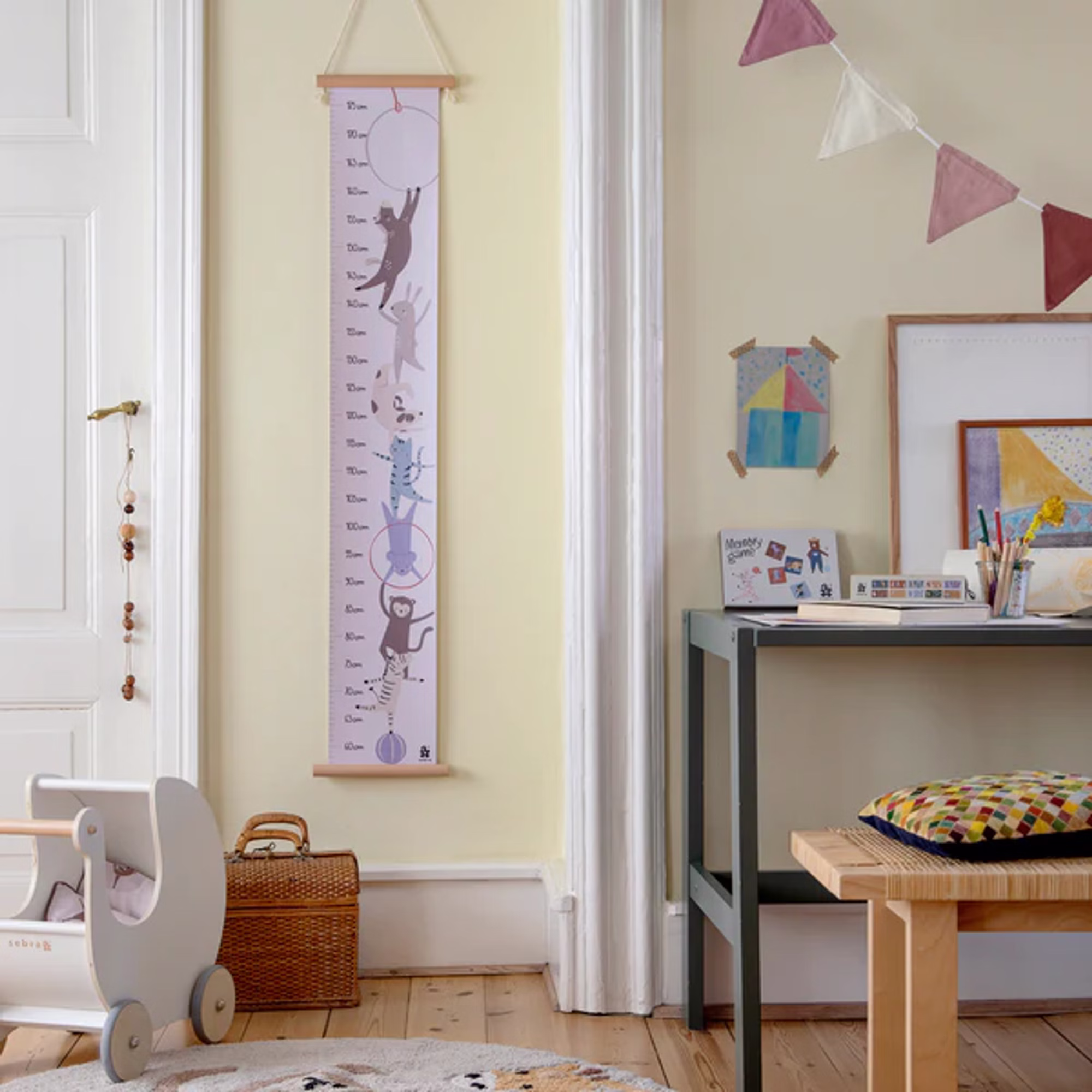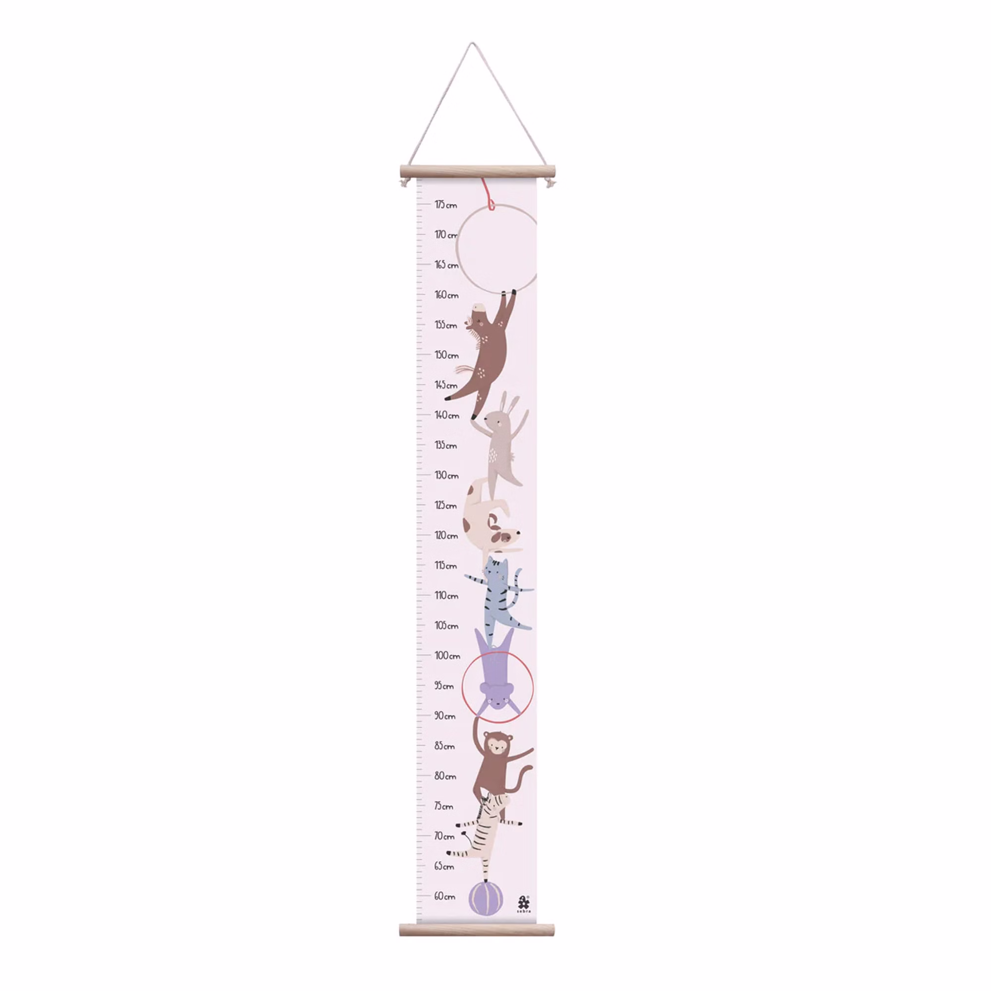 Der 125 cm lange Höhenmesser ist mit witzigen Tieren und Utensilien aus dem Zirkus verziert. Er wird zwischen zwei Holzhalterungen montiert und benötigt zum Aufhängen lediglich einen kleinen Nagel oder eine Schraube.
