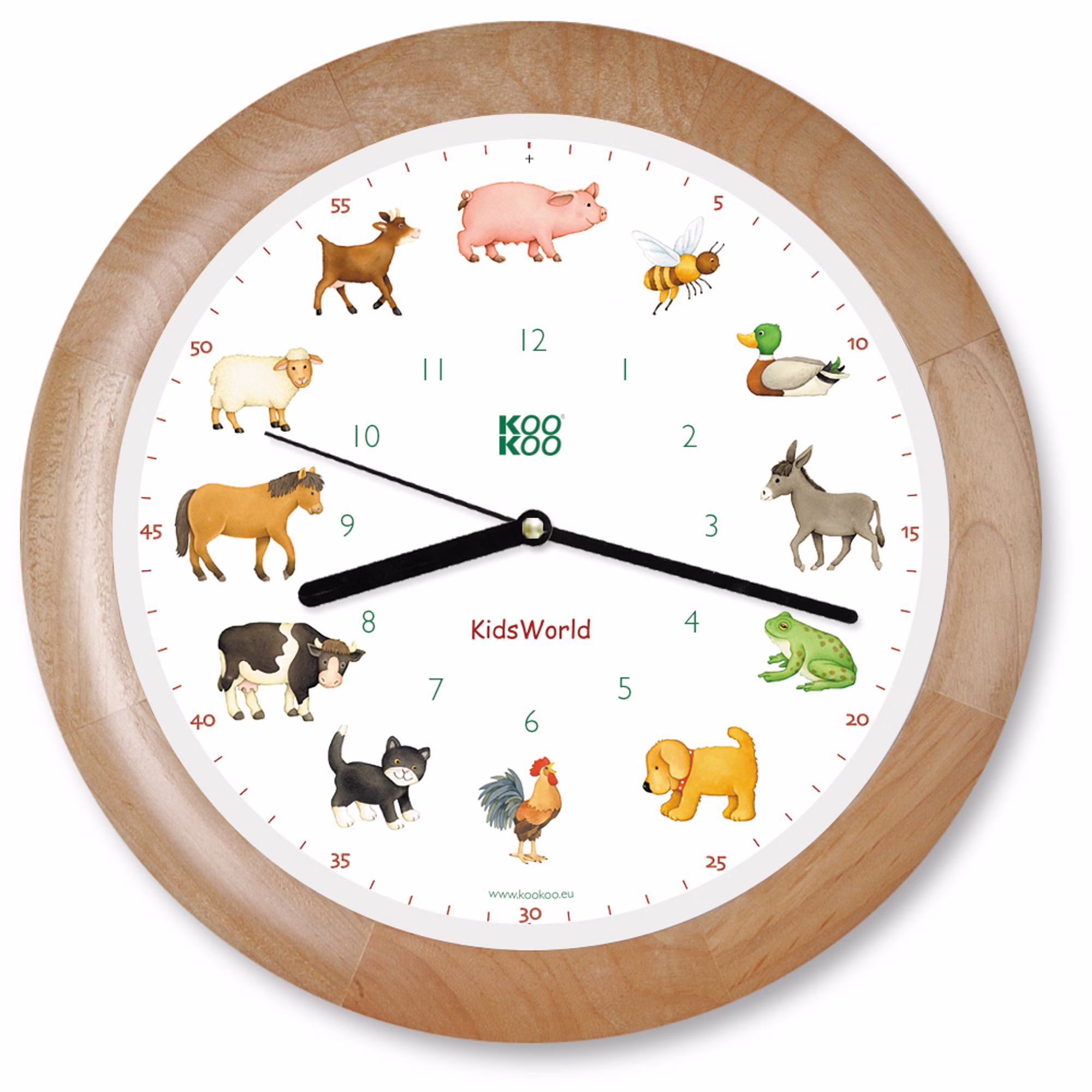 Das Landleben kommt ins Kinderzimmer: zu jeder vollen Stunde lässt ein Bauernhoftier seine Stimme hören. Das Kätzchen miaut um 7 Uhr, zur Mittagszeit grunzt das Schwein und der kleine Hund erinnert bellend um 16 Uhr an seinen Nachmittagsspaziergang!