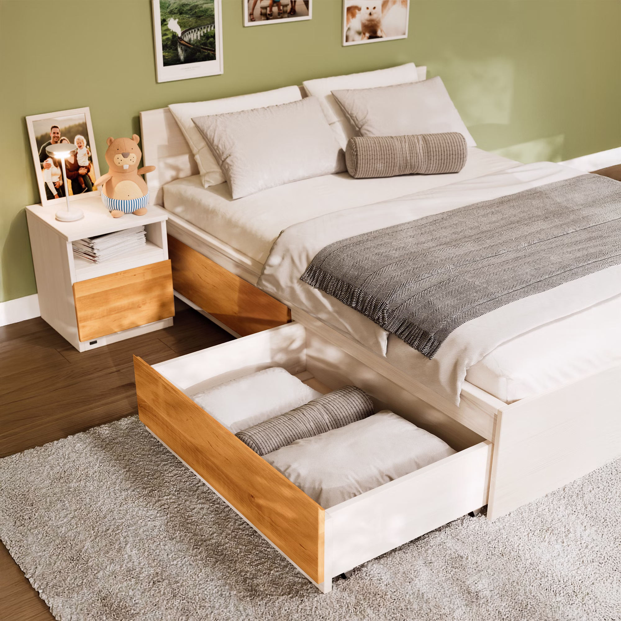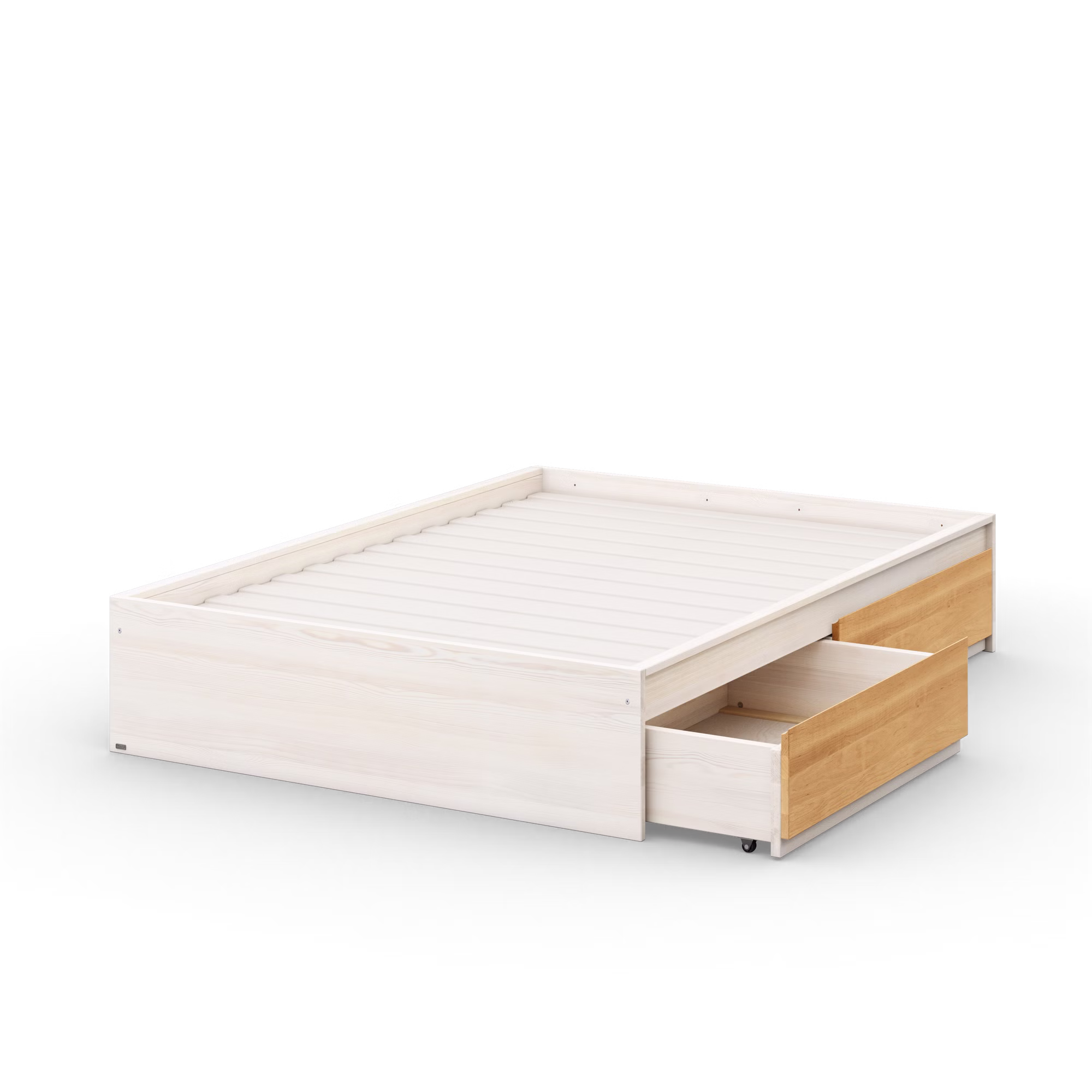 Das Finn Bett kann mit bis zu vier Bettkästen erweitert werden – für noch mehr praktischen Stauraum unter dem Bett.