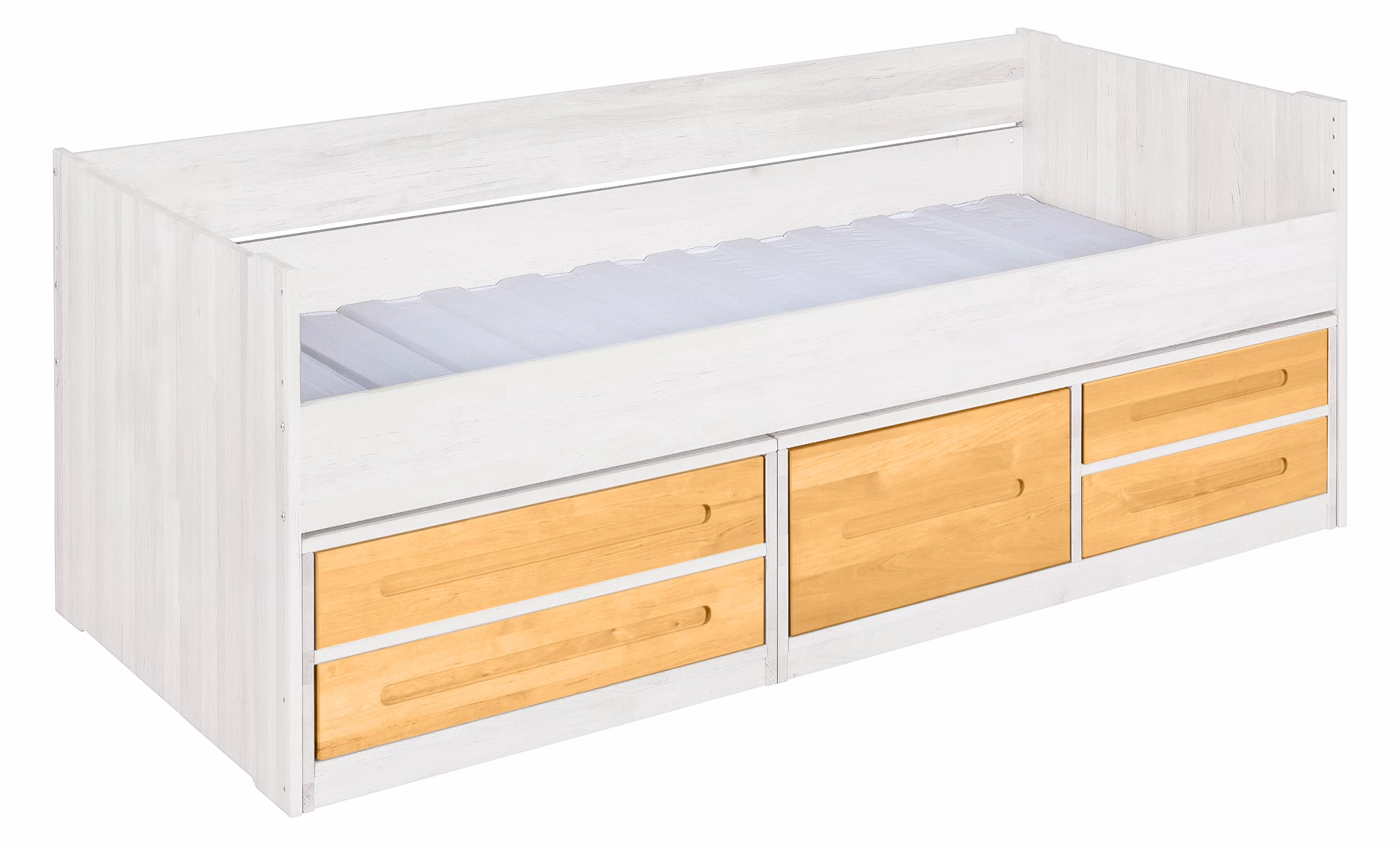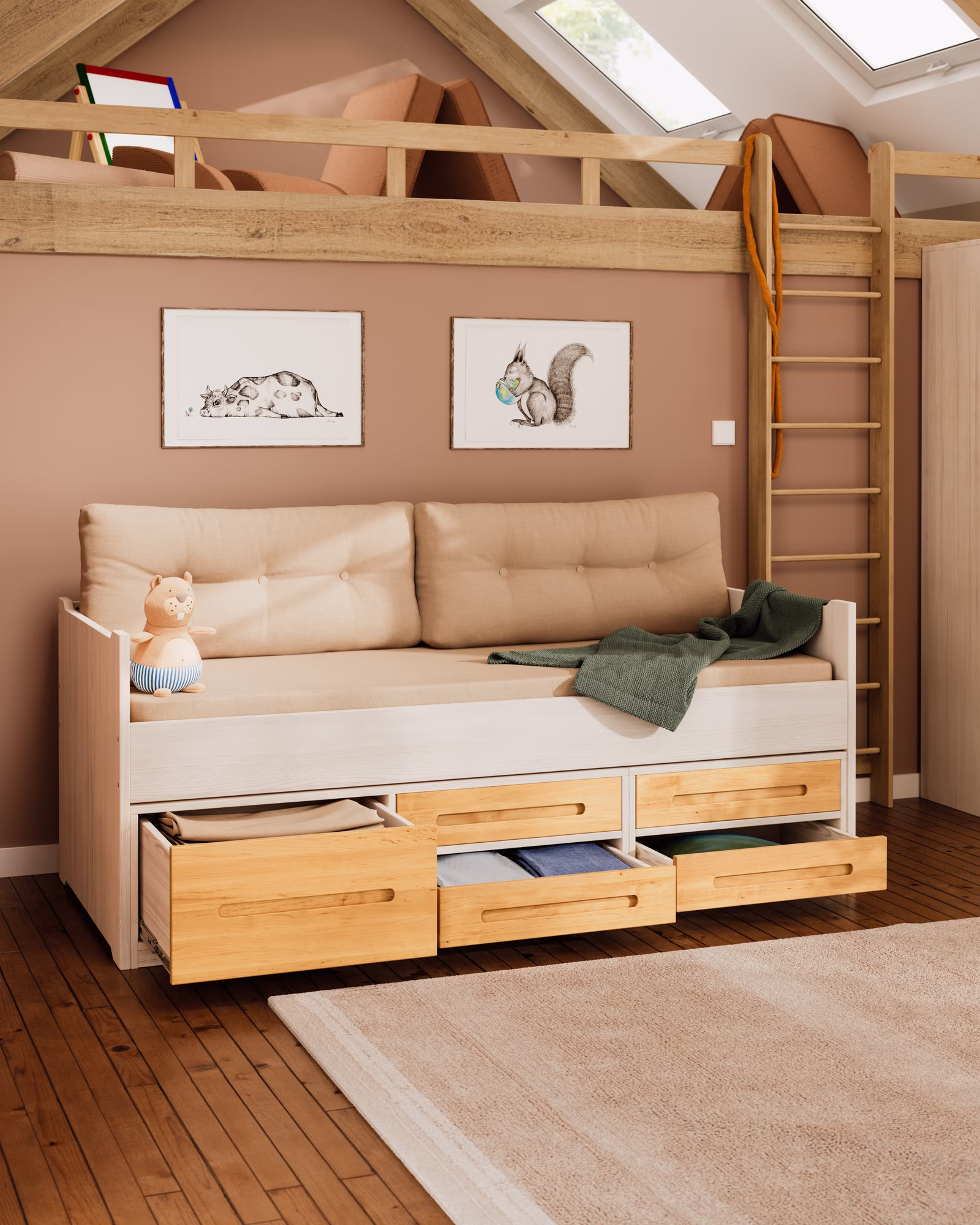Unser beliebtes Lina Kojenbett wird aus Bio-Massivholz gefertigt und sorgt dank der geräumigen Bettkommoden für mehr Ordnung im Kinder- und Jugendzimmer!