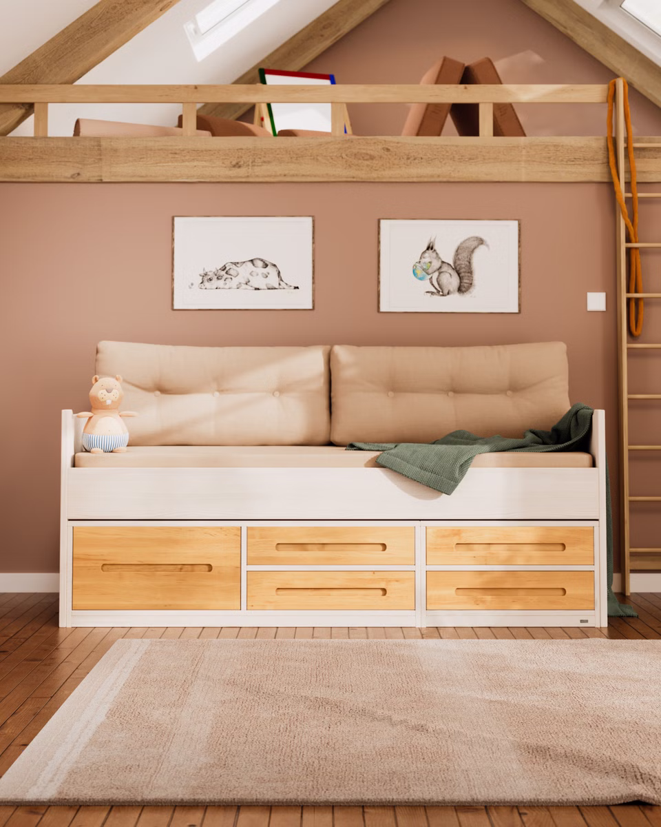 Unser beliebtes Lina Kojenbett wird aus Bio-Massivholz gefertigt und sorgt dank der geräumigen Bettkommoden für mehr Ordnung im Kinder- und Jugendzimmer!