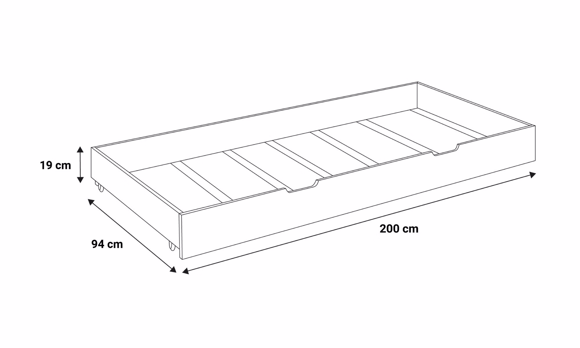 Die Liegefläche im Bettkasten beträgt 90 x 194 cm. Passend hierzu finden Sie auch eine Matratze in unserem Sortiment. (passende Matratze: 90 x 192 x 12 cm)
