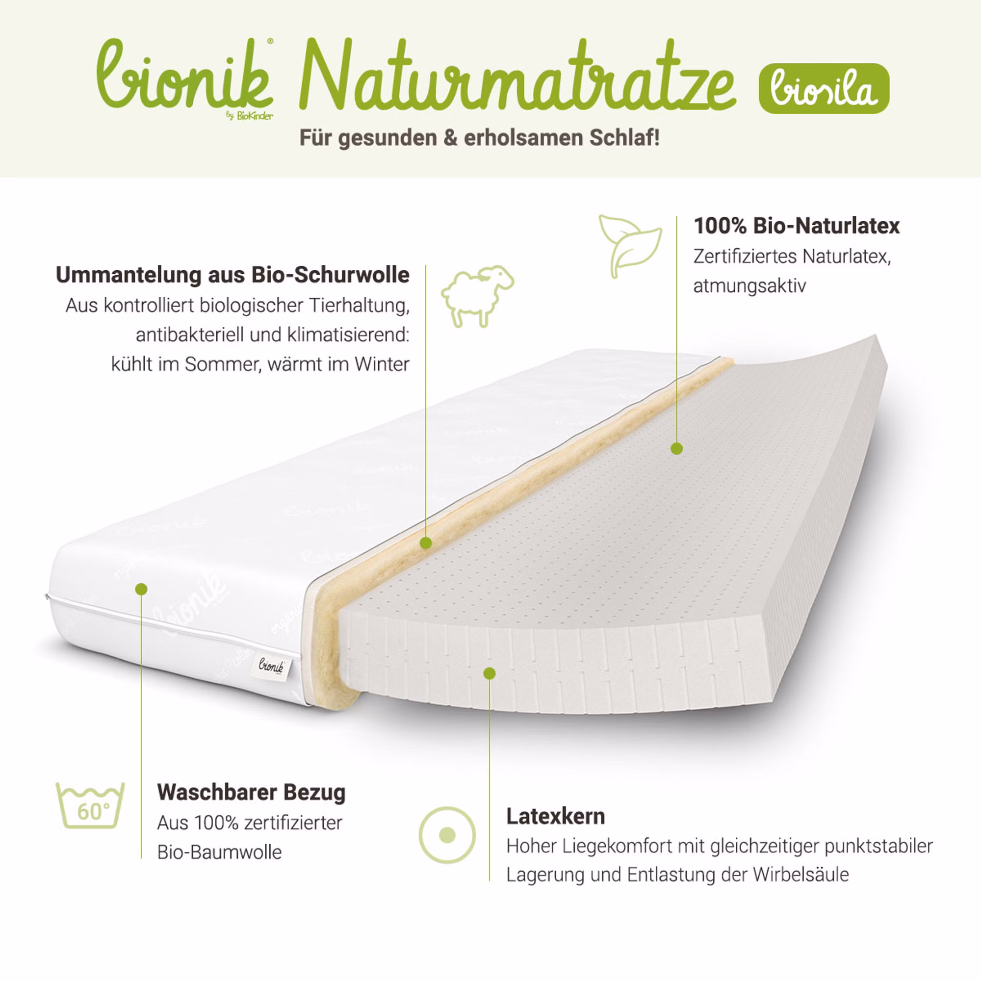 Die bionik Biosila Kindermatratze ist eine Latexmatratze mit einem 10 cm hohen Kern aus reinem Naturlatex. Latex bietet hohen Liegekomfort mit gleichzeitiger punktstabiler Lagerung und Entlastung der Wirbelsäule.  Der Latexkern für diese Matratze wird am Stück gefertigt und als Ganzes verarbeitet.
