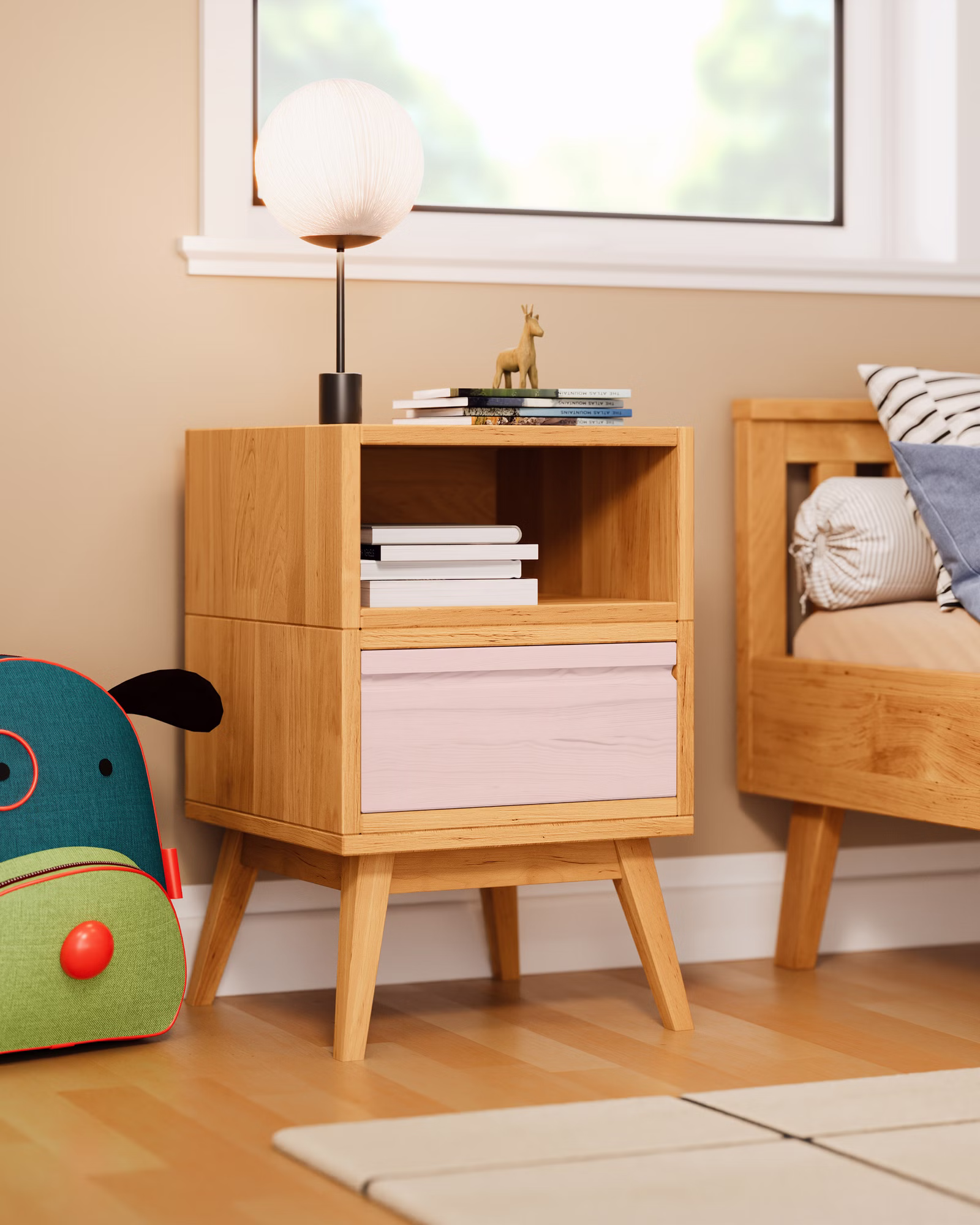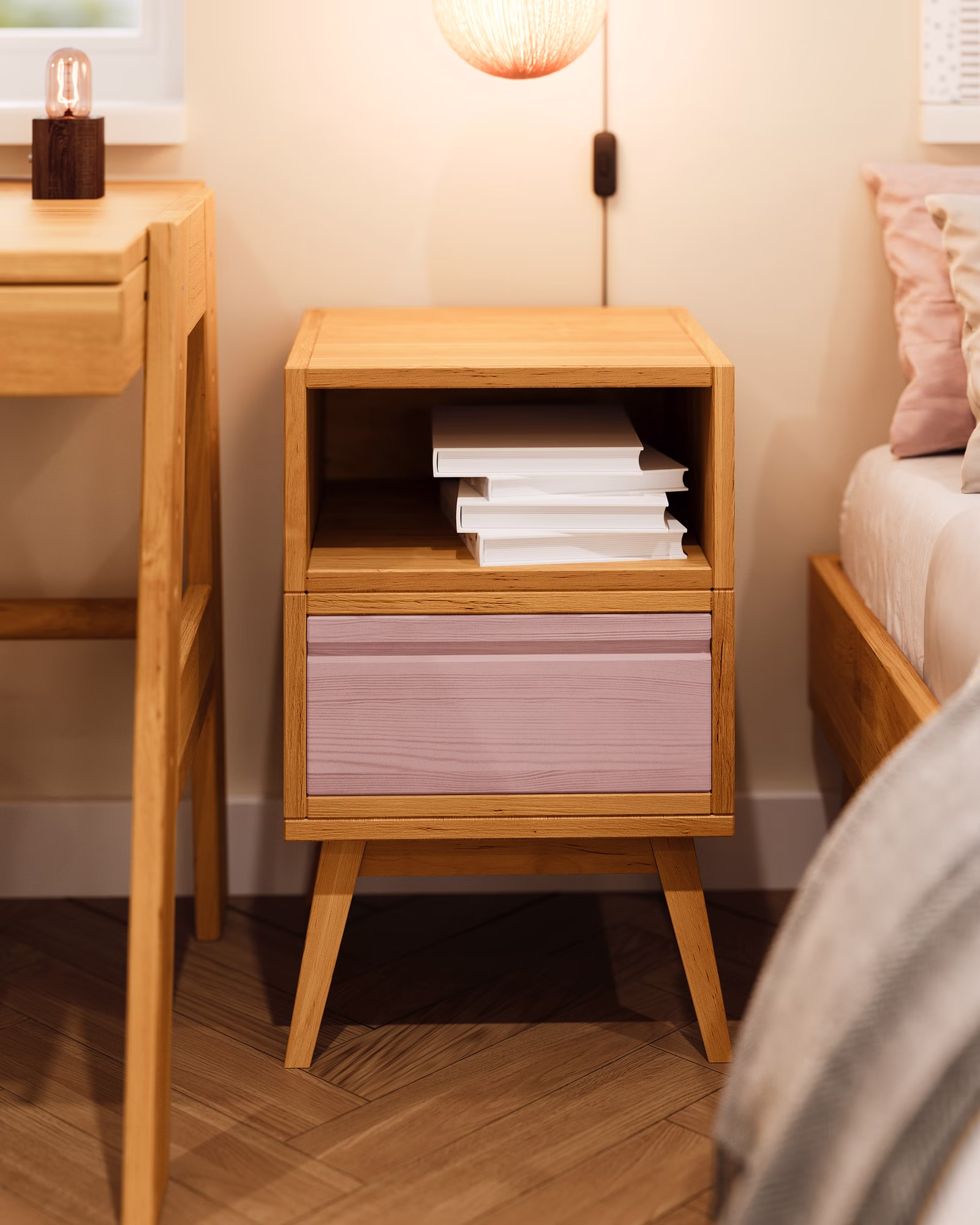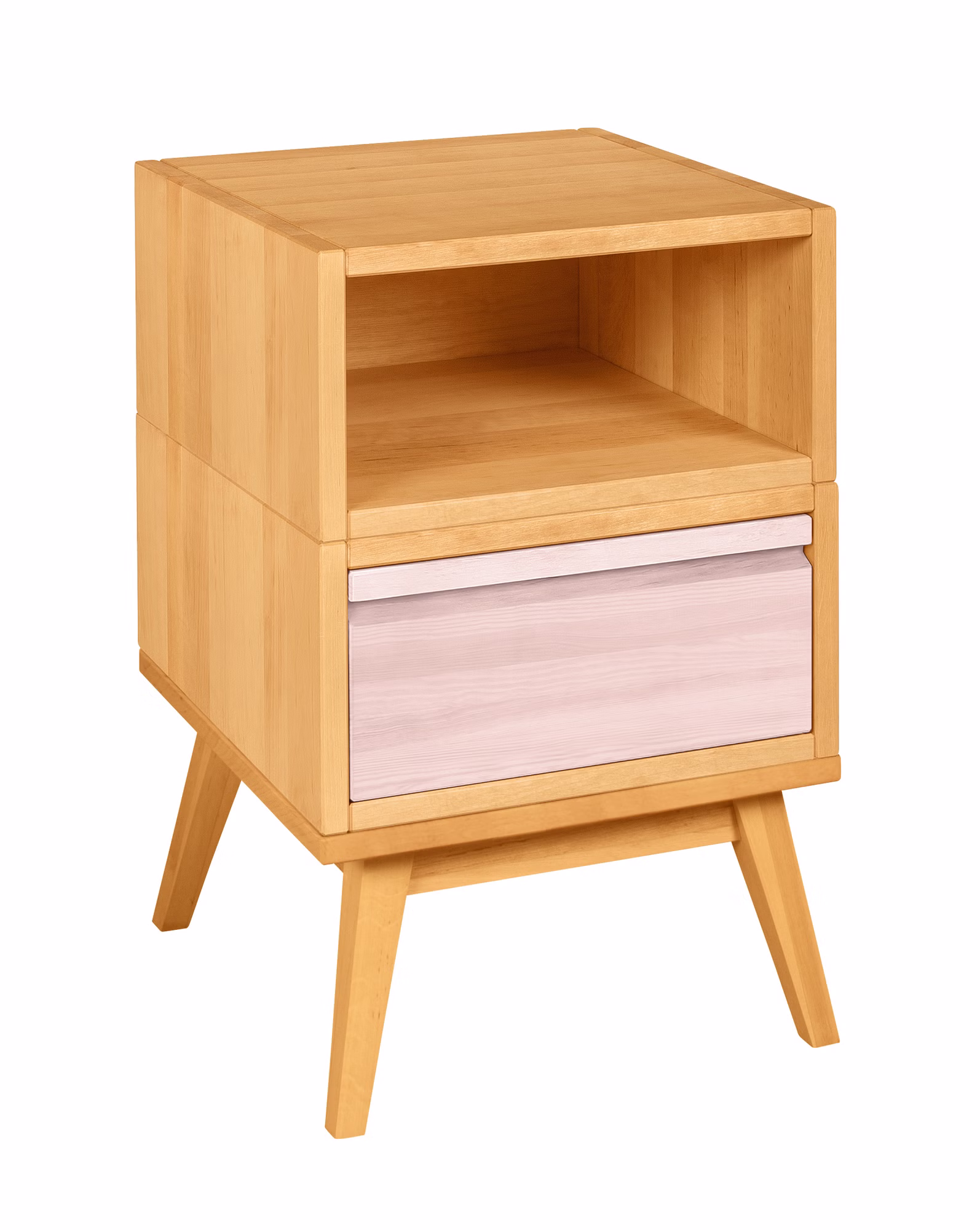 Unser Laura Retro Nachttisch wird aus Bio-Massivholz gefertigt und lässt sich vielseitig einsetzen. Die Kombination aus offenen und geschlossenen Laura Regalwürfeln und dem elegant niedrigen Retrosockel versprüht einen nostalgischen Charme und wirkt gleichzeitig modern und zeitlos. So fügt sich der Nachttisch harmonisch in jedes Zimmer ein und passt zu jedem Einrichtungsstil.